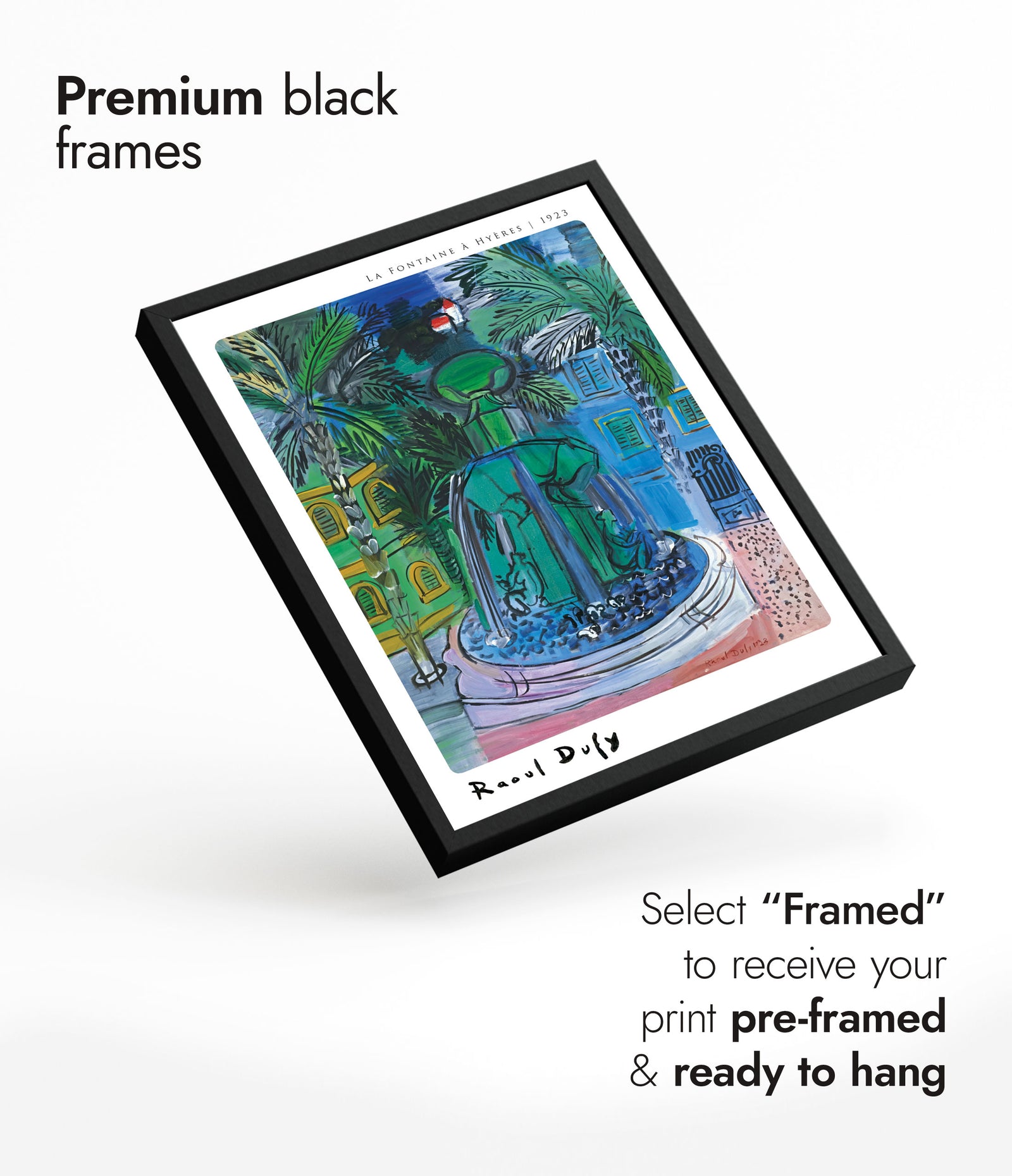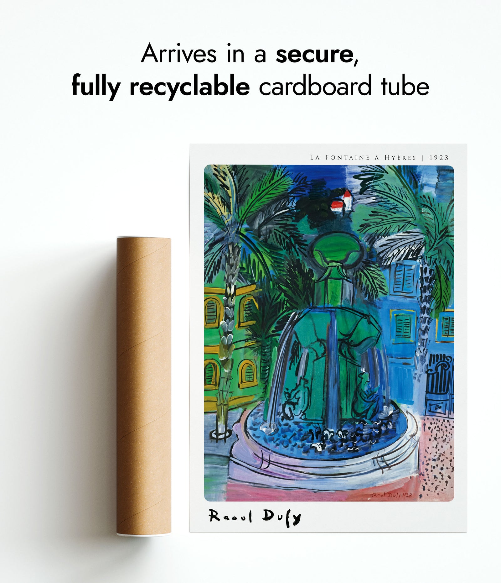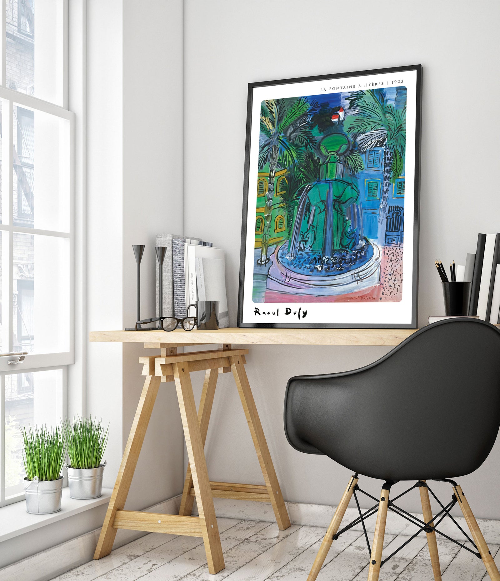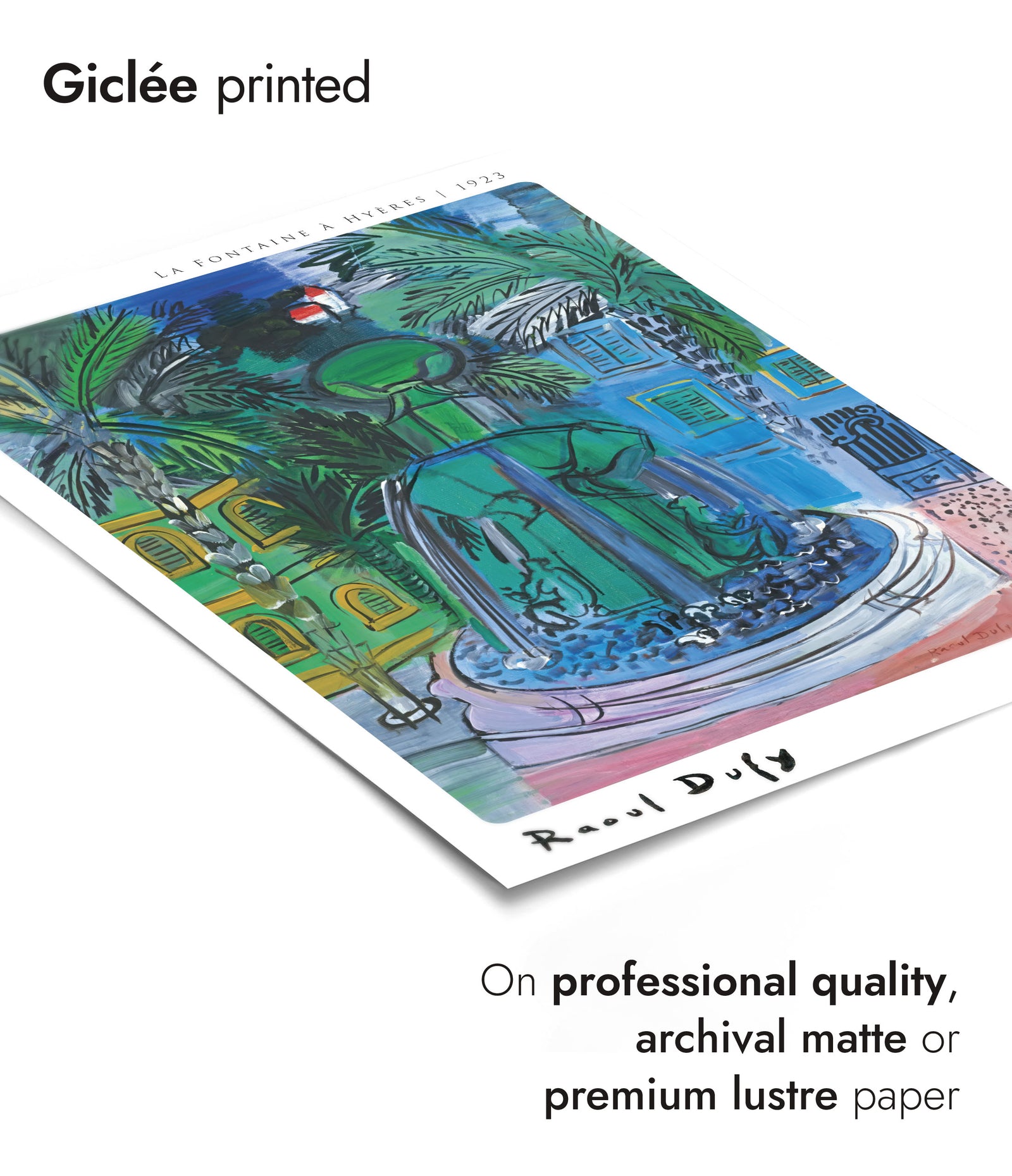 "La Fontaine à Hyères" by Raoul Dufy is a vibrant Fauvist artwork available as a poster, depicting a lively fountain surrounded by palm trees in a colourful Mediterranean square. Rendered in bold watercolours, the piece captures the essence of a charming French cityscape with its vibrant hues and dynamic composition. Perfect for adding a touch of European flair to any space.