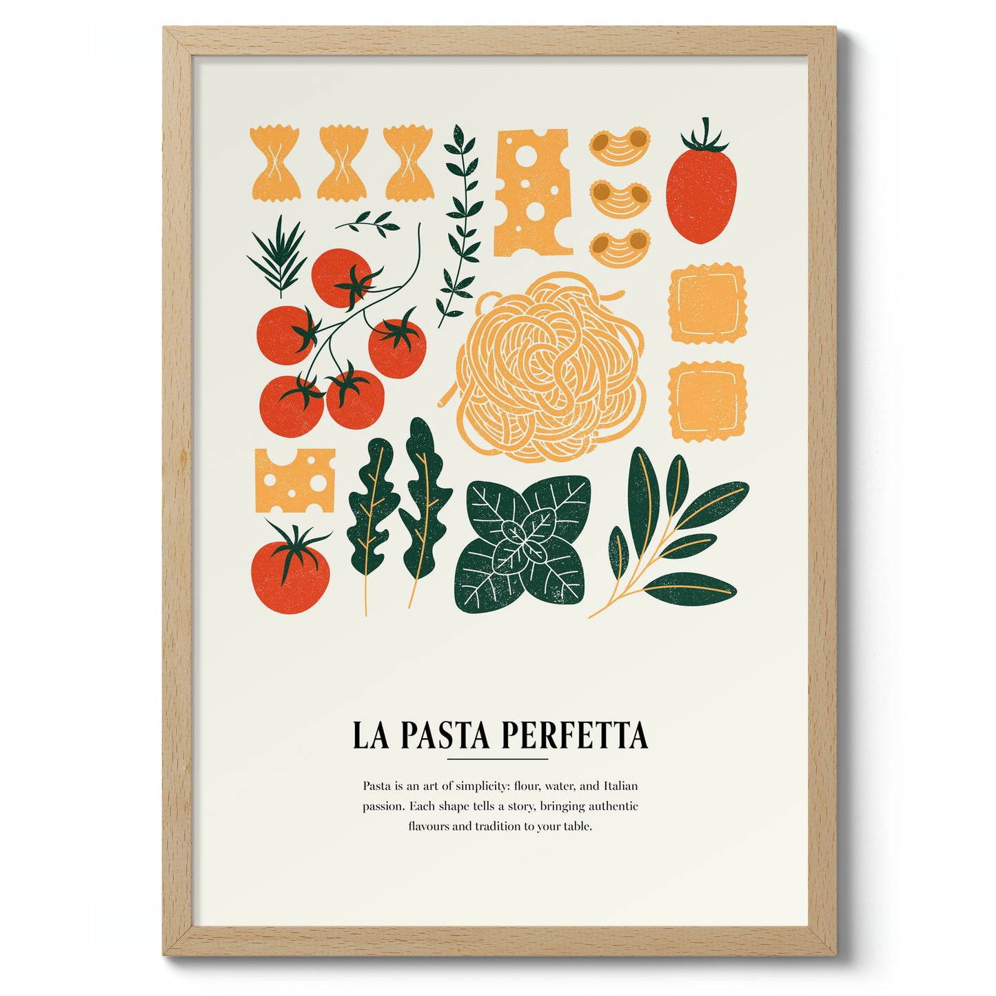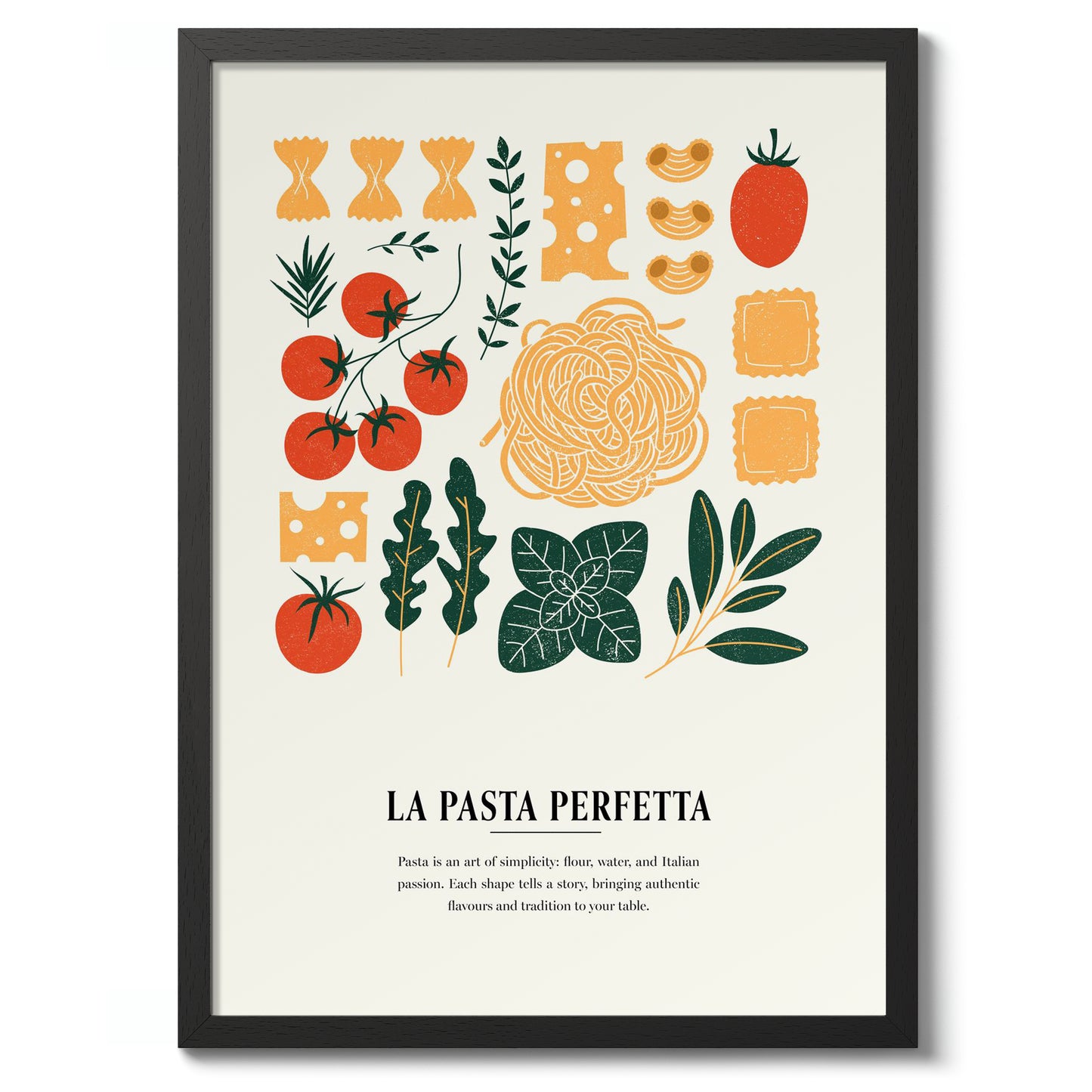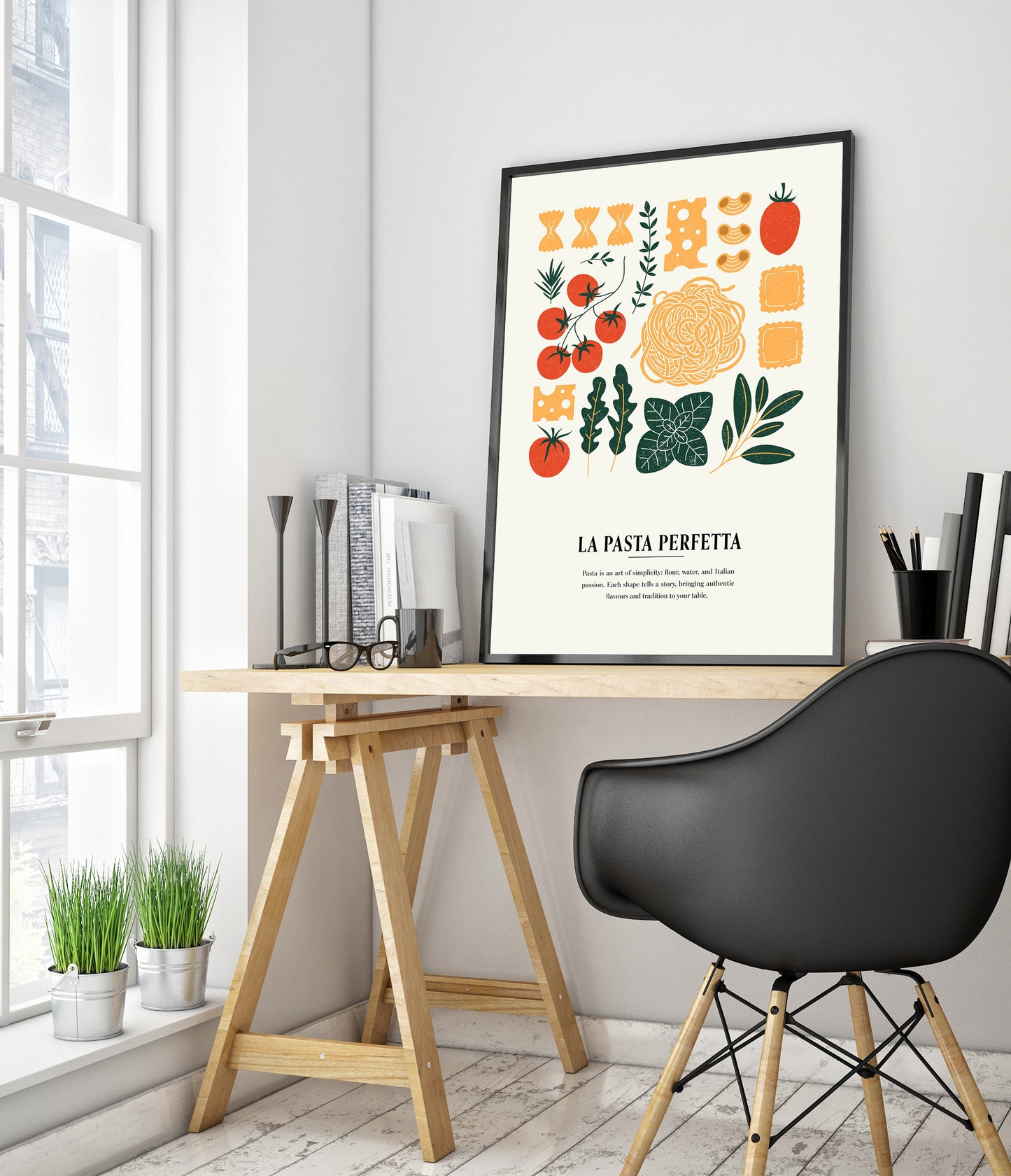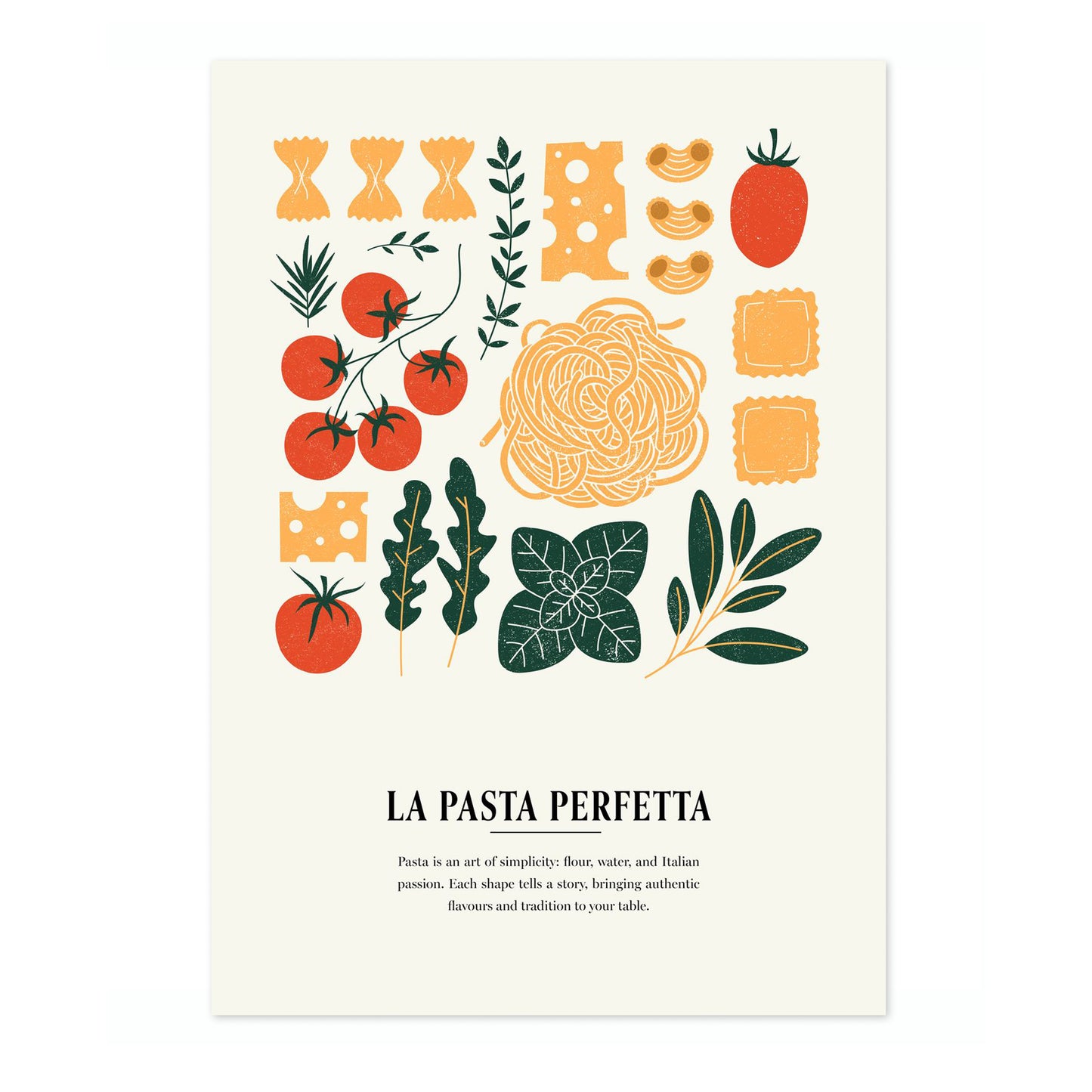 This "La Pasta Perfetta" poster captures the essence of Italian cuisine with a modern graphic collage featuring iconic pasta shapes and fresh ingredients. Vibrant tomatoes, aromatic herbs, and various pastas are artfully arranged on a beige background, evoking a sense of culinary tradition. Ideal for kitchen decor, this multicoloured illustration celebrates the simple elegance of authentic Italian food.