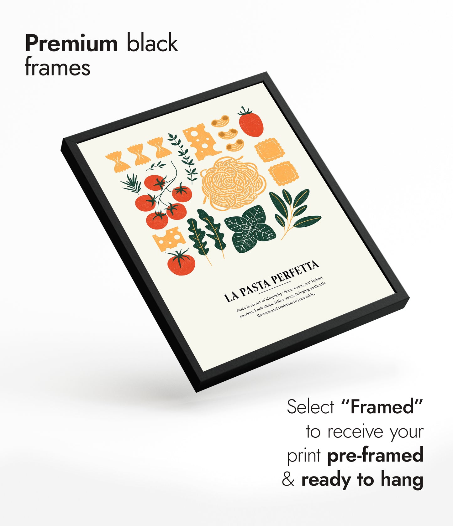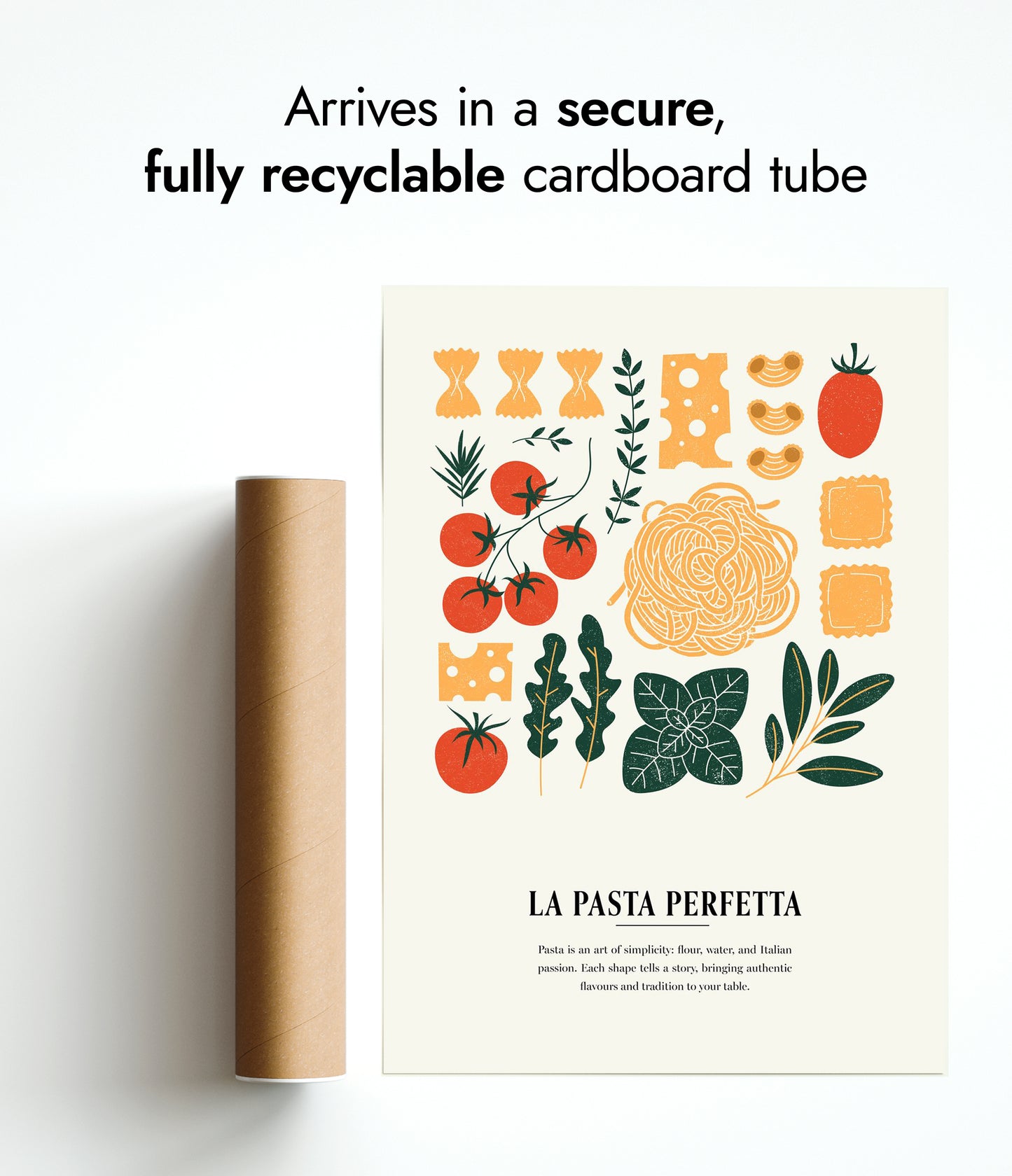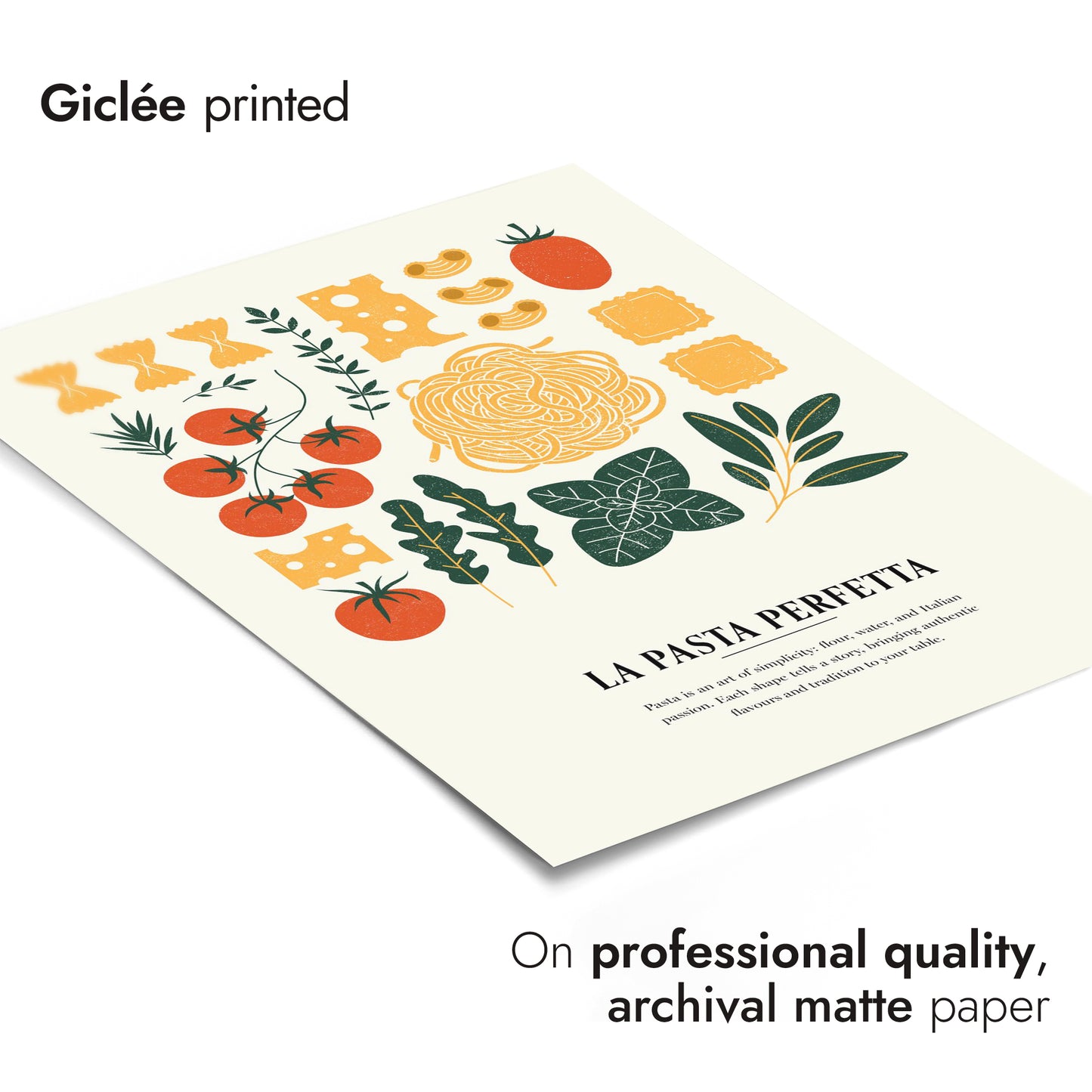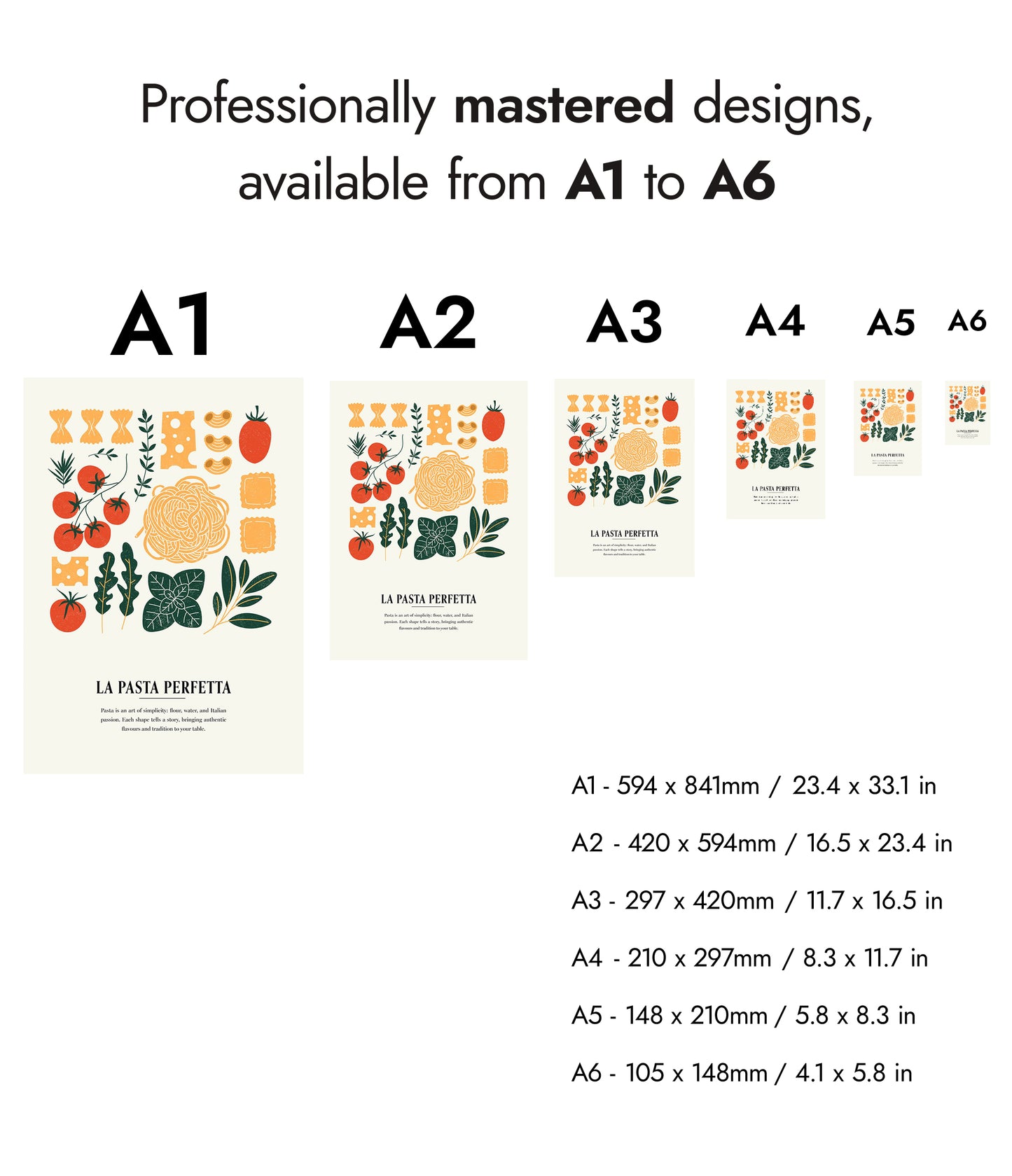 This "La Pasta Perfetta" poster captures the essence of Italian cuisine with a modern graphic collage featuring iconic pasta shapes and fresh ingredients. Vibrant tomatoes, aromatic herbs, and various pastas are artfully arranged on a beige background, evoking a sense of culinary tradition. Ideal for kitchen decor, this multicoloured illustration celebrates the simple elegance of authentic Italian food.