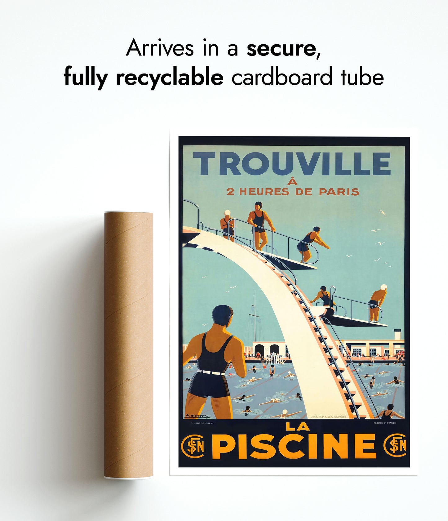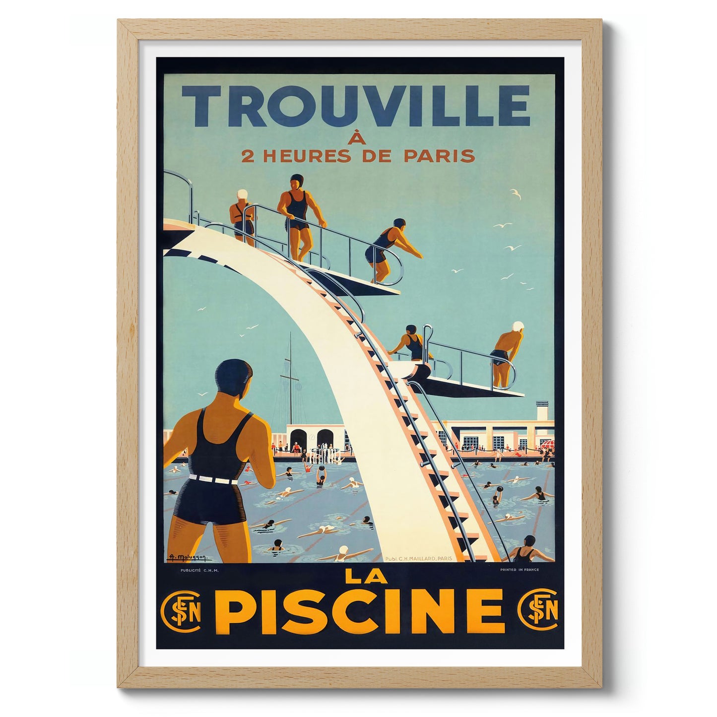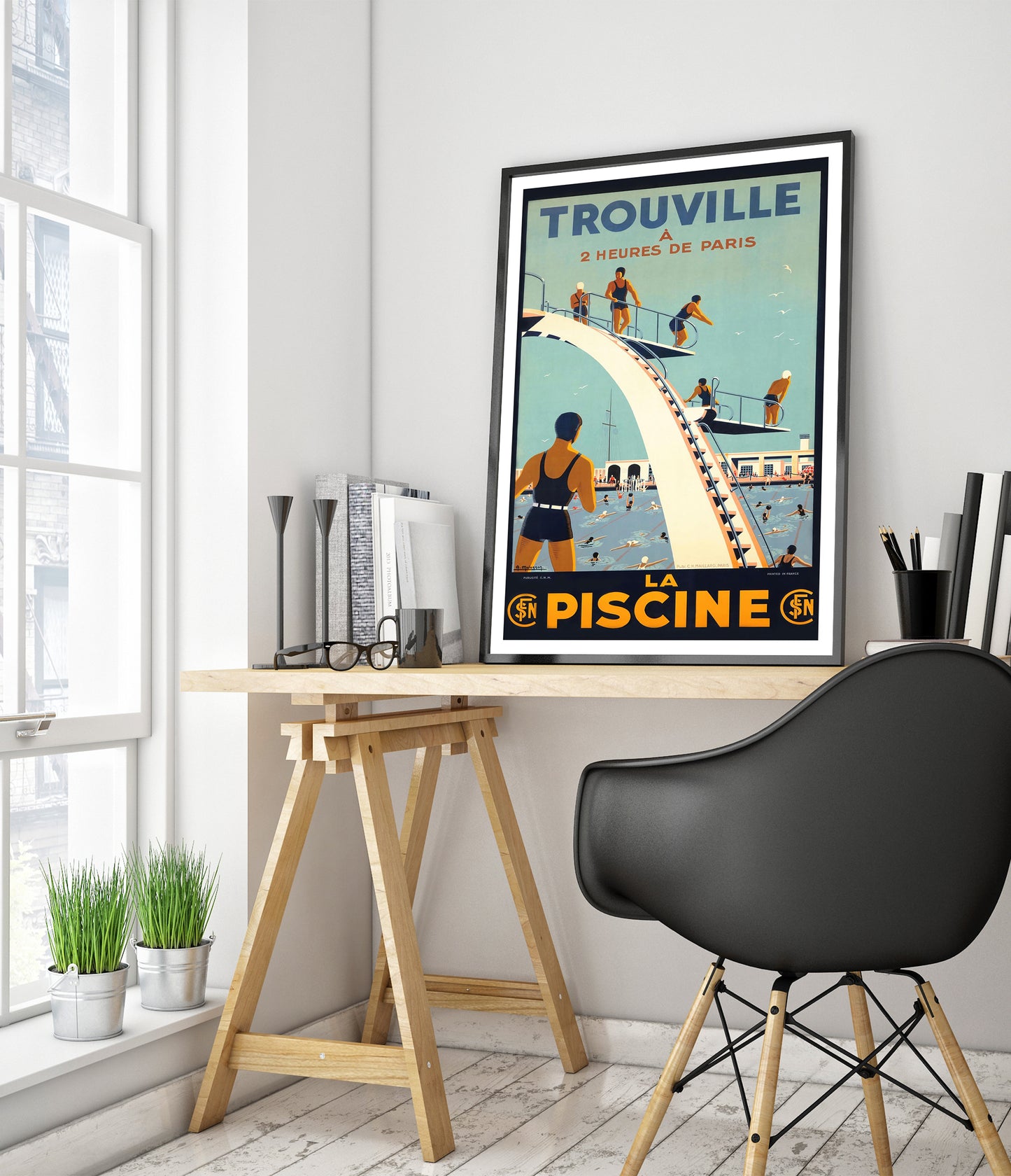 This vintage poster titled "La Piscine" invites viewers to the bustling pool scene of Trouville, just two hours from Paris. Illustrated in a retro style, it features swimmers diving and enjoying the aquatic setting against a soothing blue backdrop. The imagery and design capture the carefree spirit of a French holiday, ideal for those seeking a nostalgic travel poster.