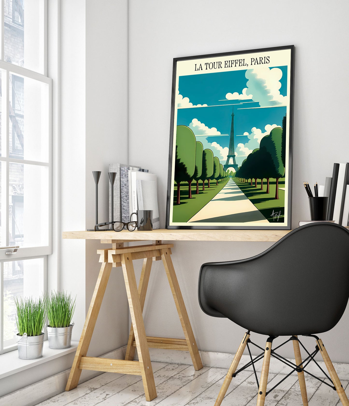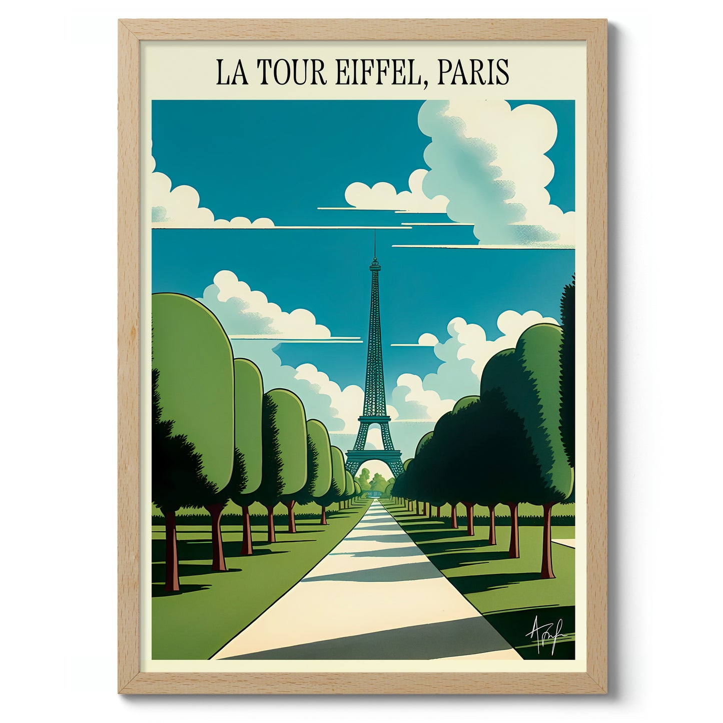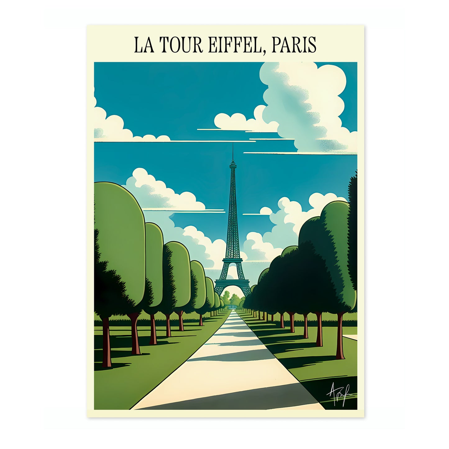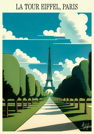 This "La Tour Eiffel, Paris" poster by Alfonso Trufa showcases a vintage illustration of the iconic Eiffel Tower framed by rows of lush trees and a serene pathway. The bold, clear lines and serene clouds create a nostalgic feel of Parisian charm. Ideal for adding a touch of classic French elegance to any space.