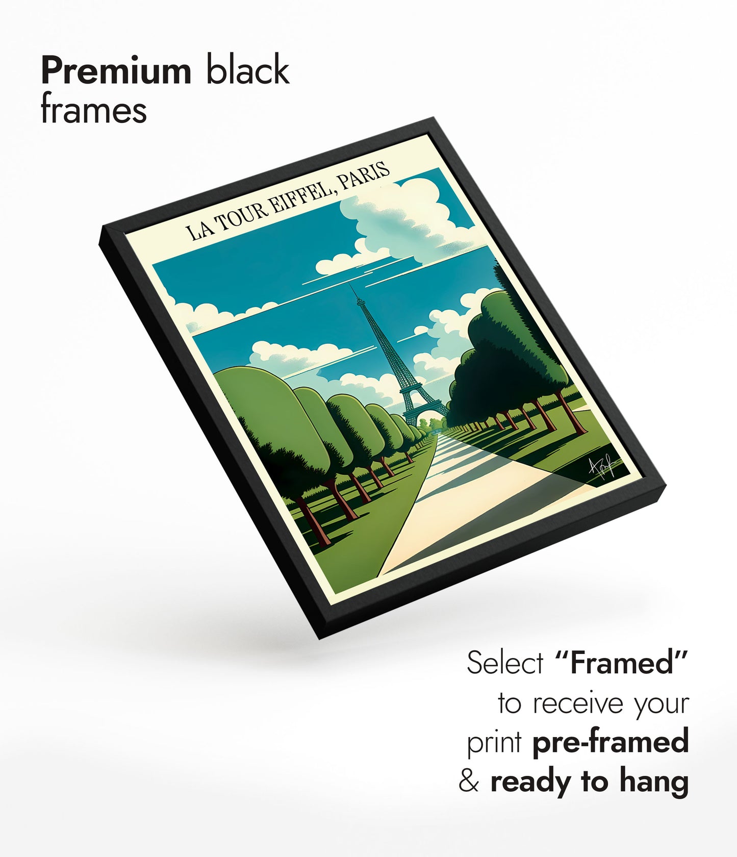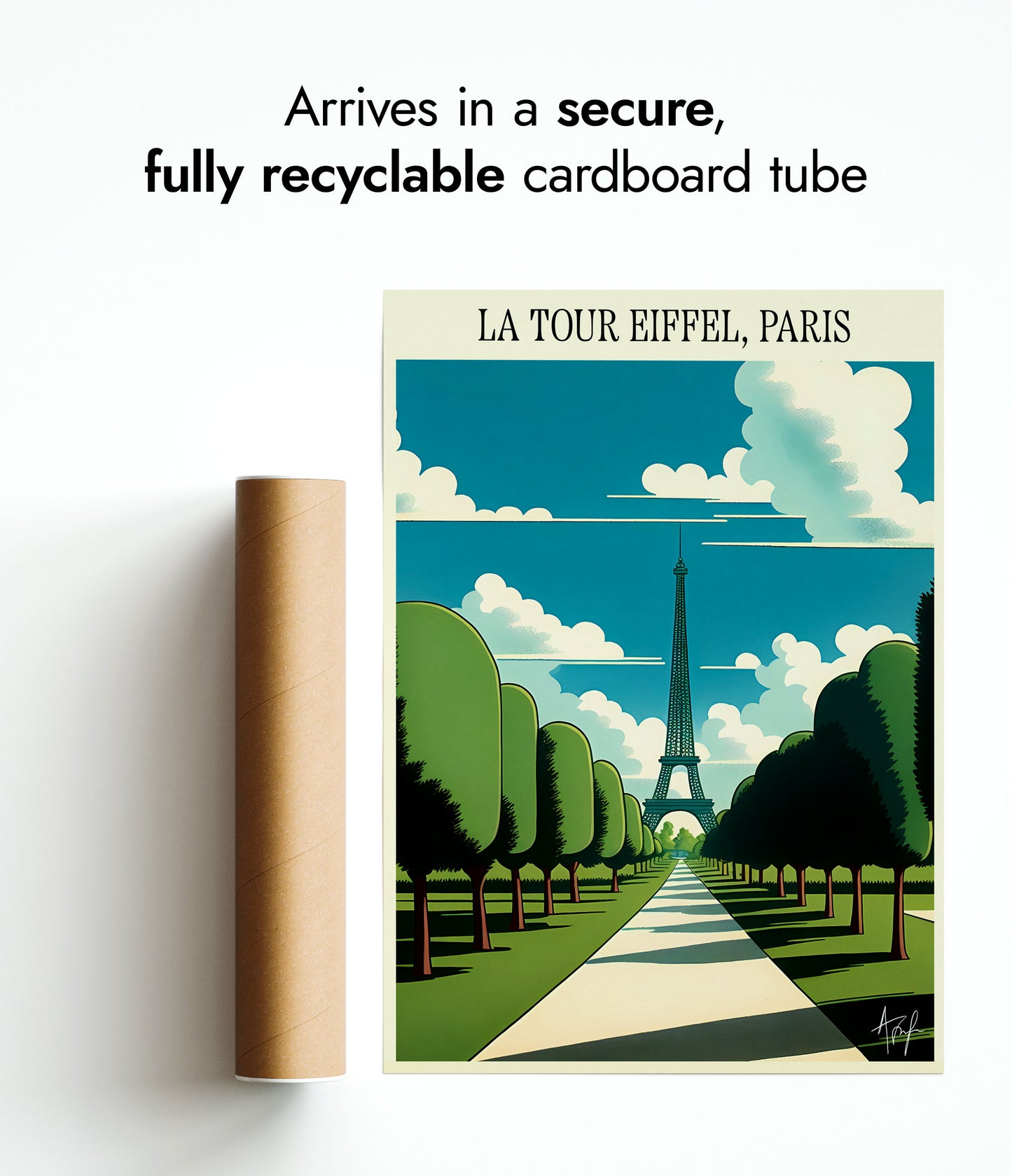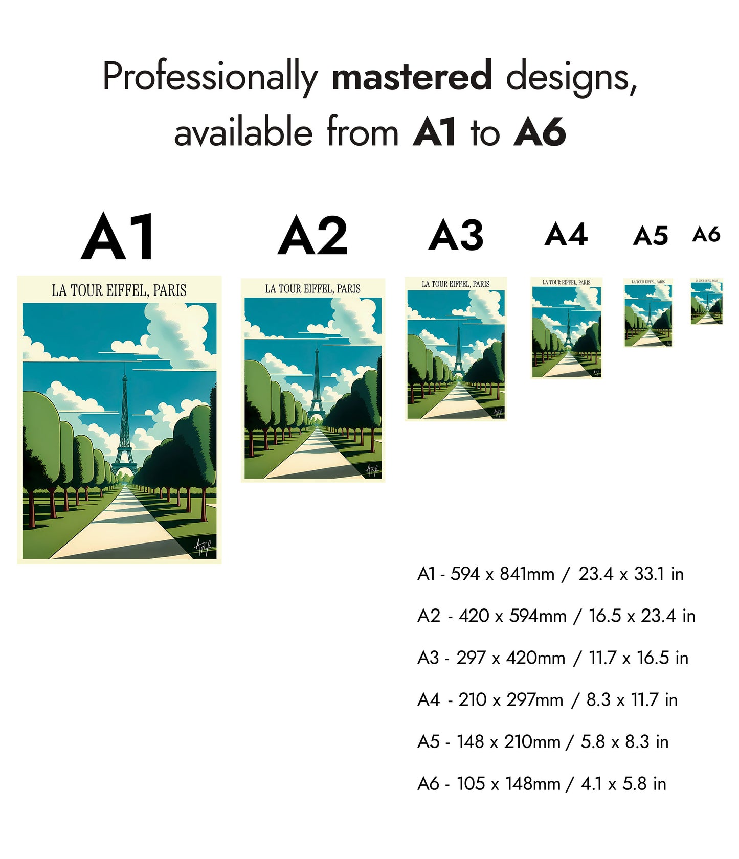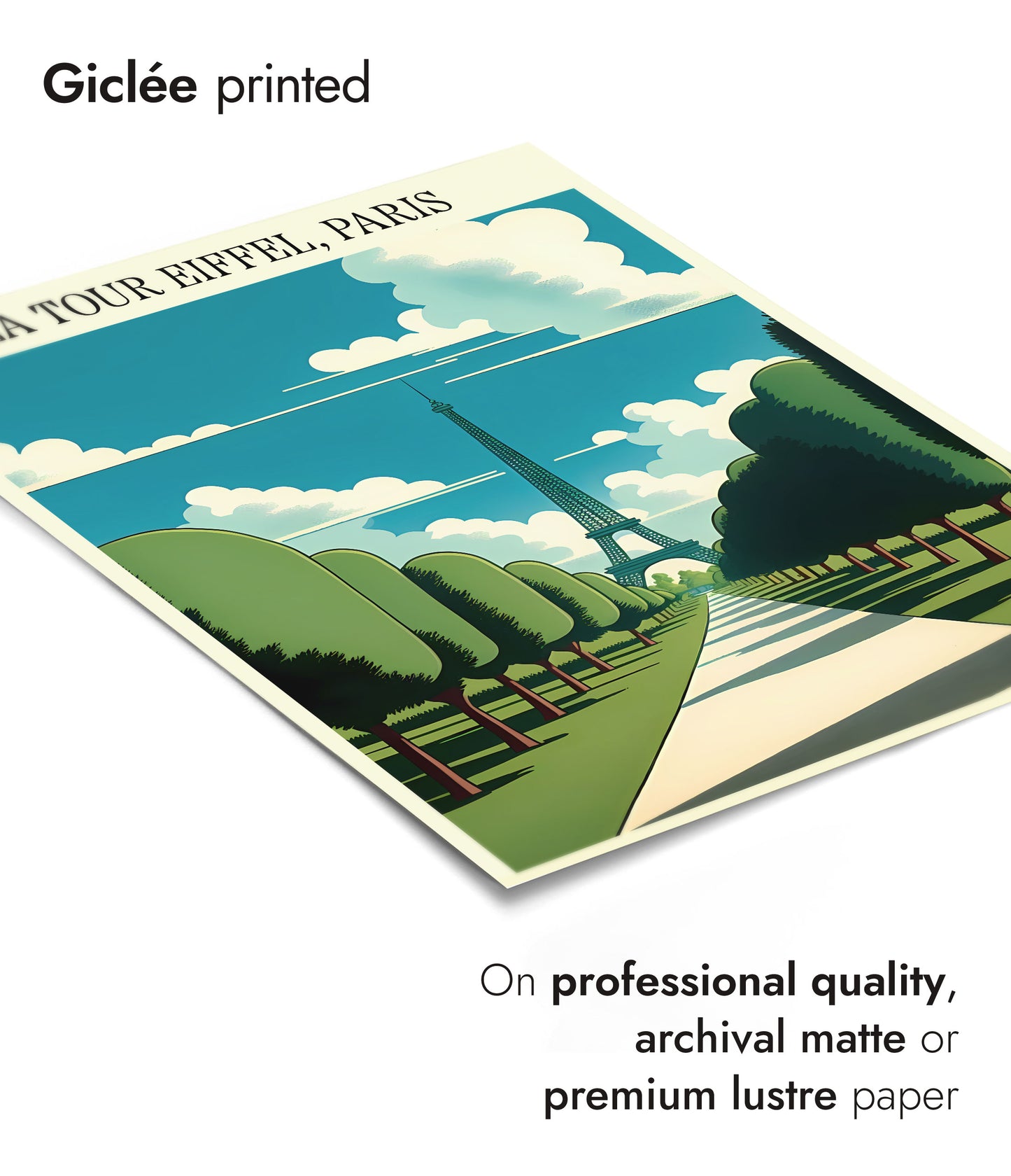 This "La Tour Eiffel, Paris" poster by Alfonso Trufa showcases a vintage illustration of the iconic Eiffel Tower framed by rows of lush trees and a serene pathway. The bold, clear lines and serene clouds create a nostalgic feel of Parisian charm. Ideal for adding a touch of classic French elegance to any space.