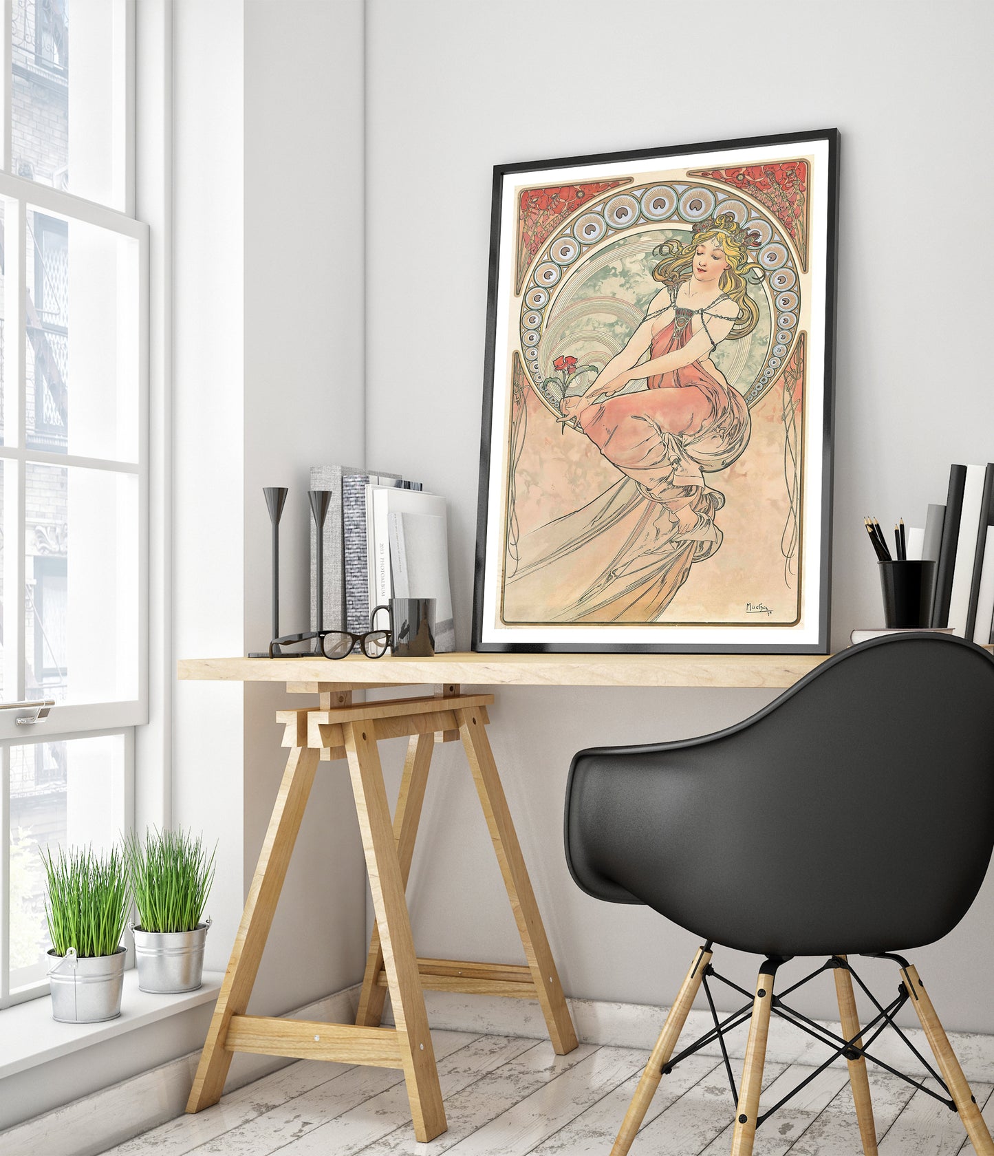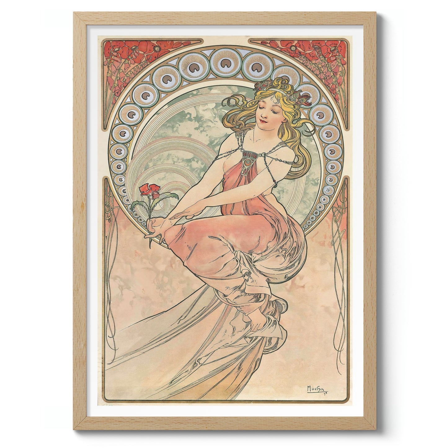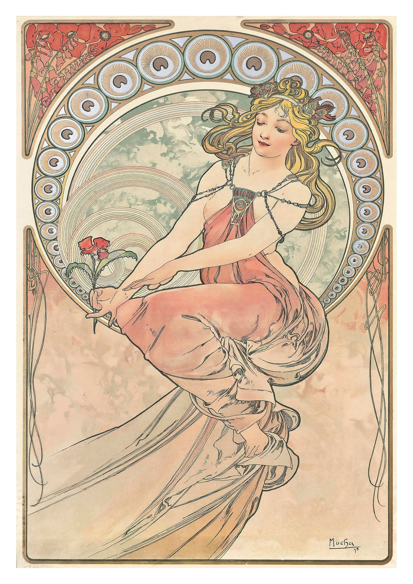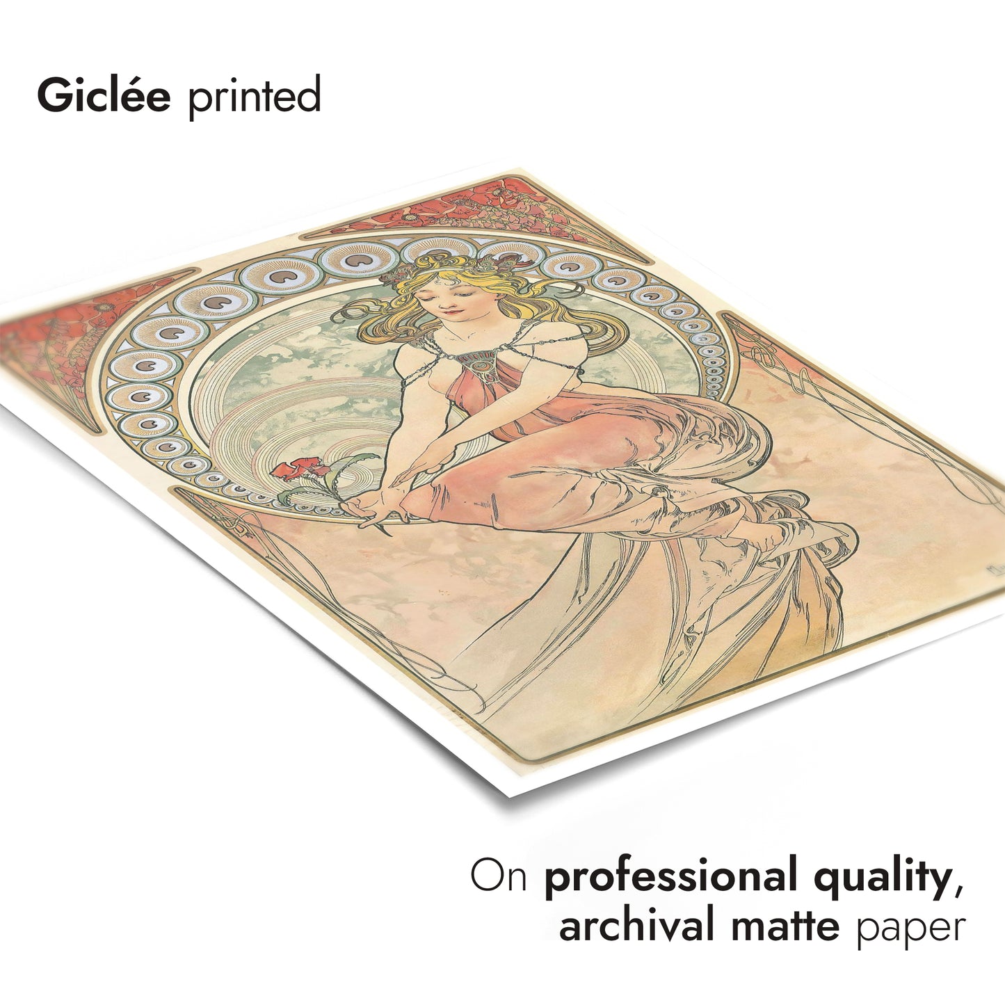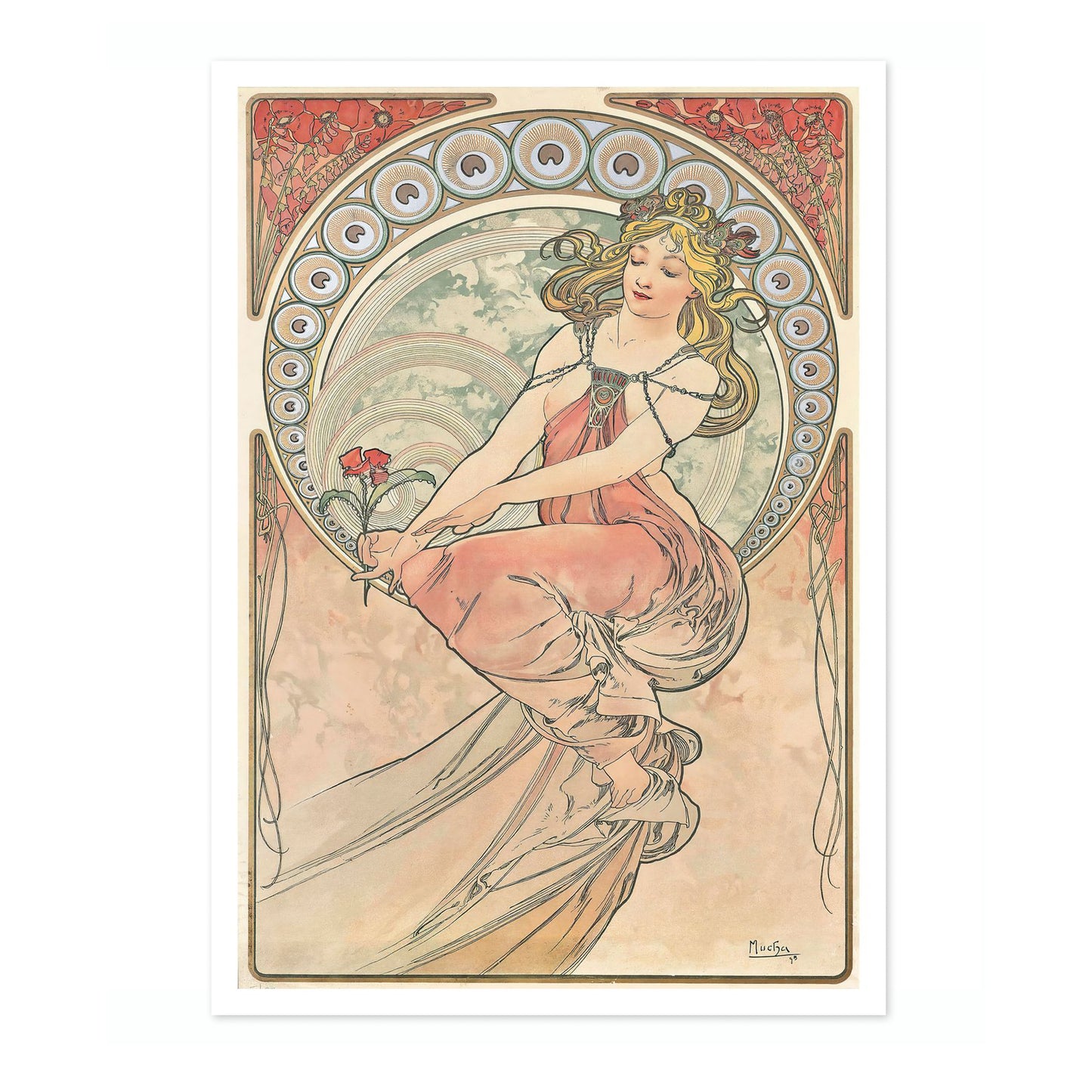 This vintage Art Deco poster by Alphonse Mucha, titled "Lady in Pink," features a serene woman elegantly draped in a flowing pink dress. She holds a delicate flower, surrounded by intricate circular patterns and soft hues of orange and pink. Framed by floral accents and a halo, this illustration captures the essence of graceful femininity and classic artistry. Perfect for enthusiasts of vintage style and Mucha's iconic work.