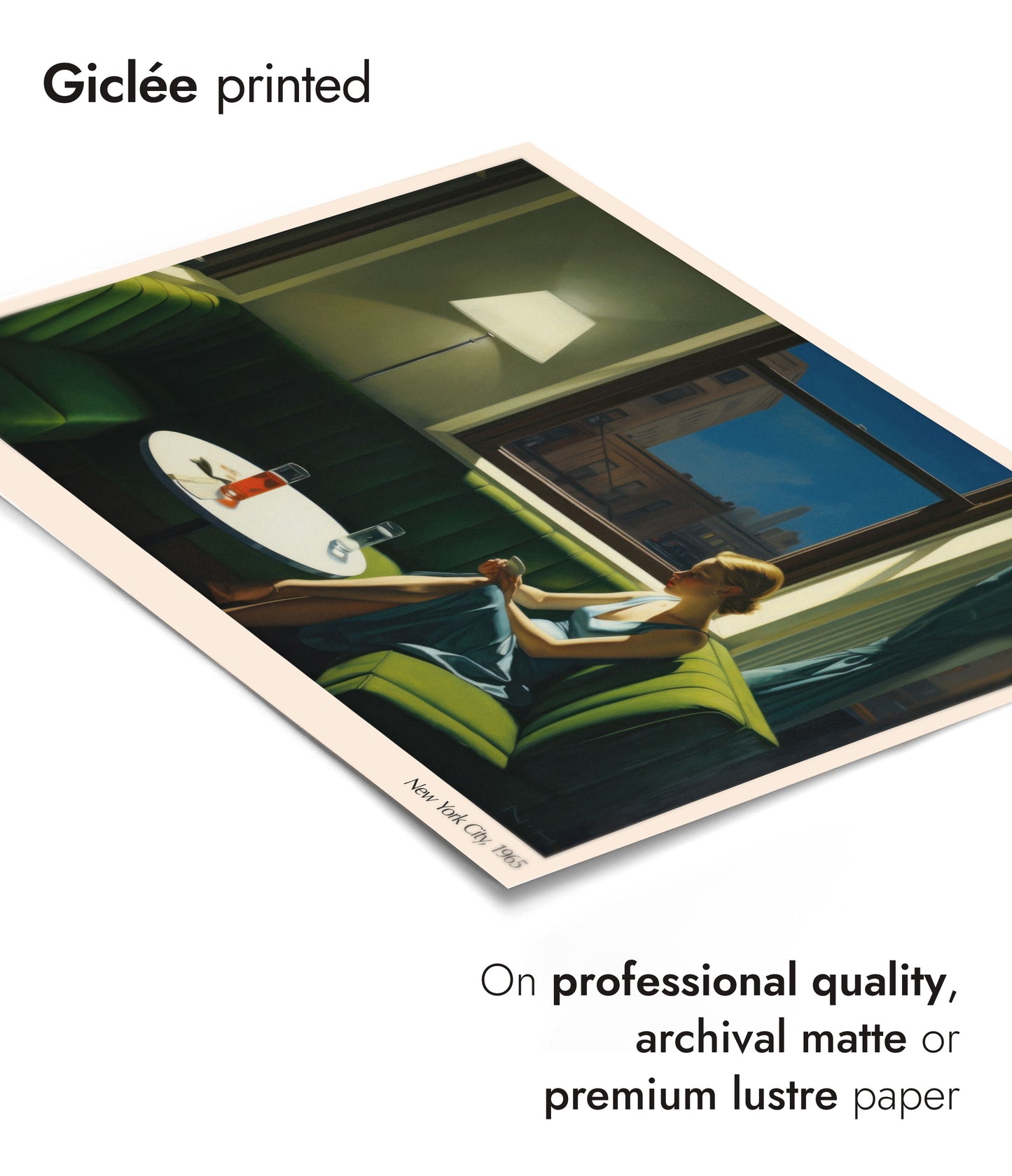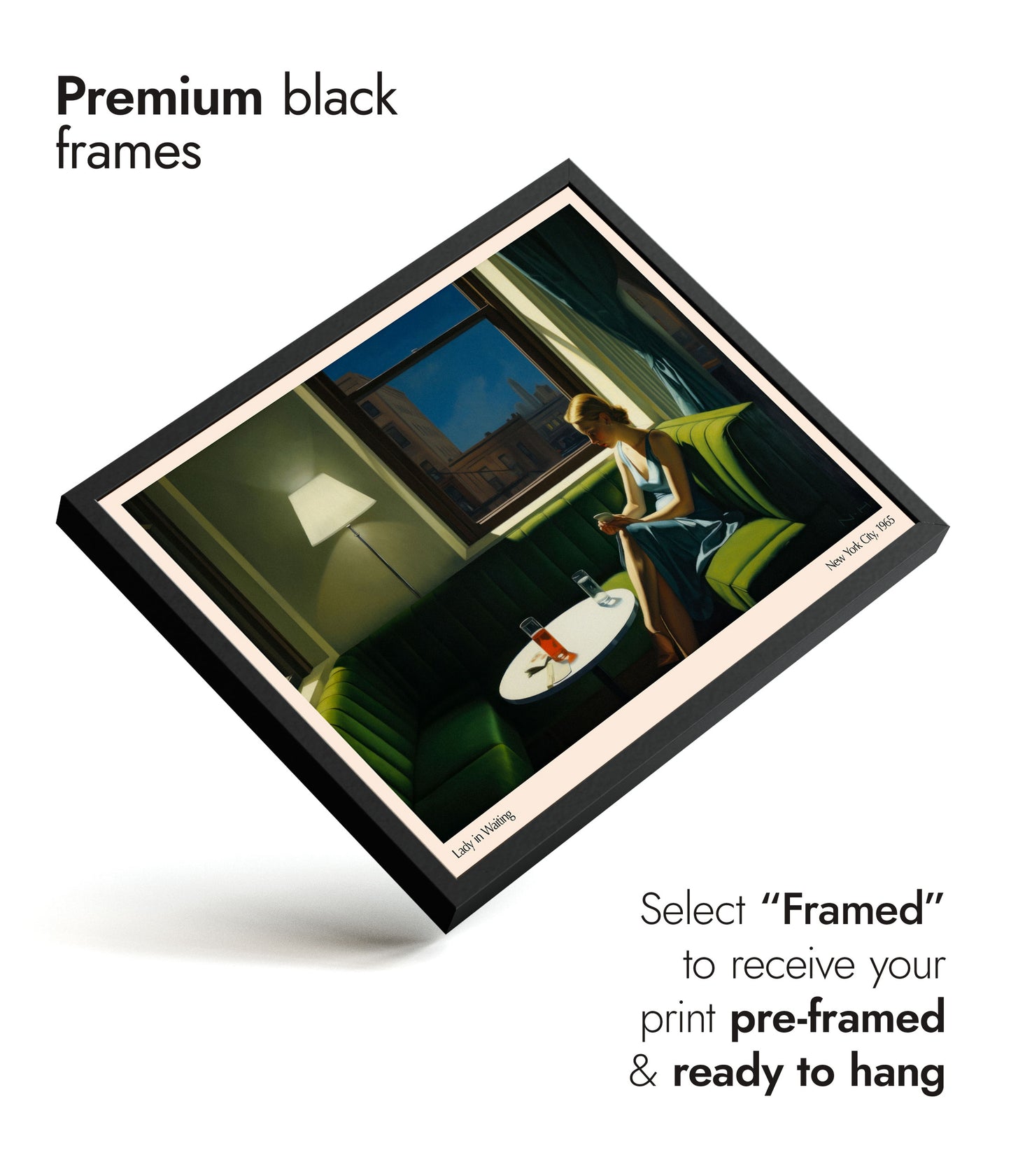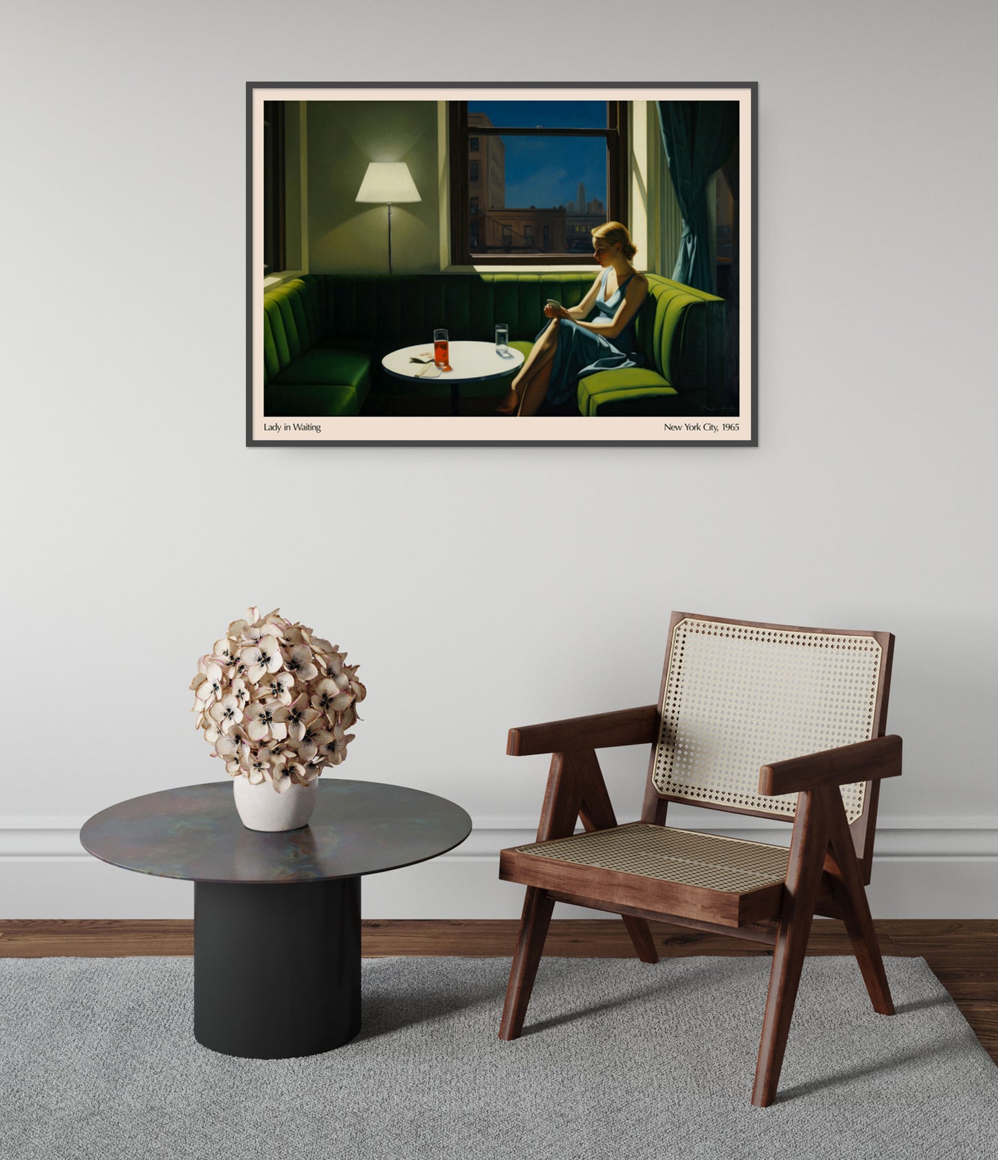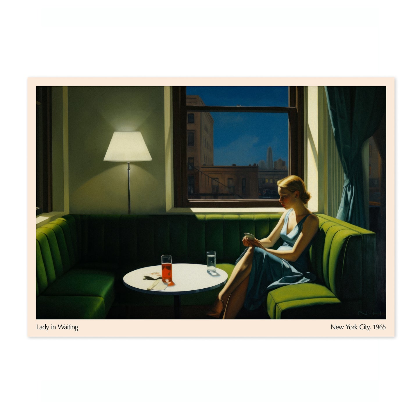 "Lady in Waiting" by Ned Hare captures a quiet, introspective moment set in a dimly lit New York City restaurant. This realistic portrayal features a solitary woman seated by a window, illuminated by a single table lamp beside her drink. Ideal for fans of urban nightscapes and introspective scenes, this poster transports viewers to a peaceful yet contemplative setting.