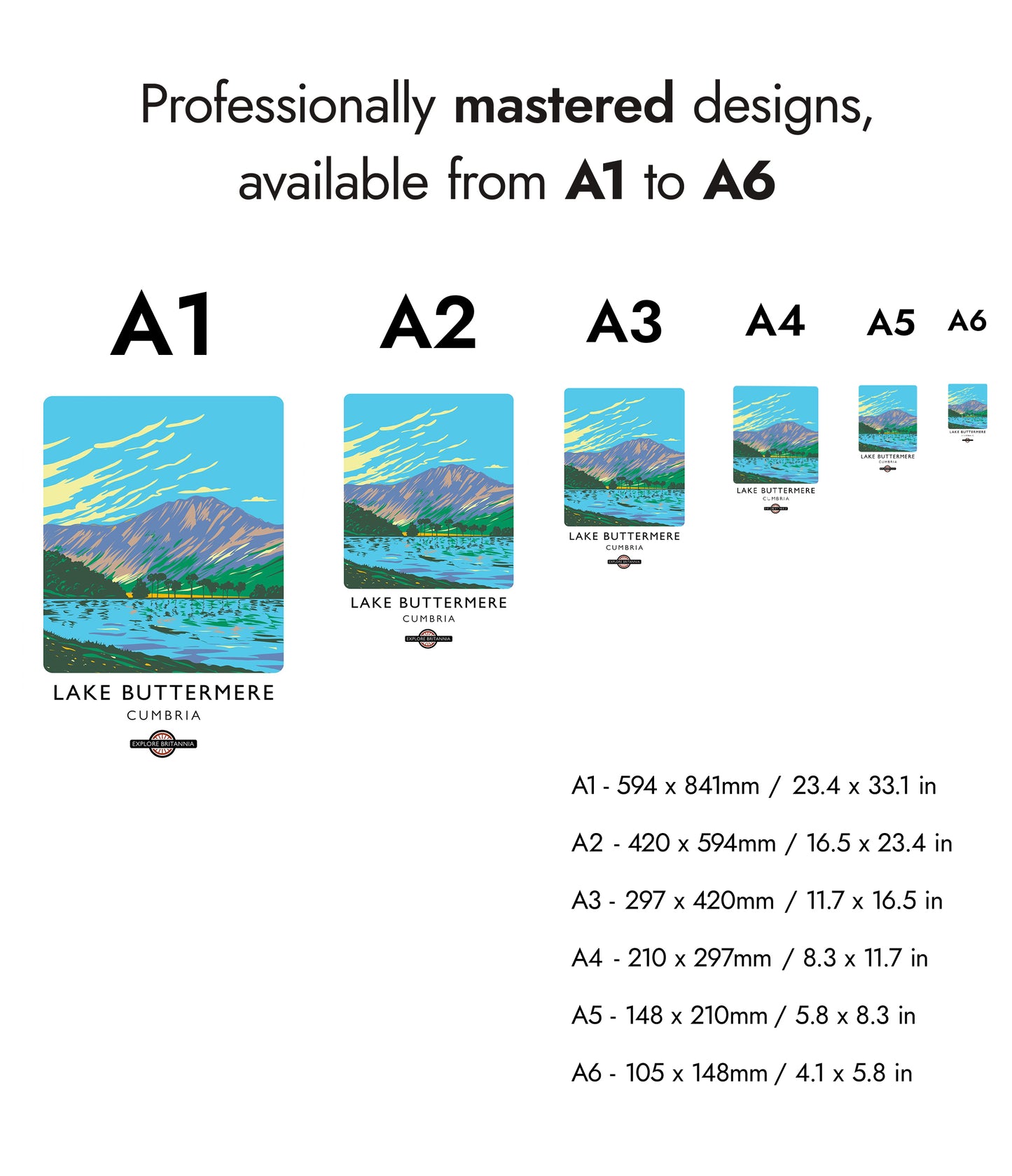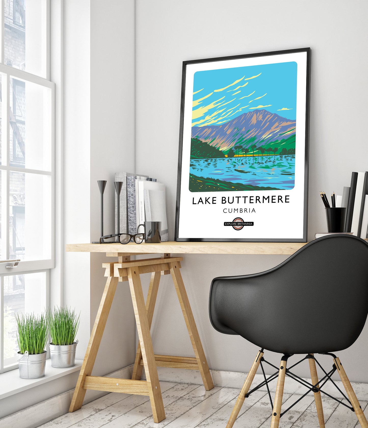 This travel poster of Lake Buttermere in Cumbria captures the serene beauty of the English landscape. Featuring vibrant blues and greens, the illustration showcases distant hills, tranquil waters, and lush trees under a dramatic sky. Ideal for those who appreciate Britain's natural wonders, this graphic artwork brings a piece of England's scenic charm into any space.