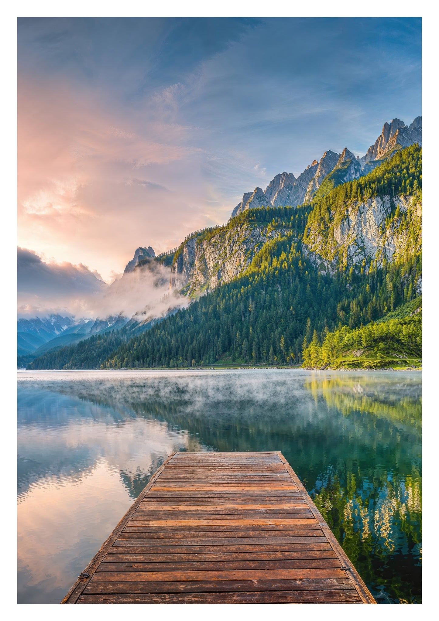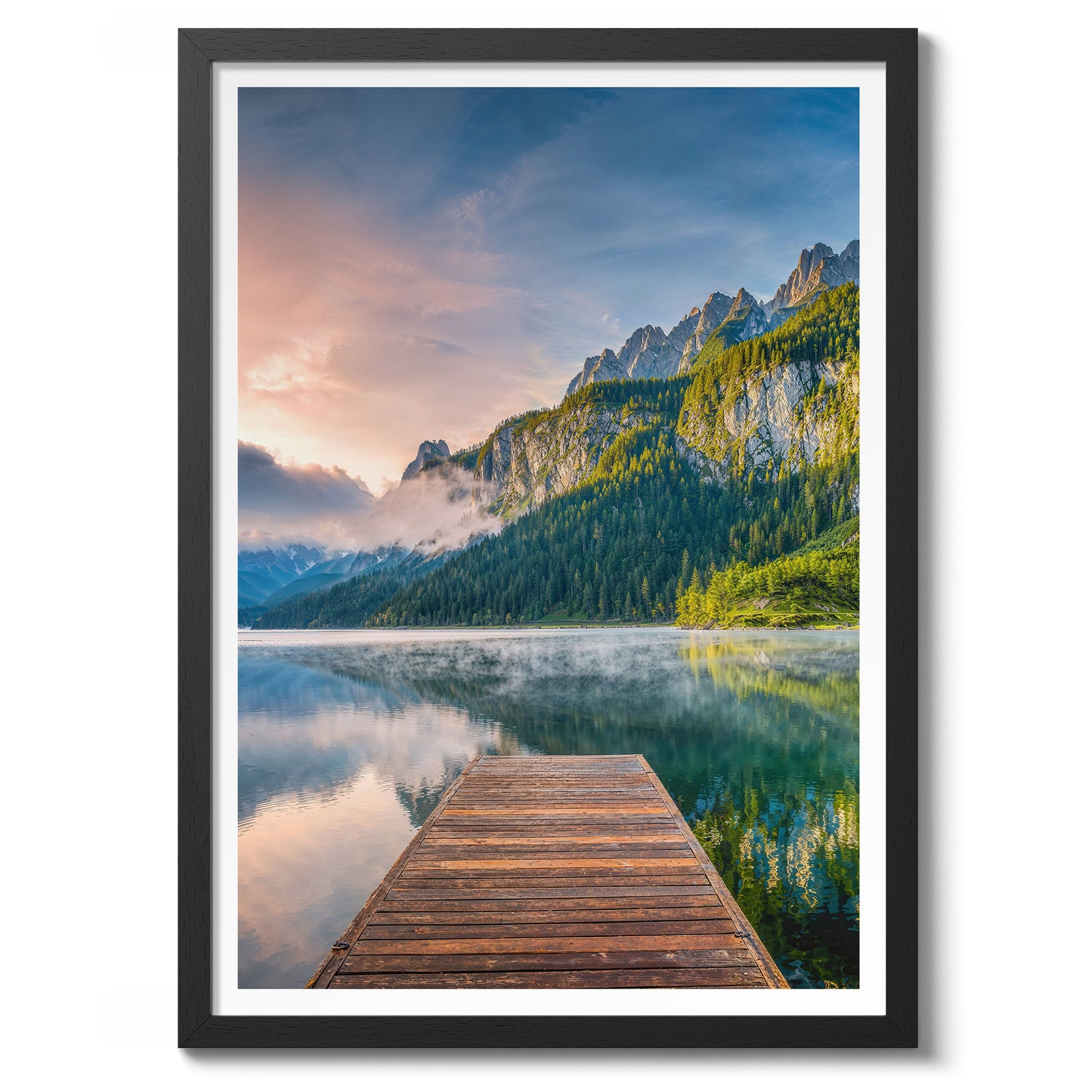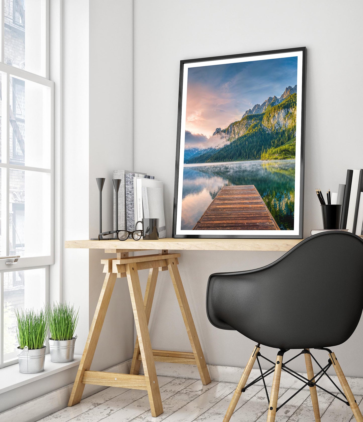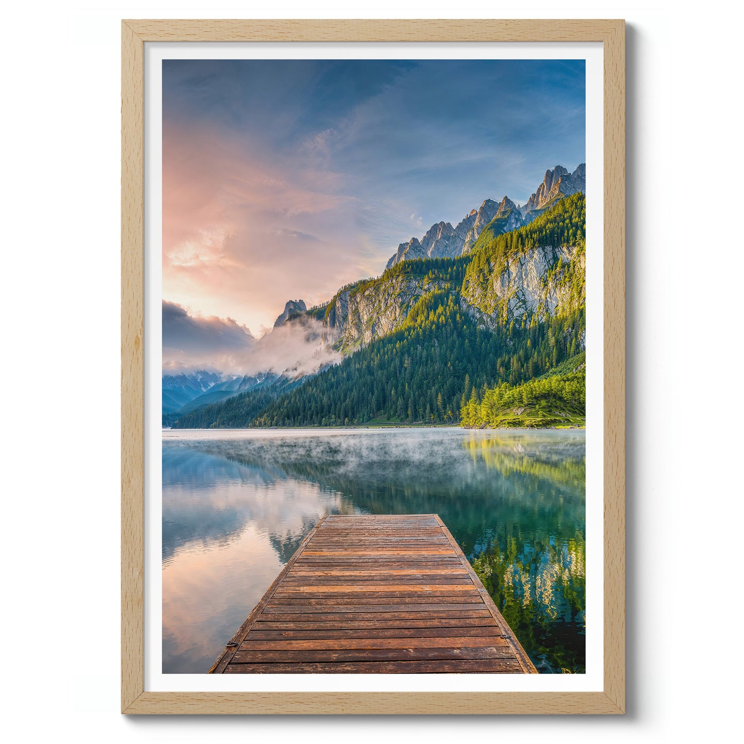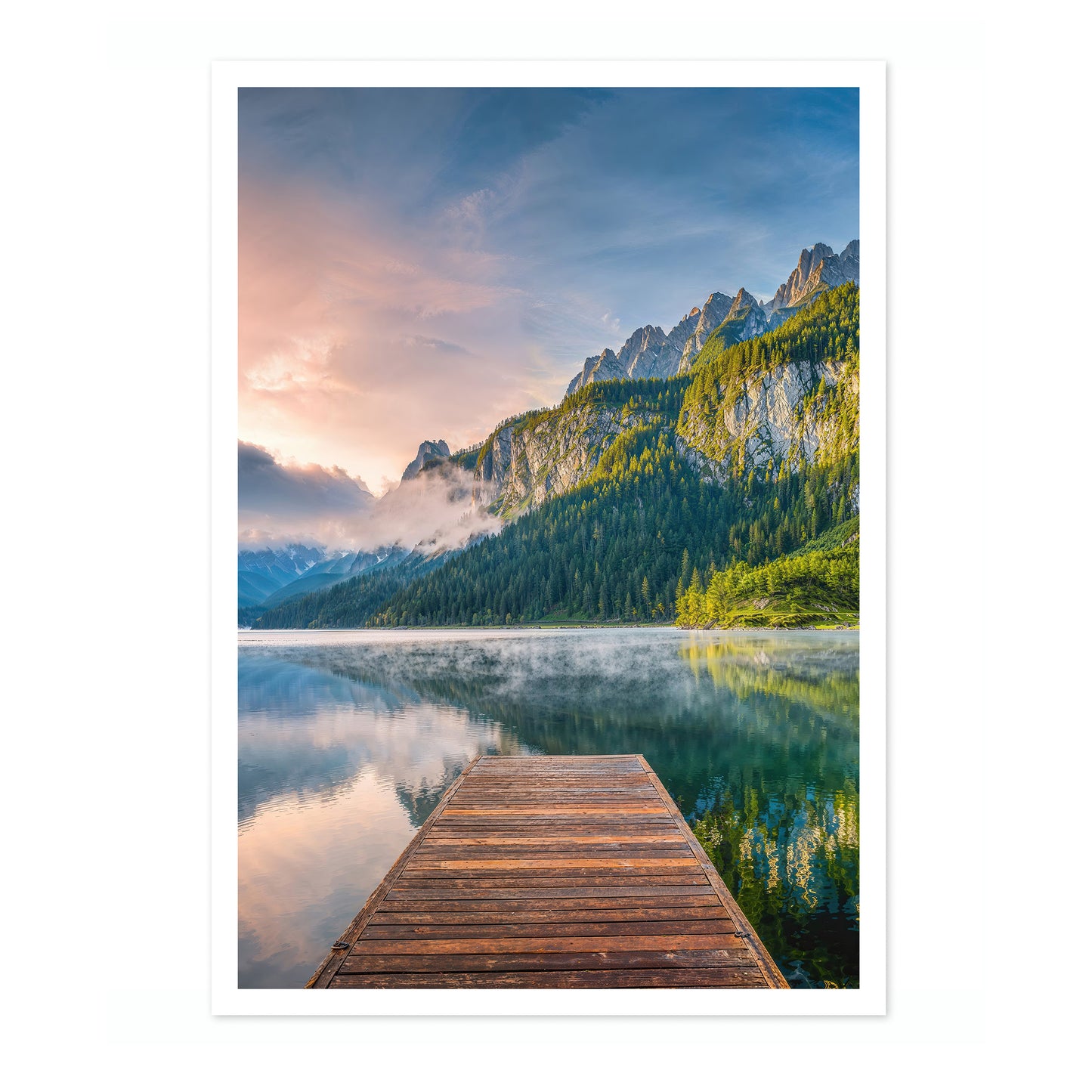"Lake Docking" photographic poster captures a serene lakeside scene featuring a wooden pier extending into calm, reflective waters. Enveloped by lush forests and towering mountains, the tranquil atmosphere is heightened by the soft dawn or dusk sky. Ideal for nature and landscape enthusiasts, this modern portrait encapsulates the peaceful intersection of lake, pier, forest, and mountain elements.