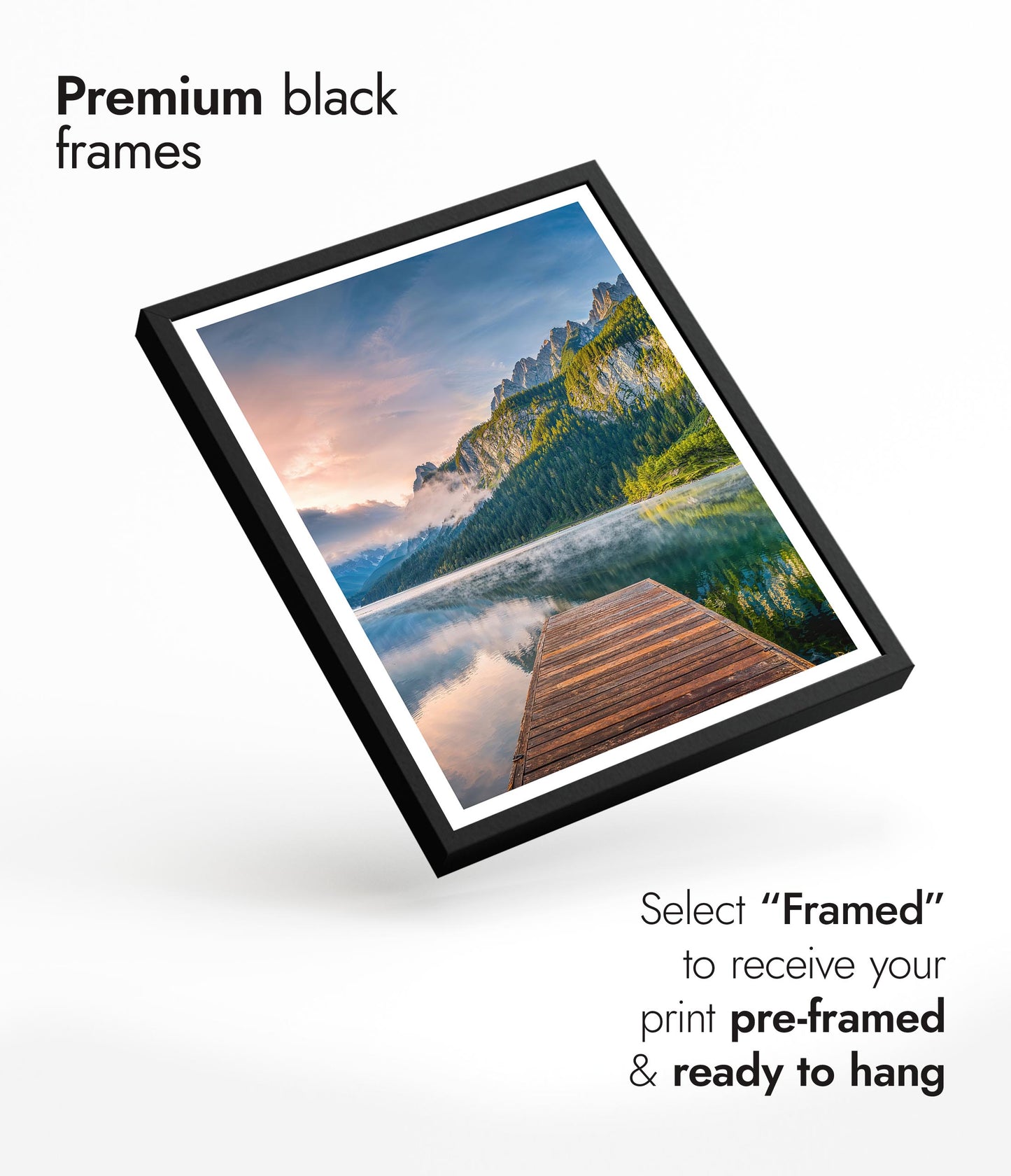 Solid wood frames available in black stained or natural finishes, with UV resistant acrylic glass. Framed orders arrive pre-installed with your choice of print, ready to hang. Available in all print sizes.