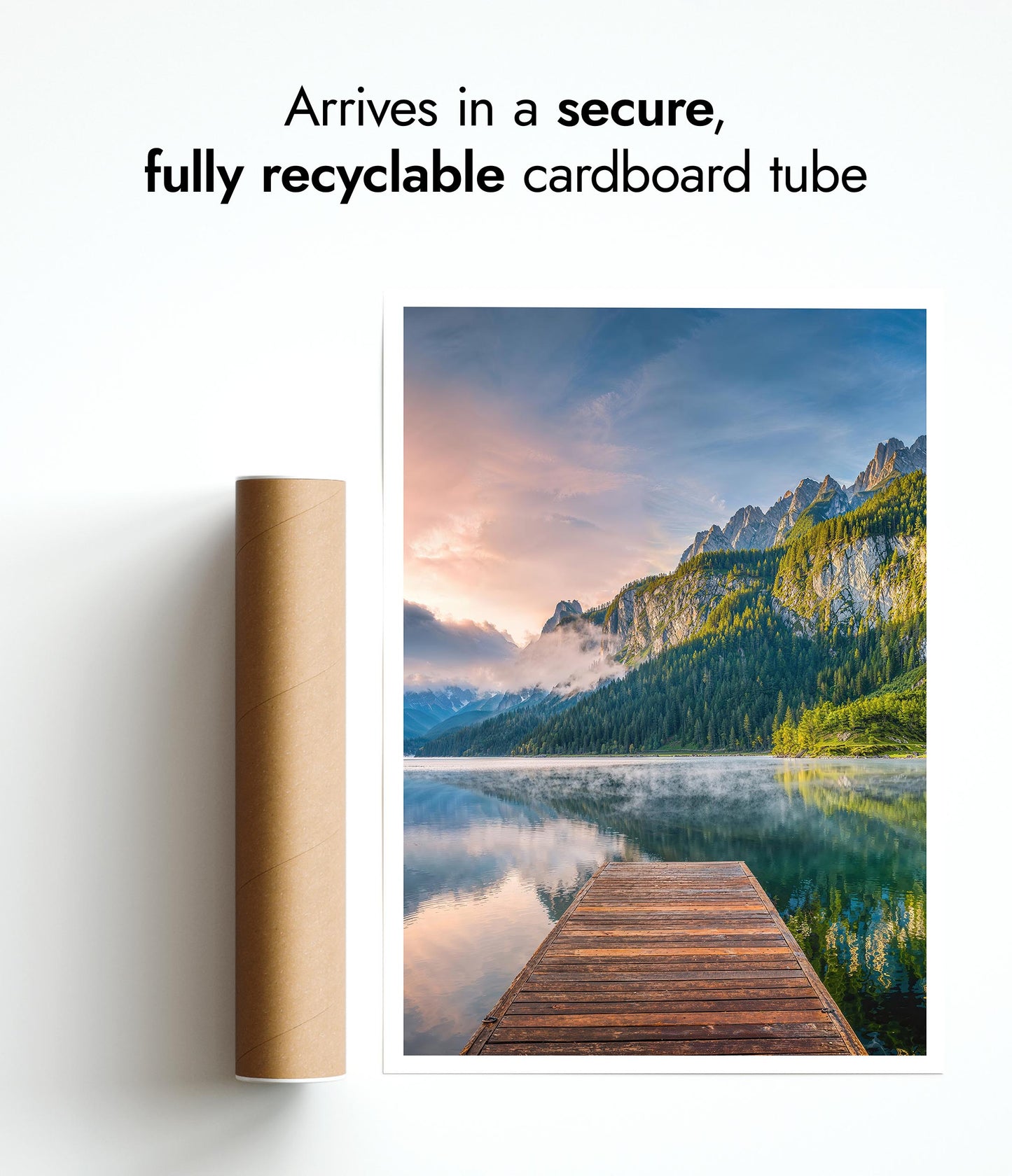 All orders are securely packed in recyclable, eco-friendly solutions. Frames are protected with sustainable bubble wrap alternatives inside thick boxes. Print only orders are shipped in heavy-duty cardboard tubes or protective hard-backed envelopes.