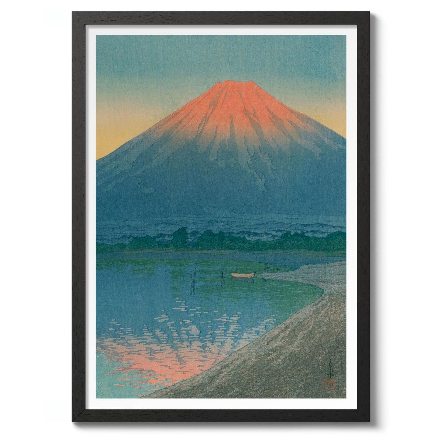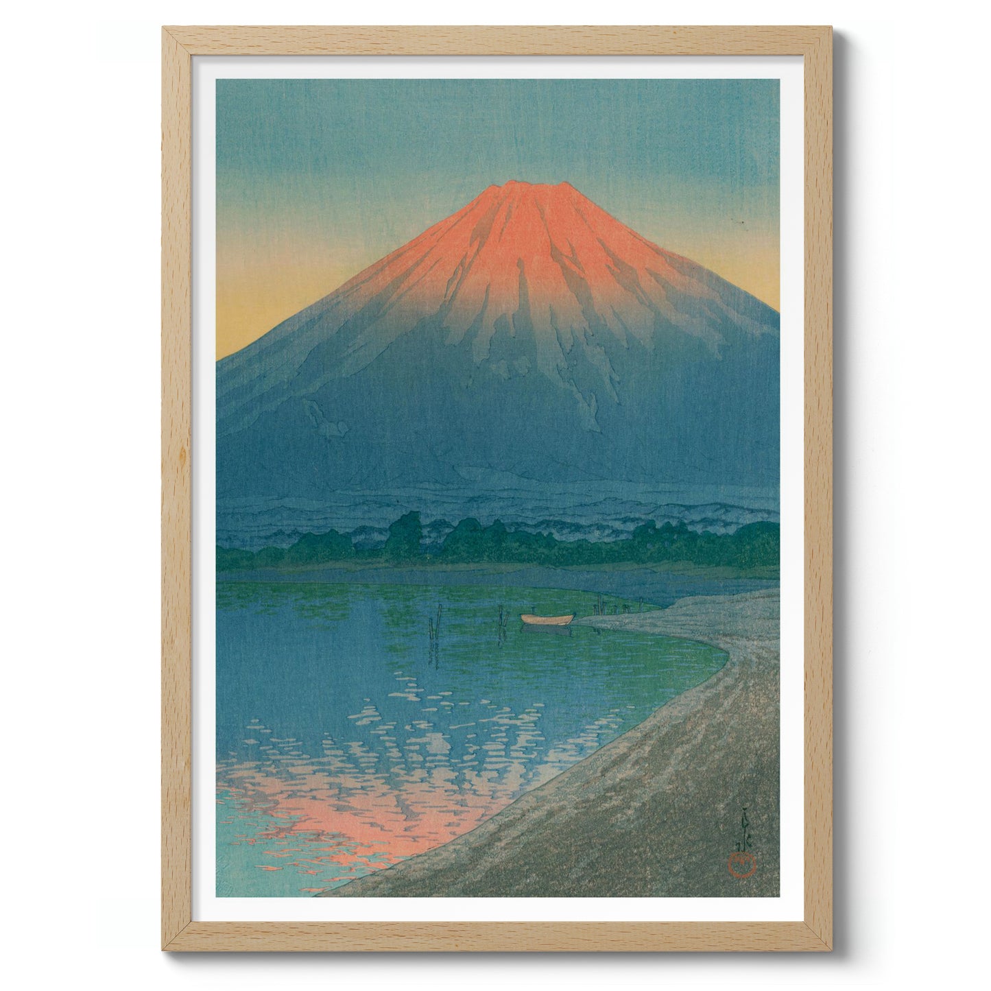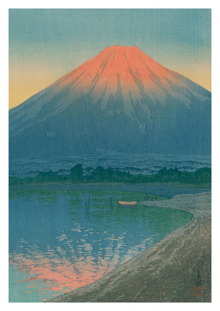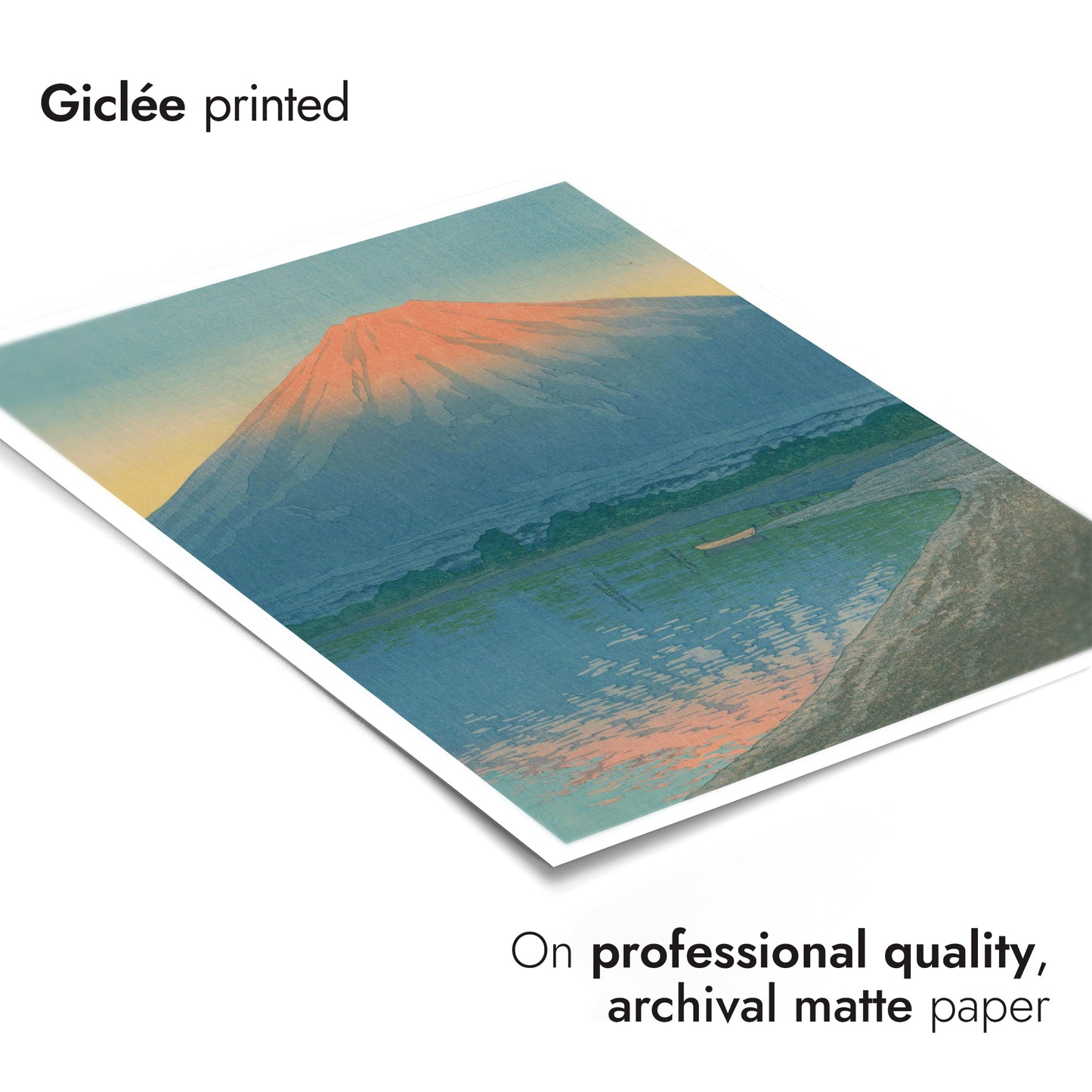 This art print poster, "Lake Yamanaka and Mount Fuji" by Kawase Hasui, captures the serene beauty of a sunrise over Mount Fuji. The tranquil scene showcases the classic Japanese woodblock style, with tranquil reflections on the lake and warm dawn hues illuminating the mountain. Perfect for appreciating traditional Japanese artistry and iconic landscapes.