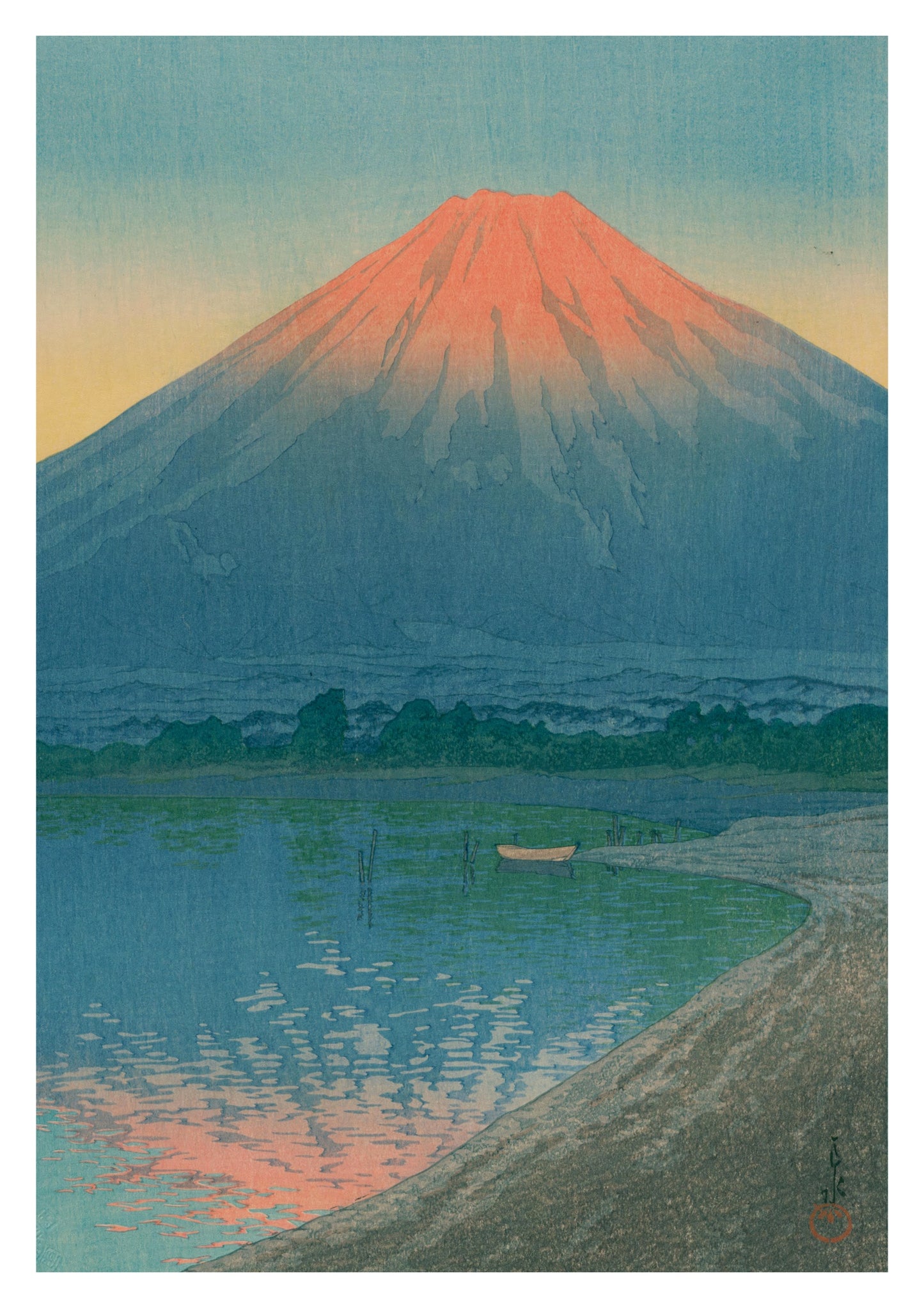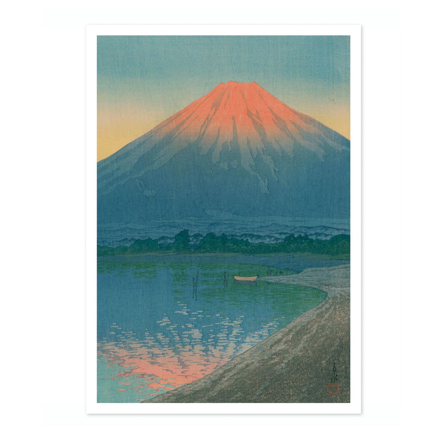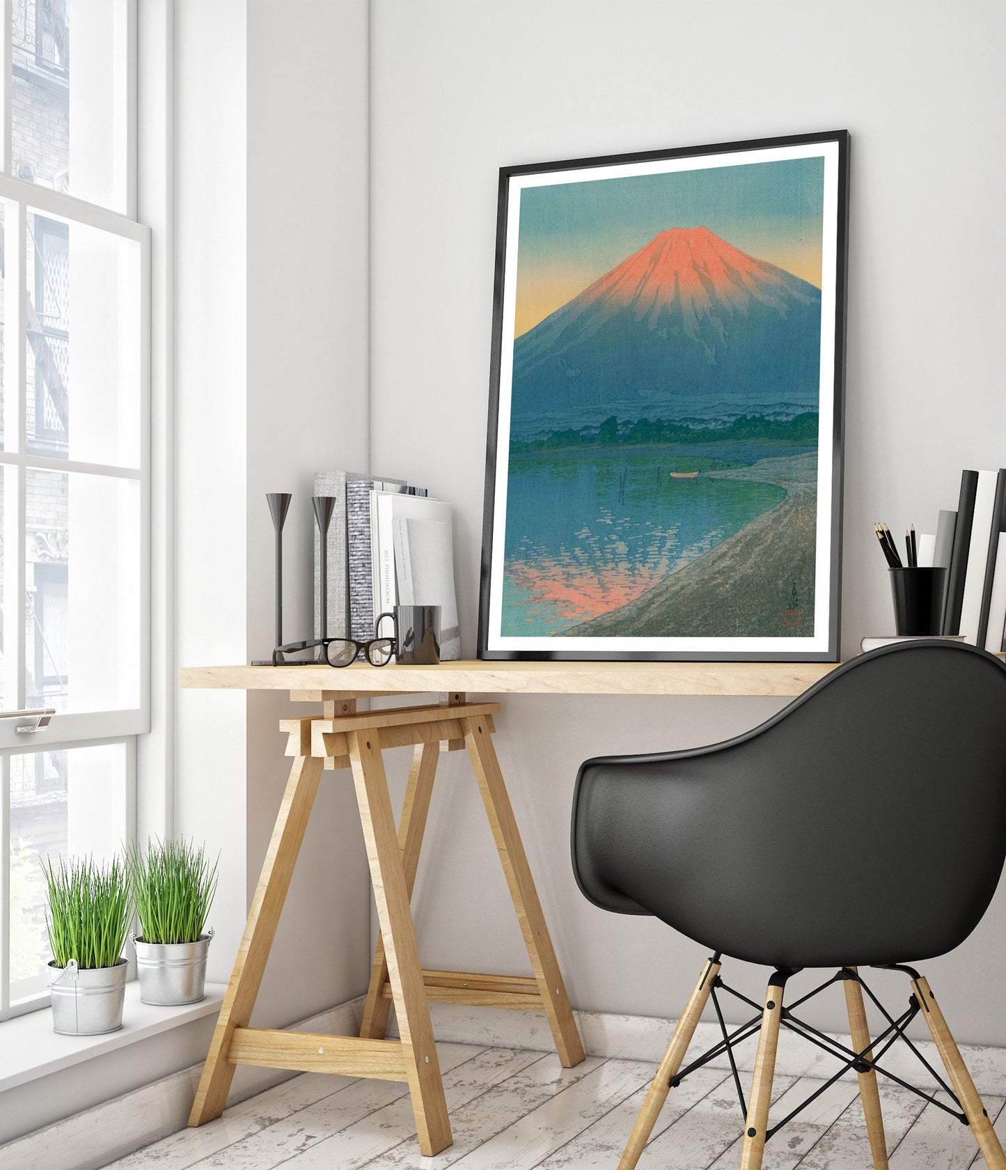 This art print poster, "Lake Yamanaka and Mount Fuji" by Kawase Hasui, captures the serene beauty of a sunrise over Mount Fuji. The tranquil scene showcases the classic Japanese woodblock style, with tranquil reflections on the lake and warm dawn hues illuminating the mountain. Perfect for appreciating traditional Japanese artistry and iconic landscapes.