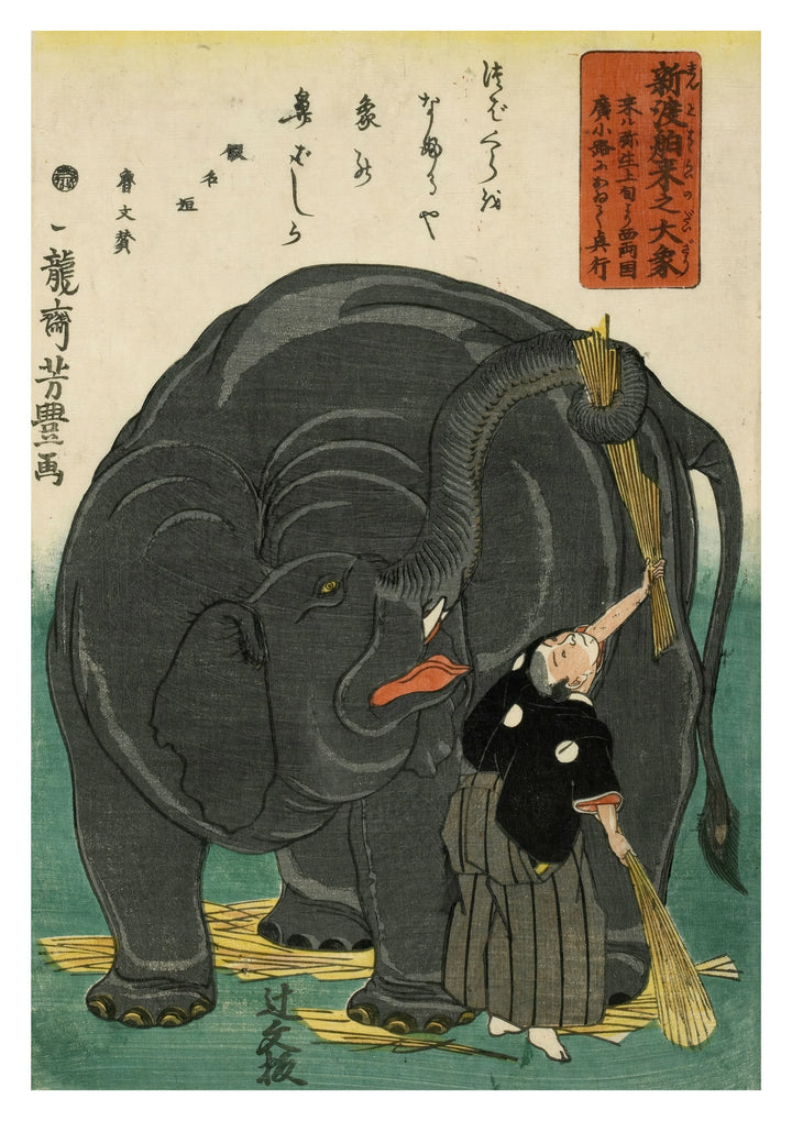 This elegant Japanese woodblock poster, titled "Large Elephant" by Ichiryusai Yoshitoyo, depicts a majestic elephant in traditional Ukiyo-e style. The illustration showcases exquisite detail and vibrant colours, capturing the gentle interaction between the elephant and a smaller figure. Ideal for lovers of classic Japanese art, this animal-themed poster adds cultural and artistic flair to any space.