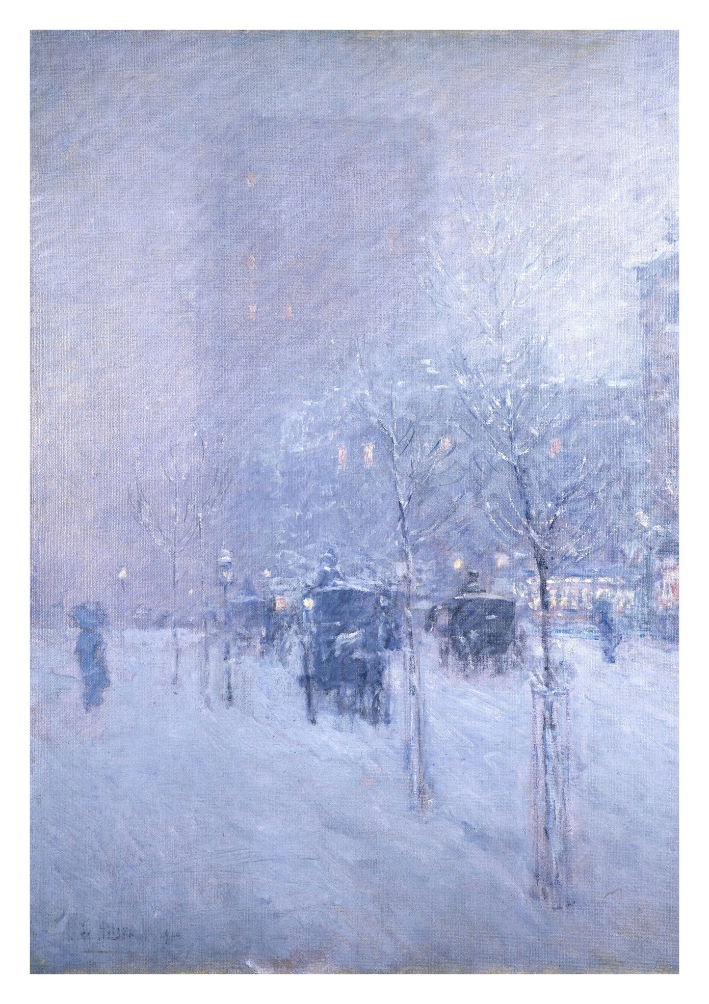 "Late Afternoon, New York Winter" by Childe Hassam captures a serene, snow-laden cityscape. This impressionist poster features soft, muted tones depicting horse-drawn carriages and hazy buildings under a heavy snowfall, evoking the quiet yet bustling essence of a New York winter street scene. Perfect for adding a touch of tranquility and historical charm to any space.