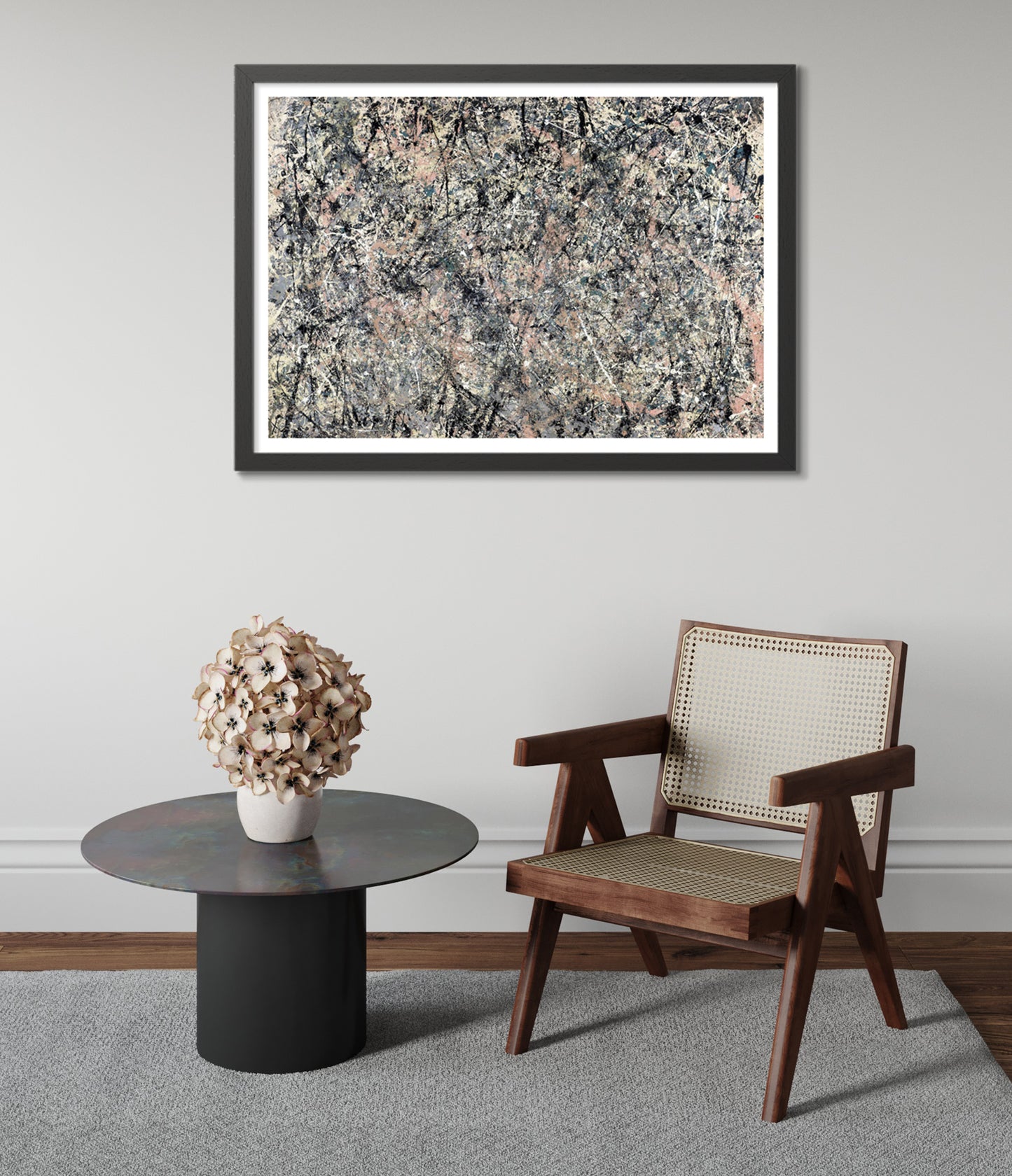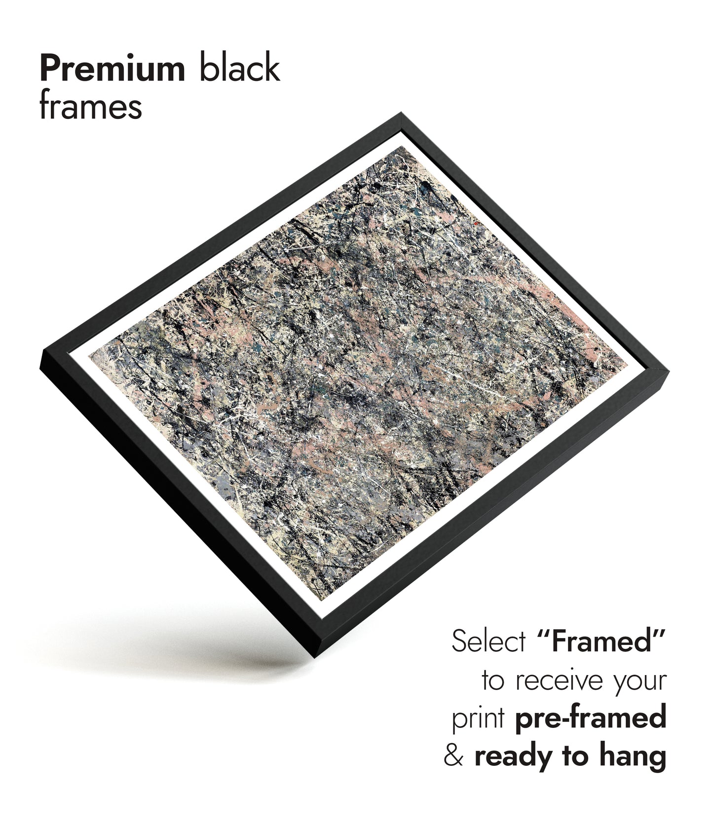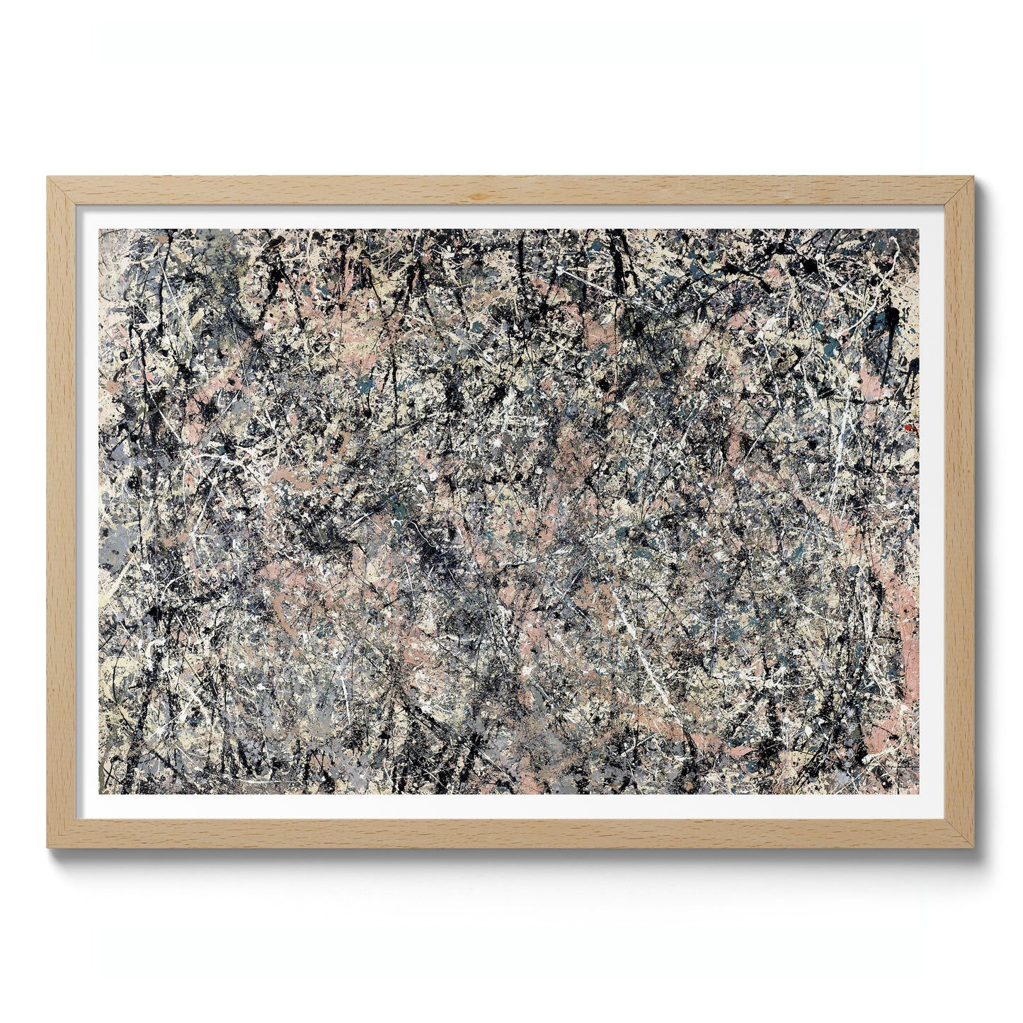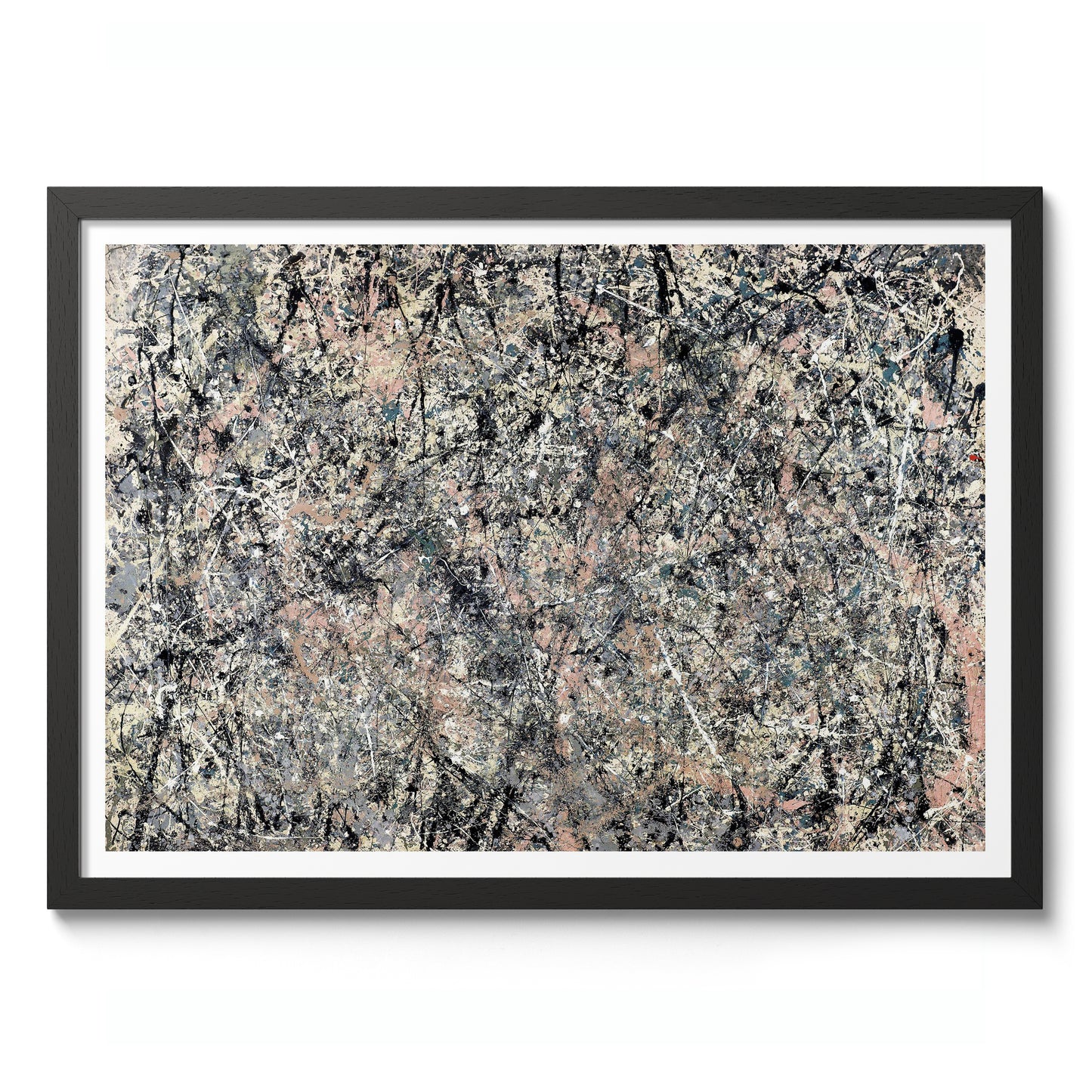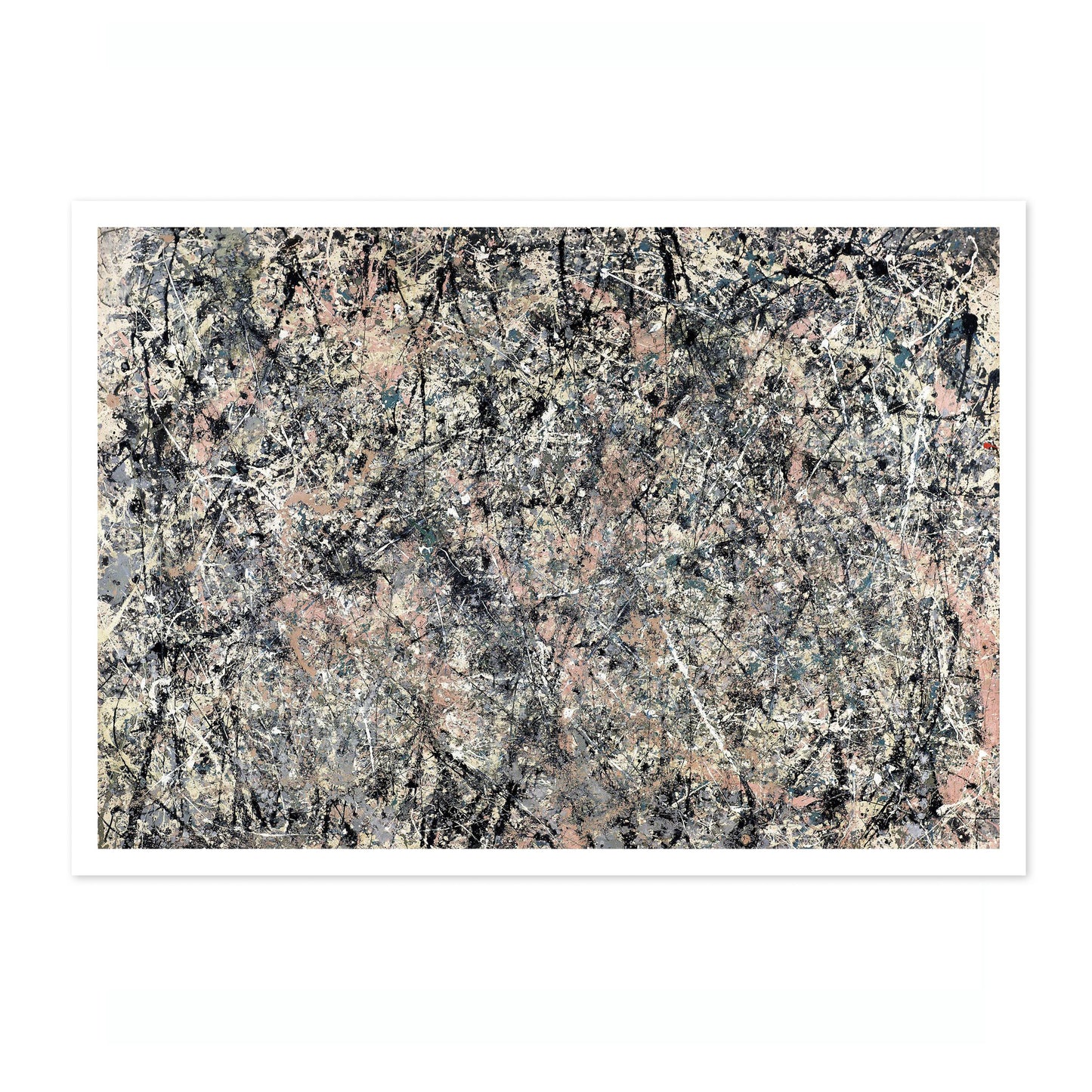 This "Lavender Mist" poster by Jackson Pollock, created in 1950, encapsulates the essence of abstract expressionism. Featuring interwoven layers of grey, black, and pastel pink splatters, it exemplifies Pollock's signature drip painting technique. The chaotic yet harmonious blend of colors creates a mesmerizing, dynamic visual experience. Ideal for abstract art enthusiasts seeking to add a touch of modernist flair to their space.