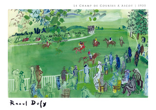 This exquisite poster of "Le Champ de Courses á Ascot" by Raoul Dufy captures the lively atmosphere of a horse race at Ascot. Rendered in Fauvist style, the watercolour painting showcases vibrant hues and fluid lines, portraying the dynamic scene of horses, jockeys, and an animated crowd amidst a lush green field. Perfect for any art lover's collection.