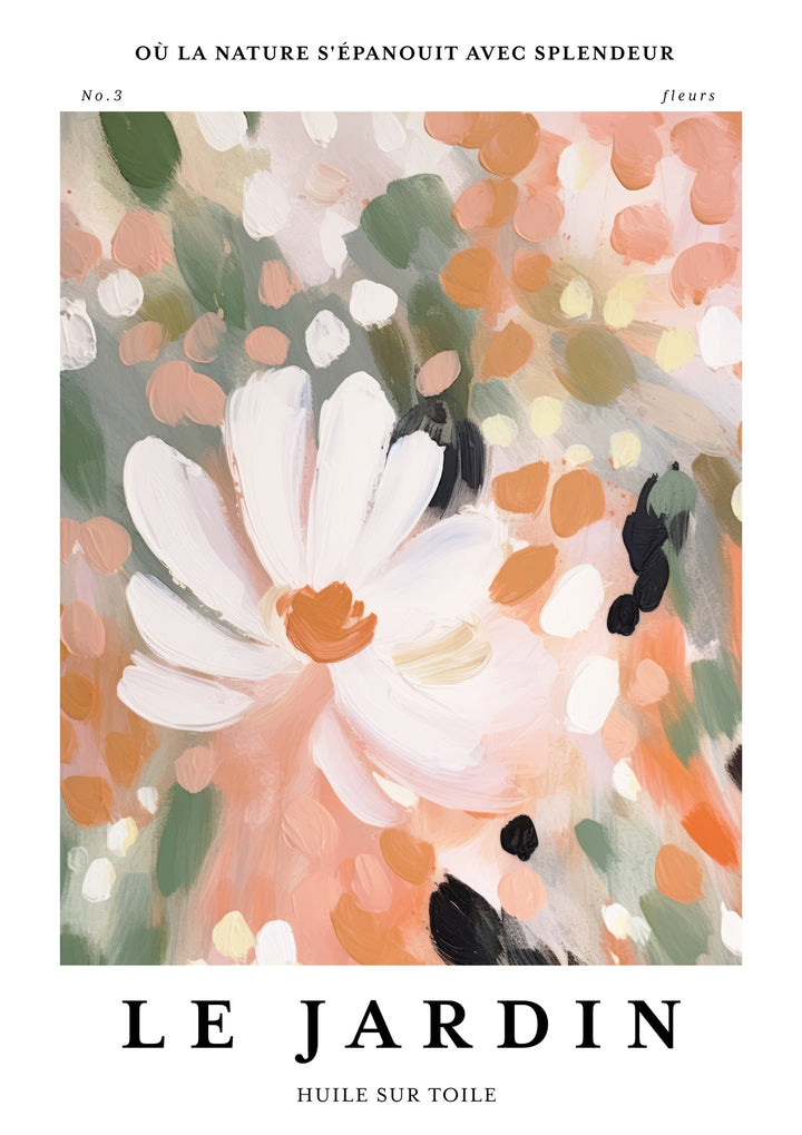 Experience the ethereal beauty of nature with the “Le Jardin” poster. This abstract floral painting captures a blooming garden in soft, pastel hues. The prominent white flower amidst a blend of peach, green, and black hues evokes a serene and harmonious feel. Perfect for adding a touch of elegance and tranquility to any space.