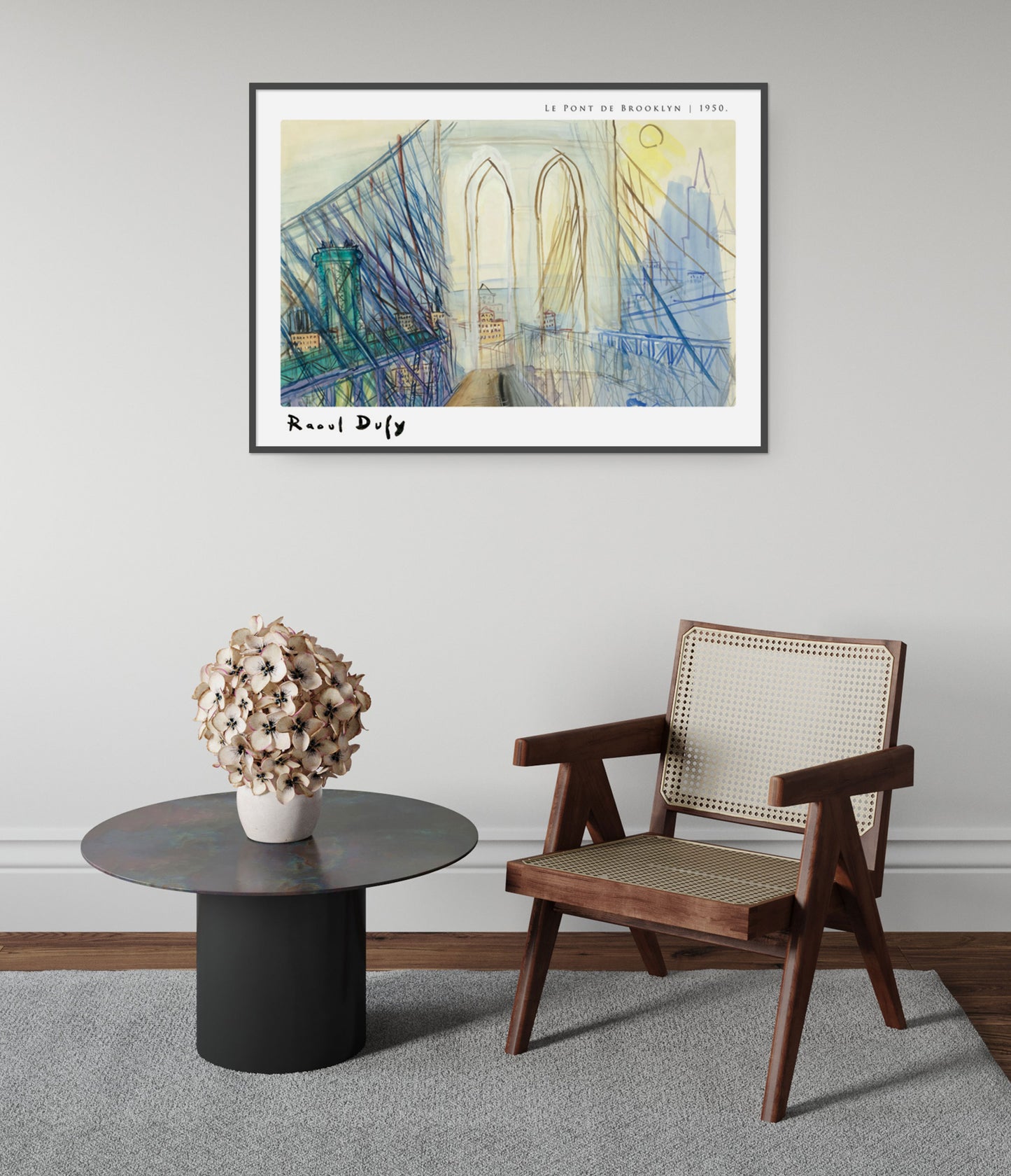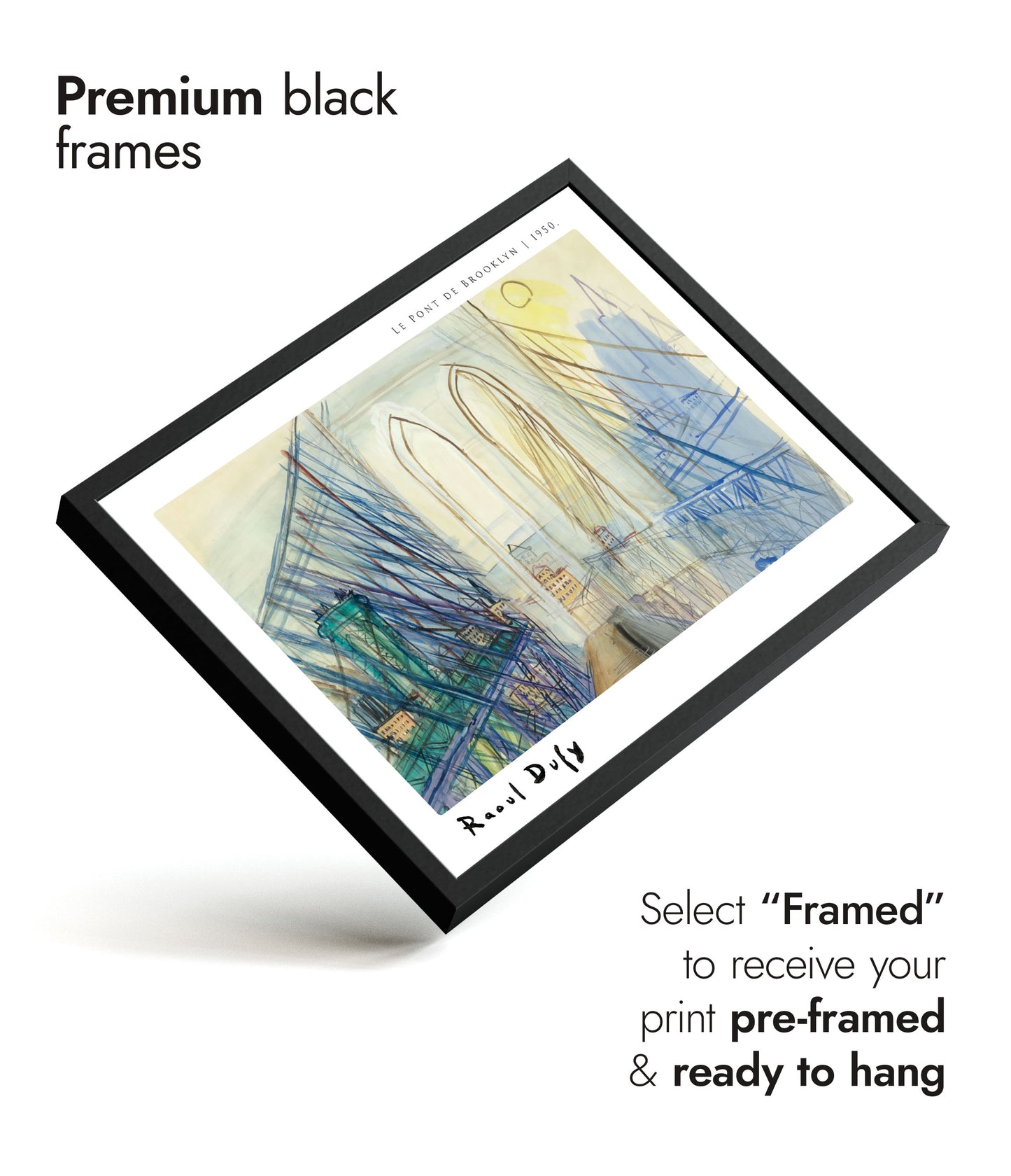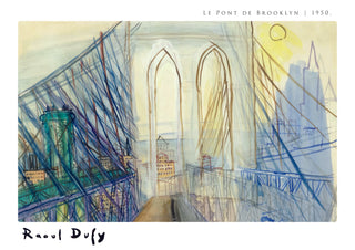 This art print poster, "Le Pont de Brooklyn" by Raoul Dufy, captures the iconic Brooklyn Bridge. Rendered in a Fauvist watercolour style, the composition highlights the intricate bridge cables against a sunset-lit New York City skyline. The piece combines urban elements with vivid colour, making it an engaging depiction of one of America's most famous landmarks.