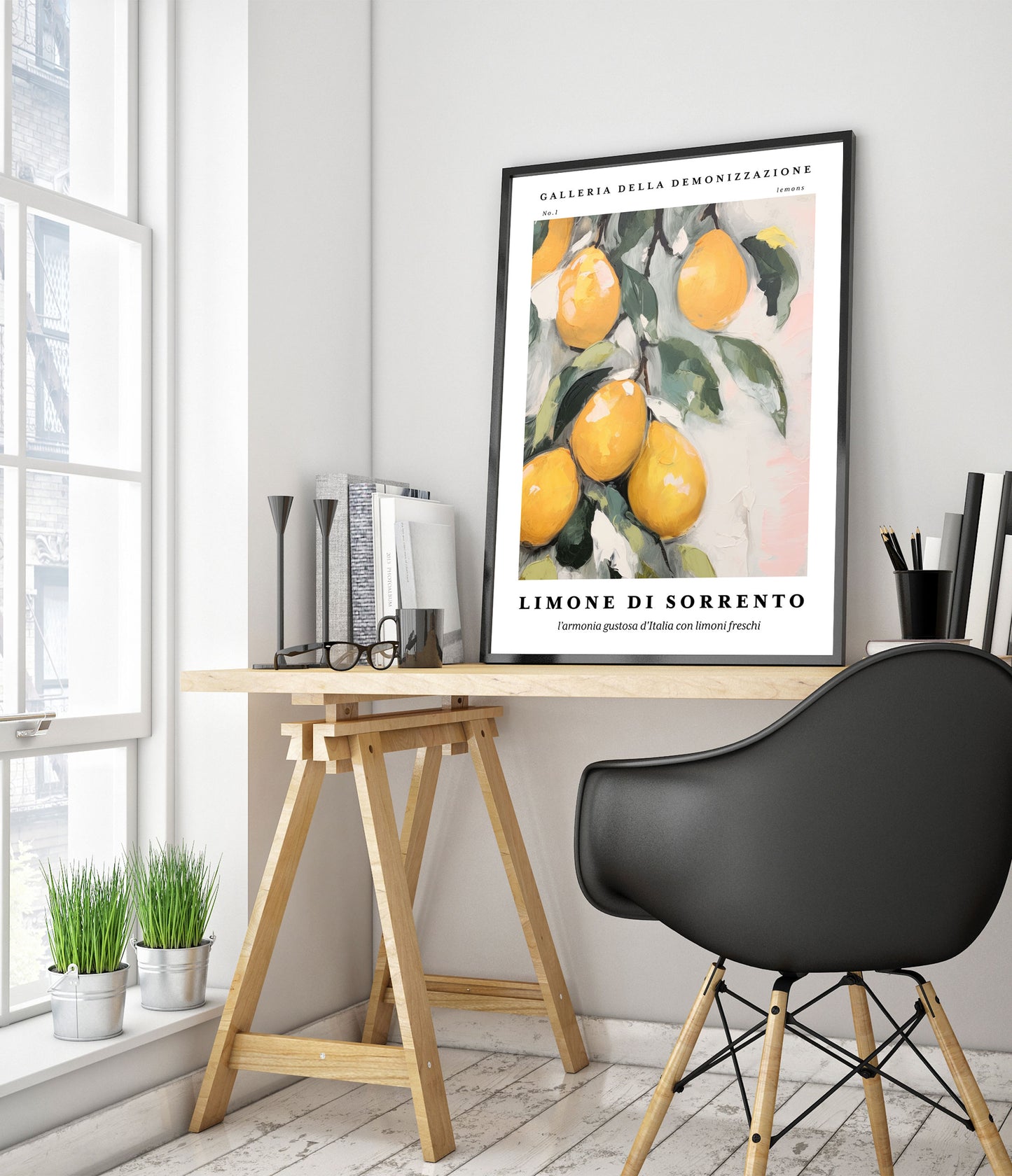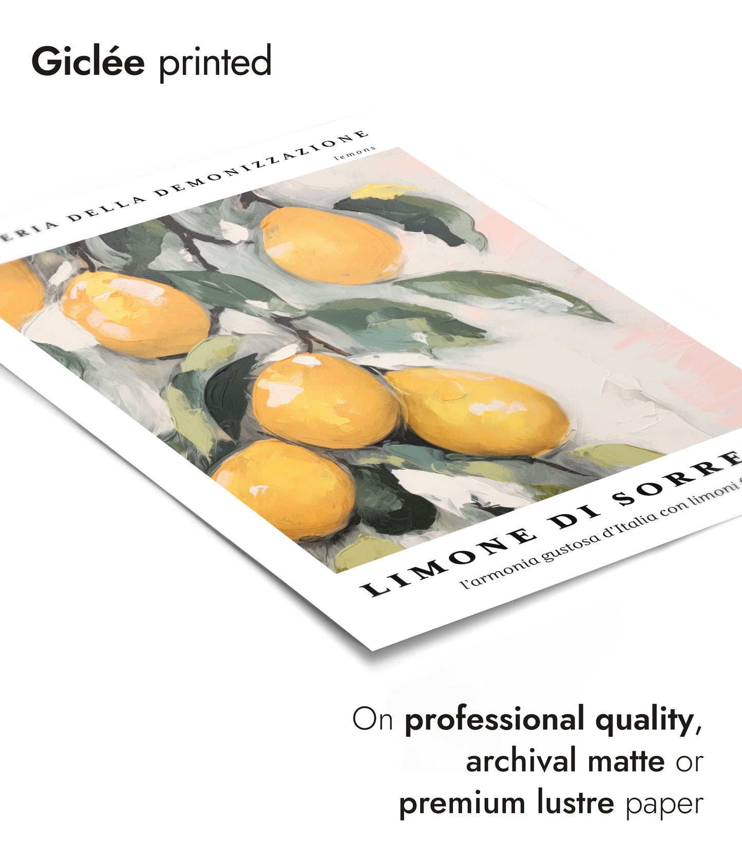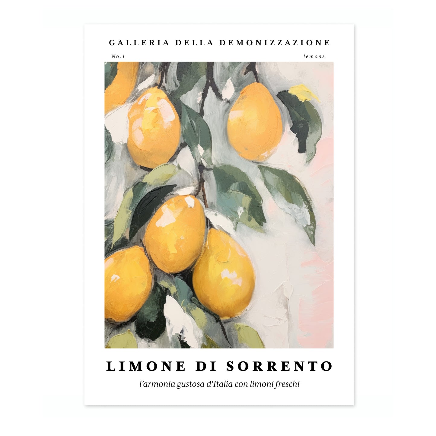 This "Lemons - Sorrento" poster showcases a vibrant still life painting of ripe lemons hanging from lush green branches. Inspired by the citrus groves of Italy’s Amalfi Coast, this artwork brings the fresh and zesty essence of Sorrento into your space. Perfect for kitchen decor or adding a Mediterranean touch, it captures the beauty of Italian nature.