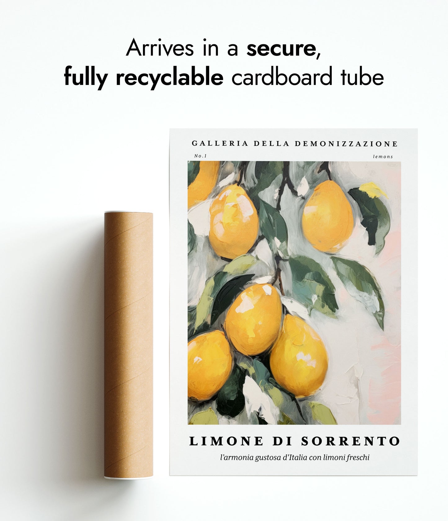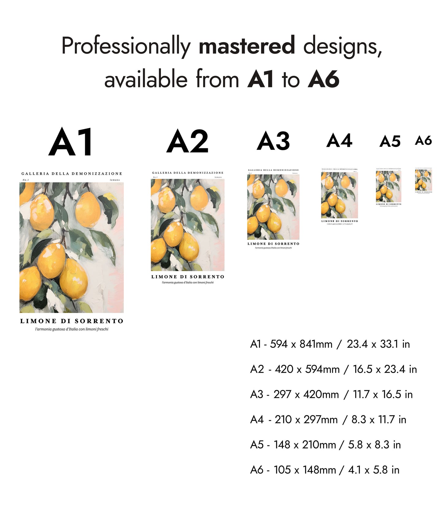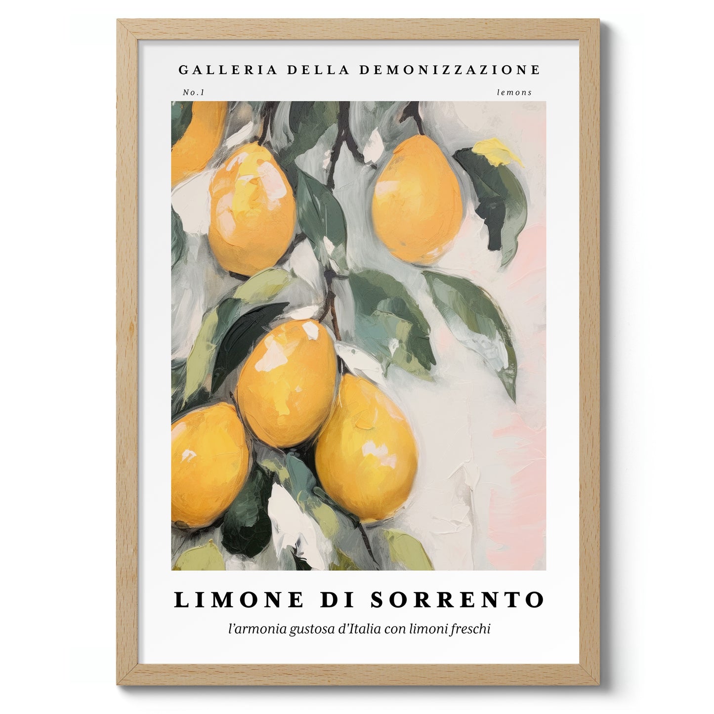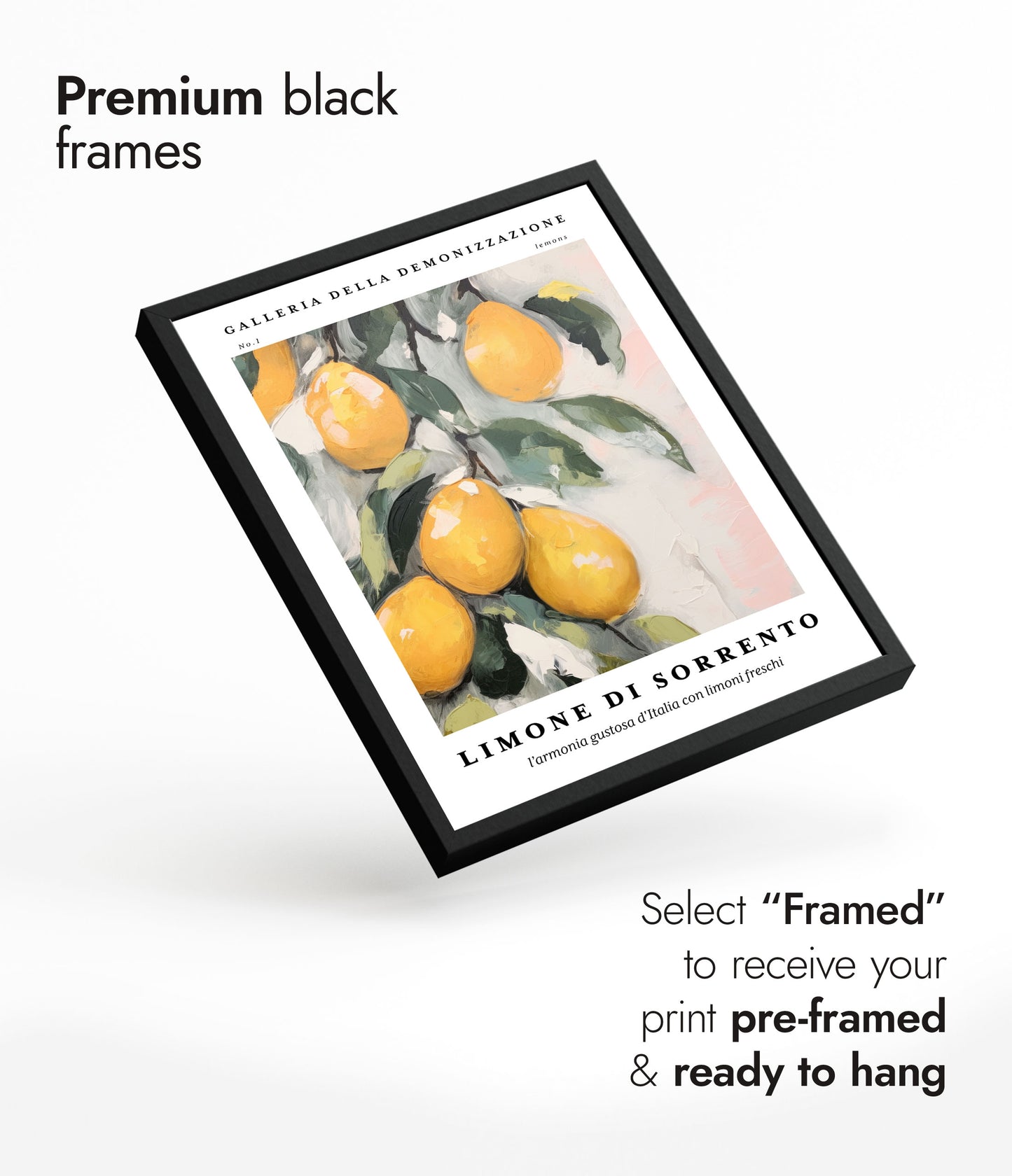 This "Lemons - Sorrento" poster showcases a vibrant still life painting of ripe lemons hanging from lush green branches. Inspired by the citrus groves of Italy’s Amalfi Coast, this artwork brings the fresh and zesty essence of Sorrento into your space. Perfect for kitchen decor or adding a Mediterranean touch, it captures the beauty of Italian nature.