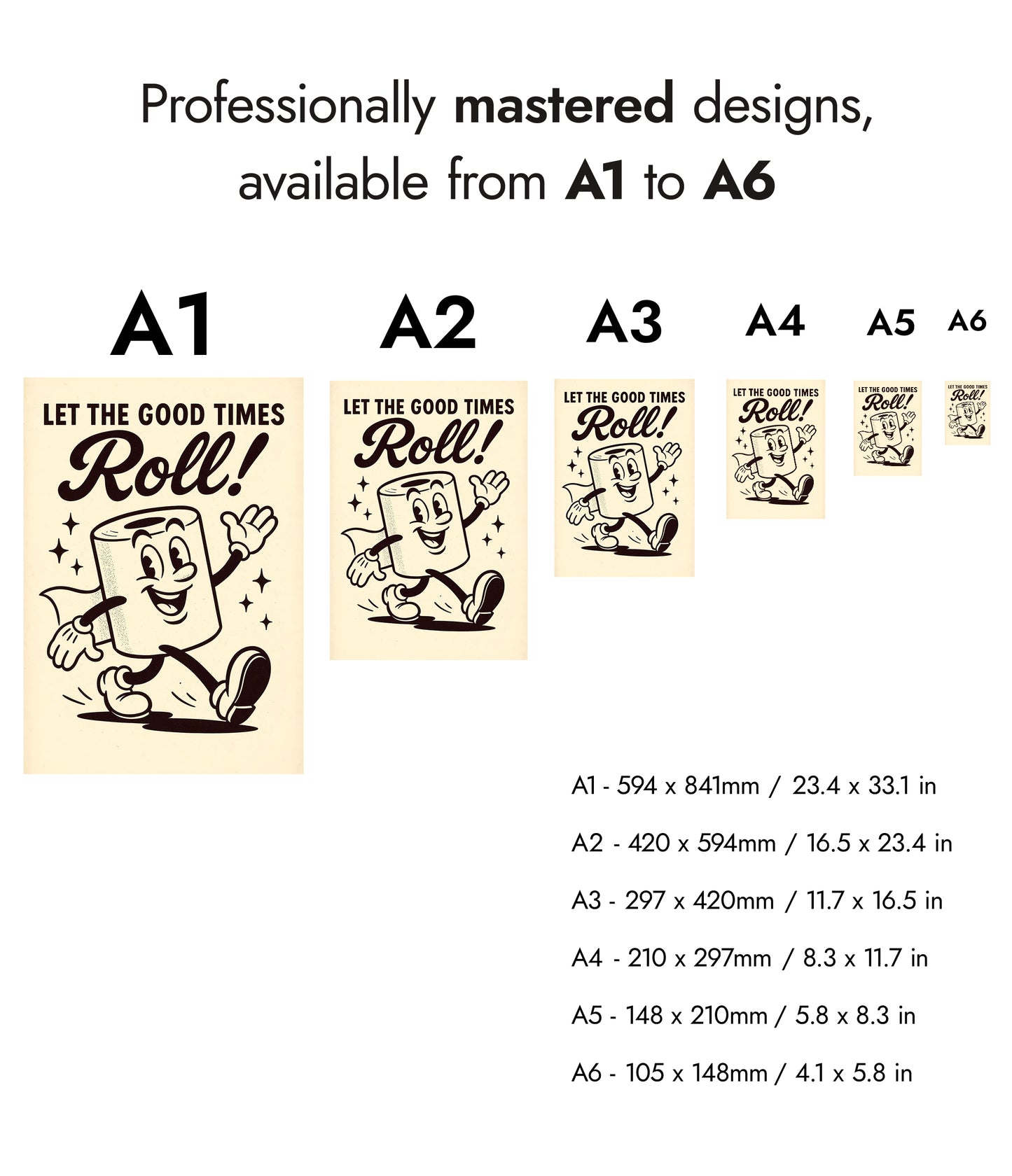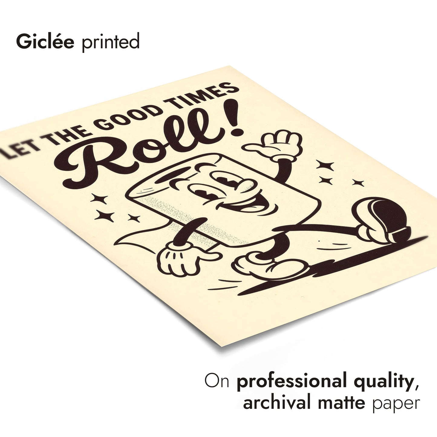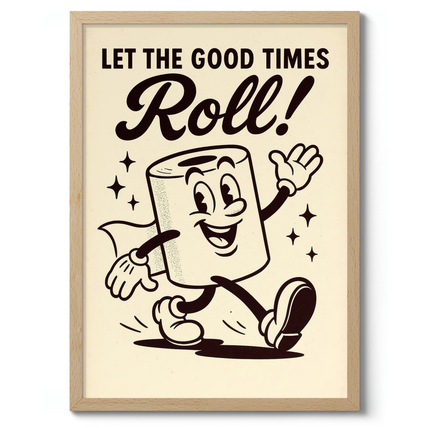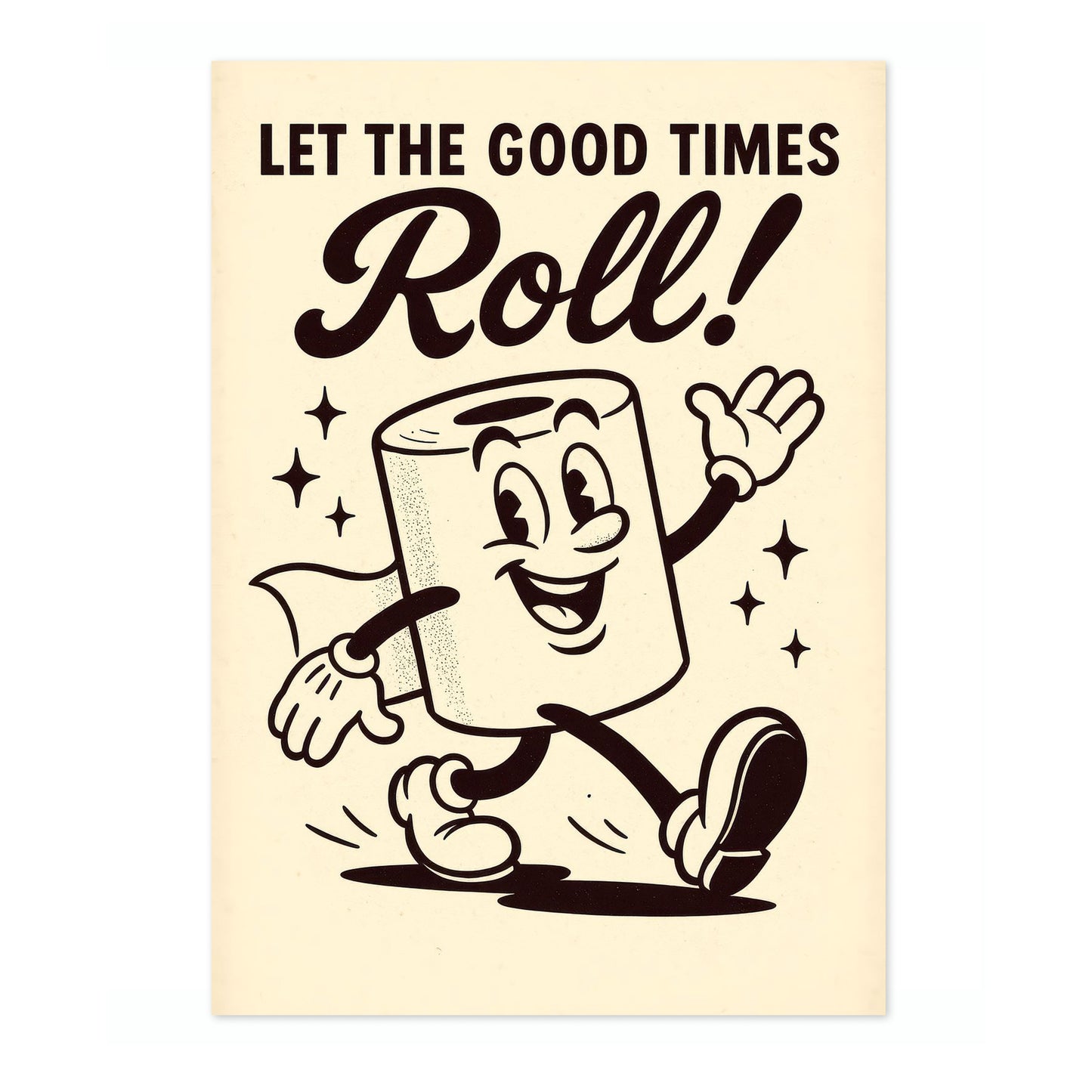 This vintage-style poster features an animated toilet paper character joyfully striding with the phrase "Let the Good Times Roll!" in bold typography. The beige background accentuates the classic black and white illustration, evoking a retro charm. Perfect for adding humor and a nostalgic touch to bathroom decor or any space needing a playful, whimsical statement.