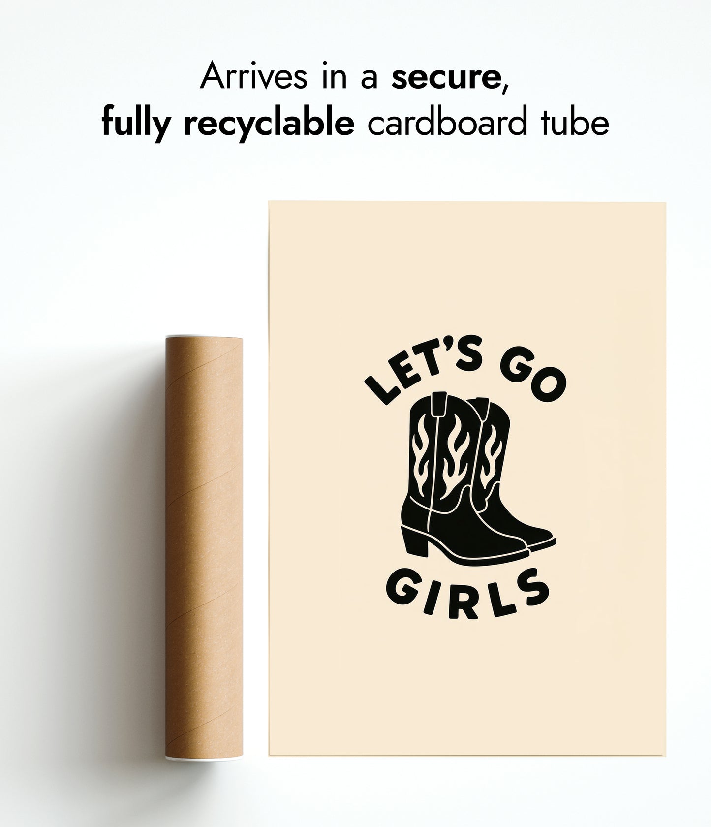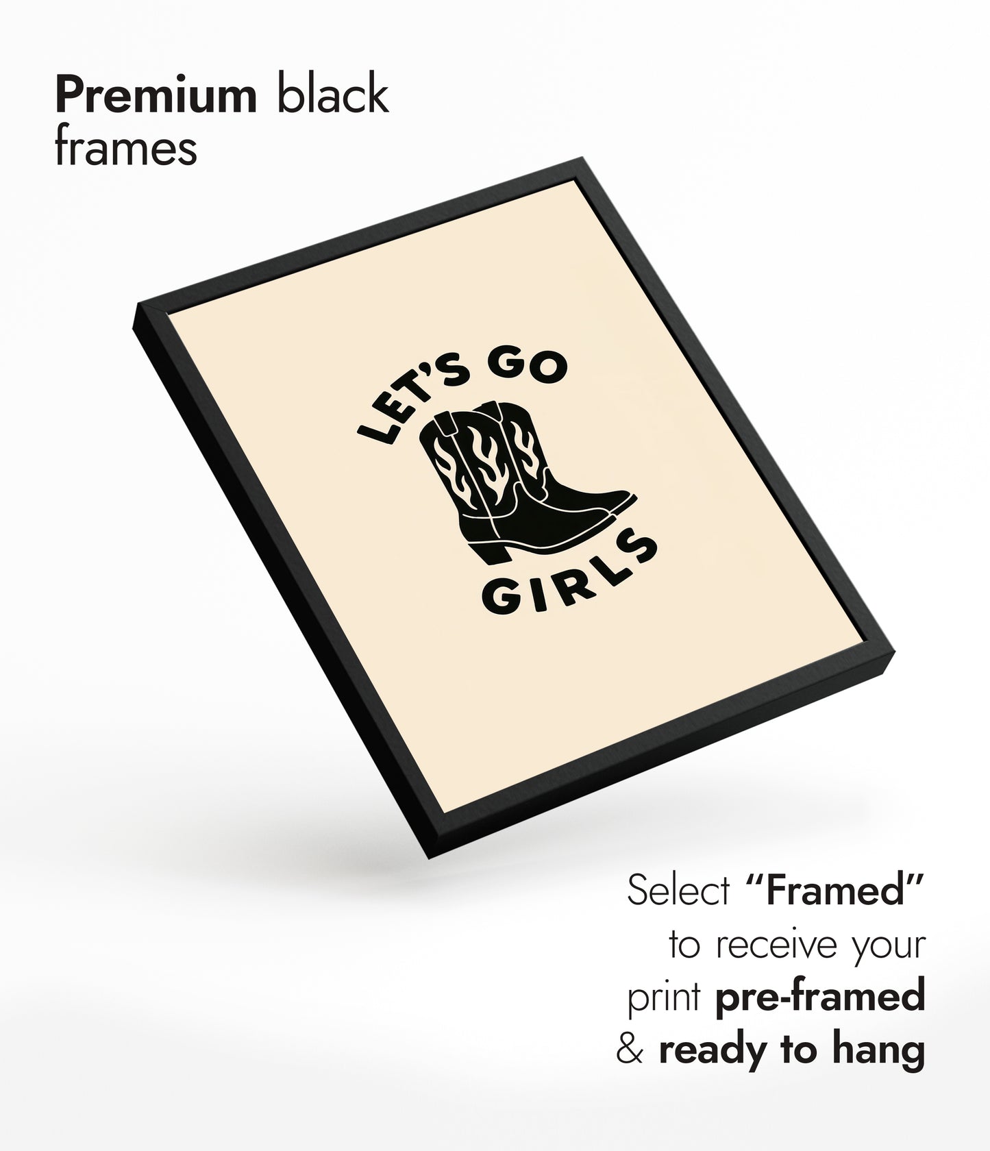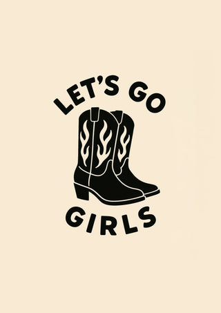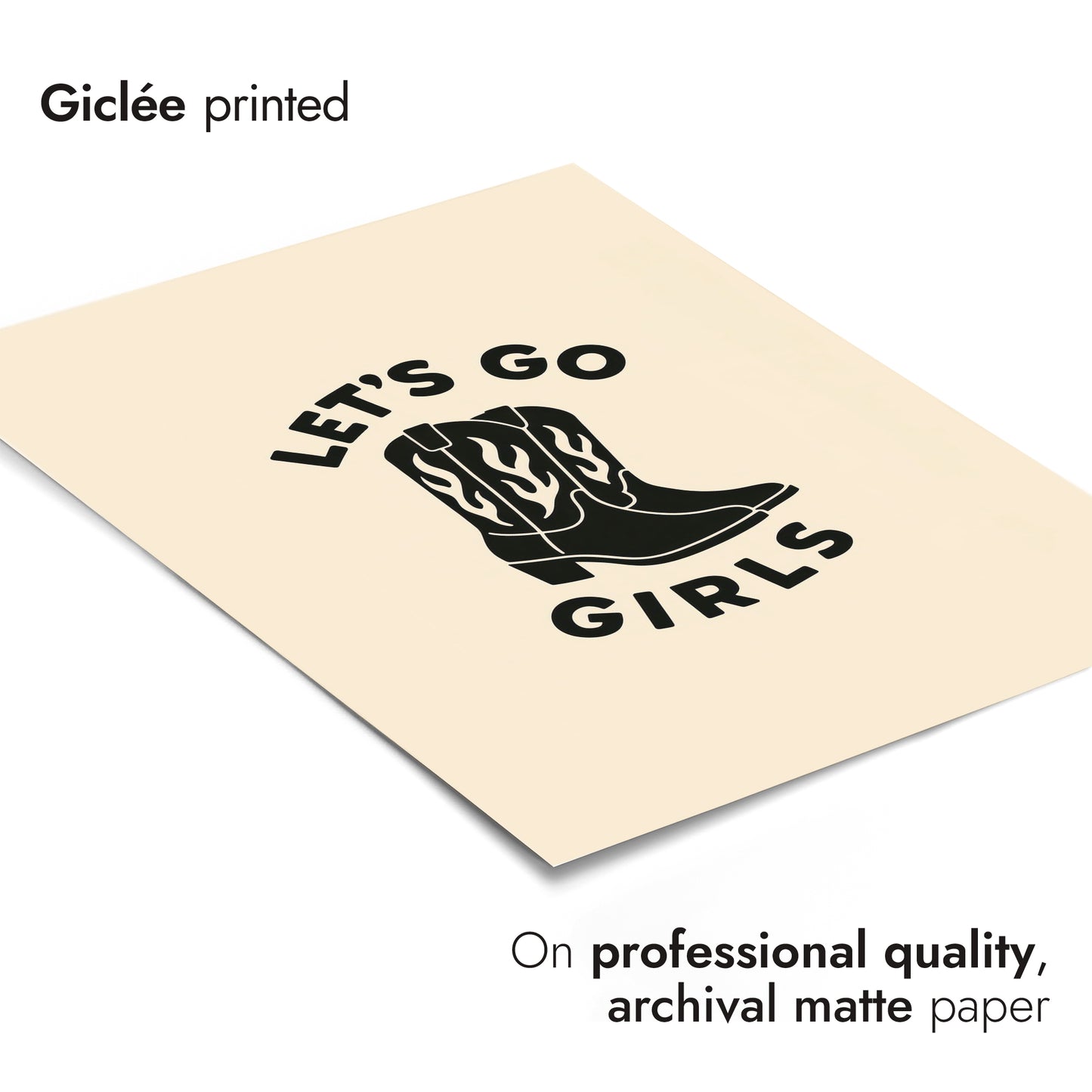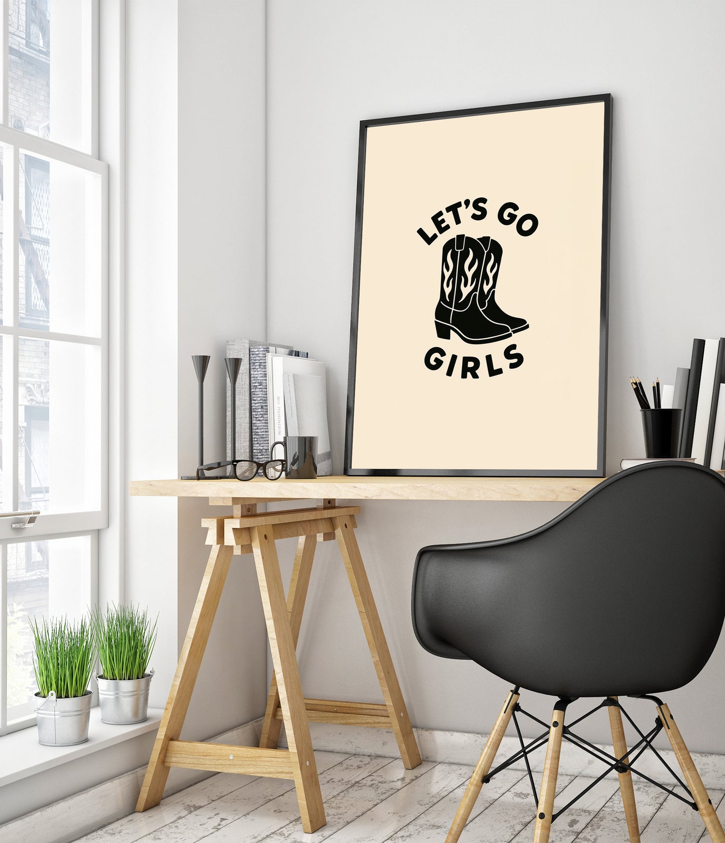 The "Let's Go Girls" poster features bold, typographic graphics with a central image of black cowboy boots adorned with flame accents. This playful, beige-background design embodies a fun, empowering message perfect for modern, stylish spaces. Ideal for enthusiasts of graphic and typographic art, this piece combines simplicity with a spirited, adventurous theme.