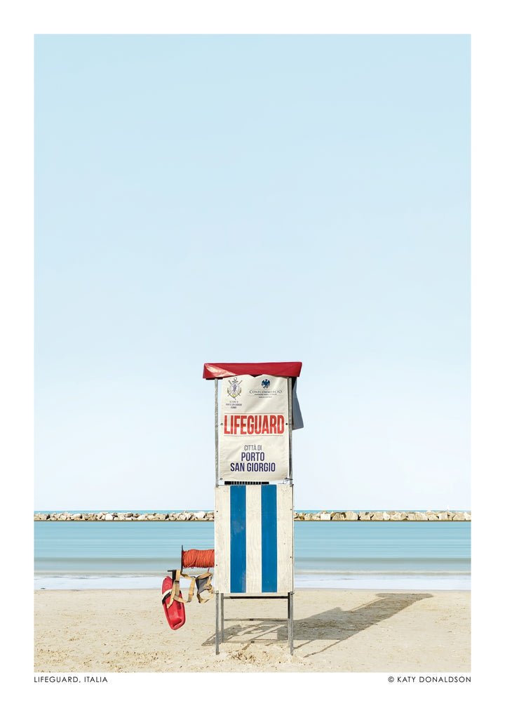 This minimalist poster titled "Lifeguard, Italia" by Katy Donaldson captures a tranquil beach scene in Italy. The focus is on a lifeguard tower with its striking blue and white stripes, set against the serene backdrop of the Mediterranean Sea. The photograph beautifully blends simplicity with modern elegance, perfect for adding a touch of coastal charm to any space.