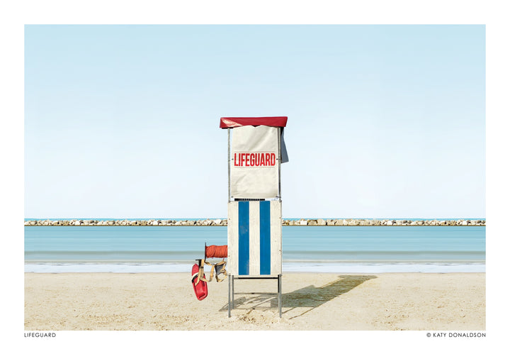 "Lifeguard, Italia" by Katy Donaldson captures a minimalist beach scene with a lifeguard stand set against the serene Mediterranean Sea. The lifeguard stand is centrally positioned, with clean lines and a calming colour palette. This modern photographic landscape poster evokes a sense of tranquility and simplicity, ideal for enhancing a contemporary living space.