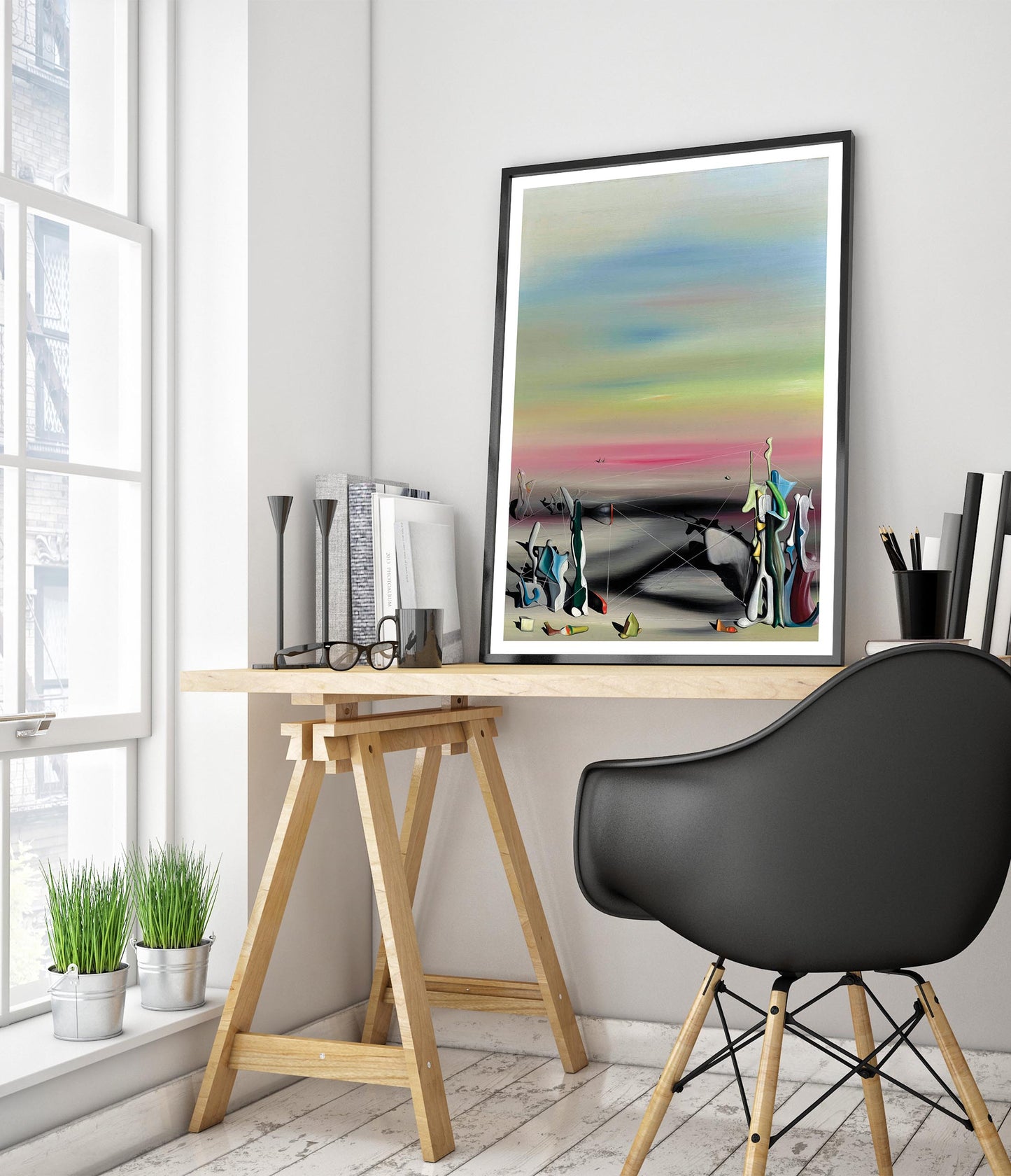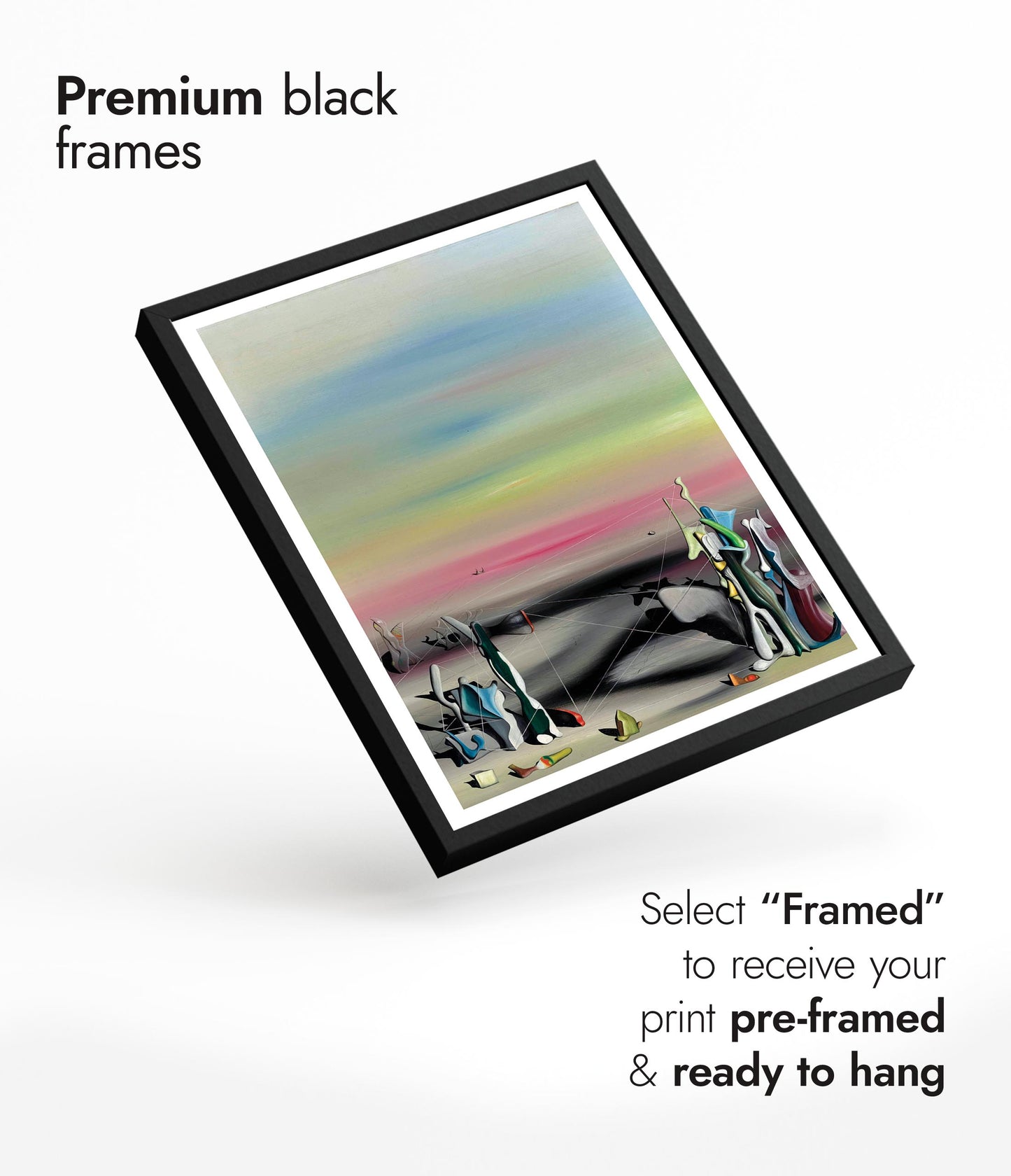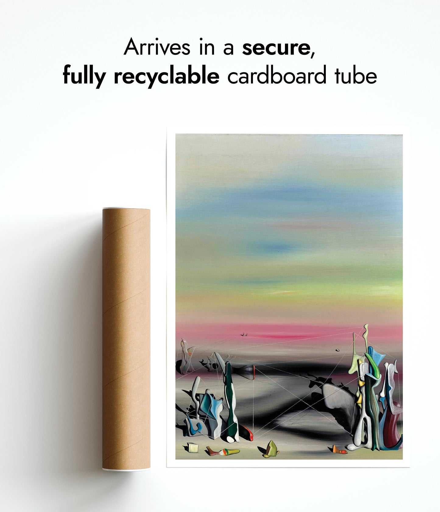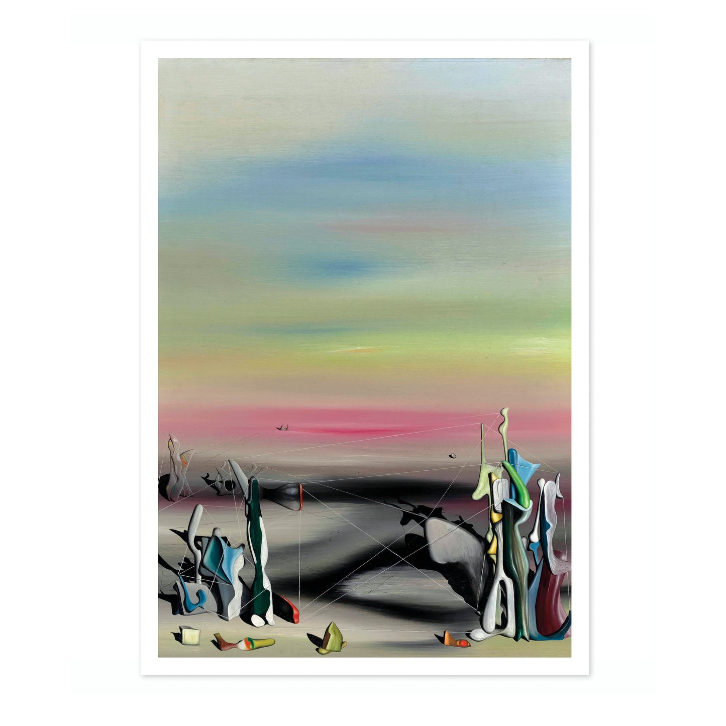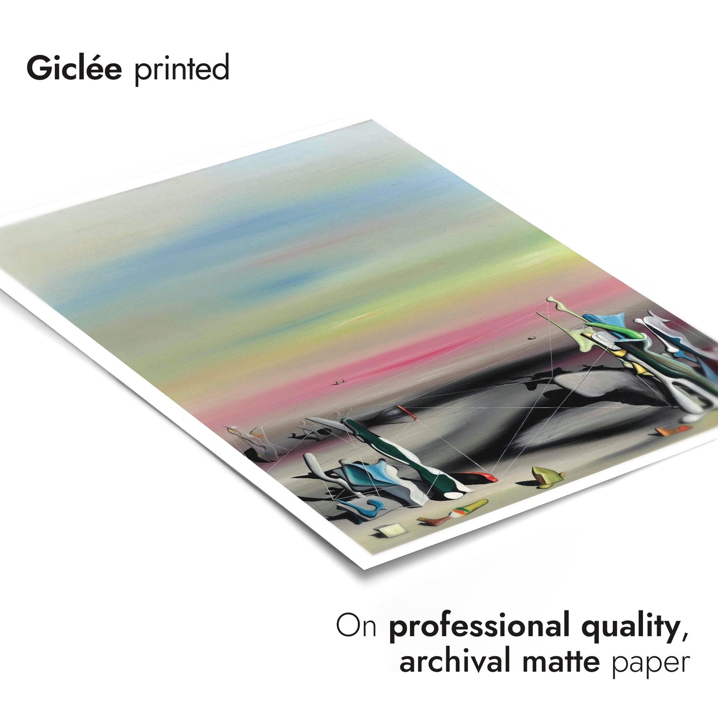 This surrealist poster titled "Light Loneliness" by Yves Tanguy features abstract, elongated shapes set against a dreamy, gradient sky ranging from soft blues to delicate pinks. His signature surrealism is evident in the otherworldly landscape with floating objects and minimalistic colour palette, creating a sense of serene isolation. Ideal for fans of abstract art and surrealist paintings.