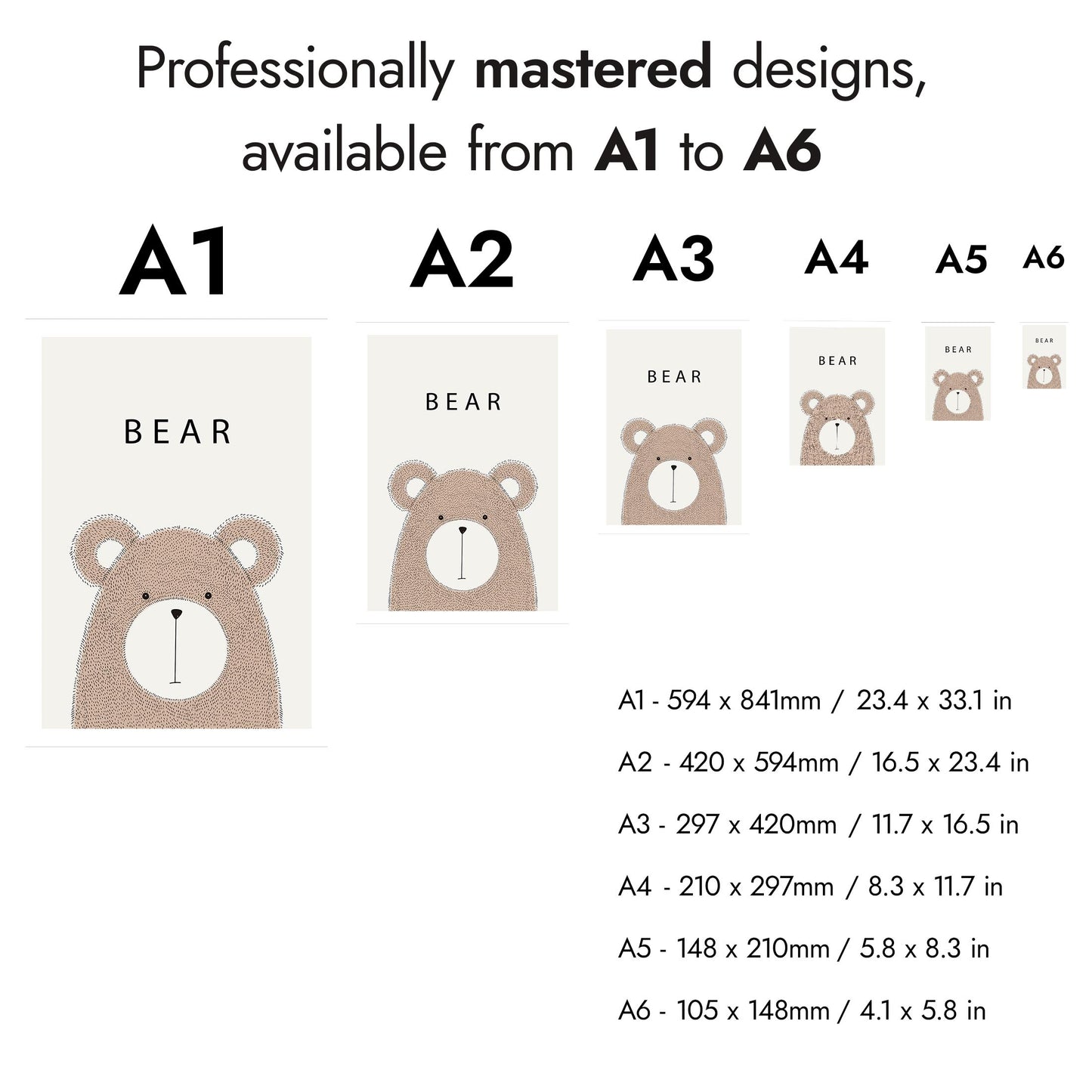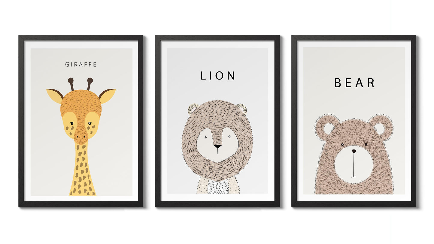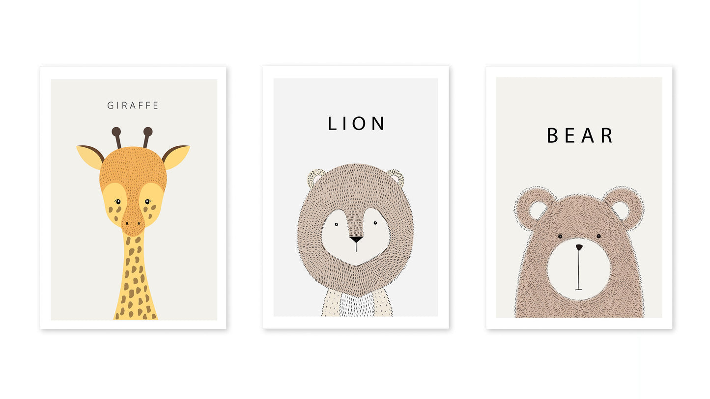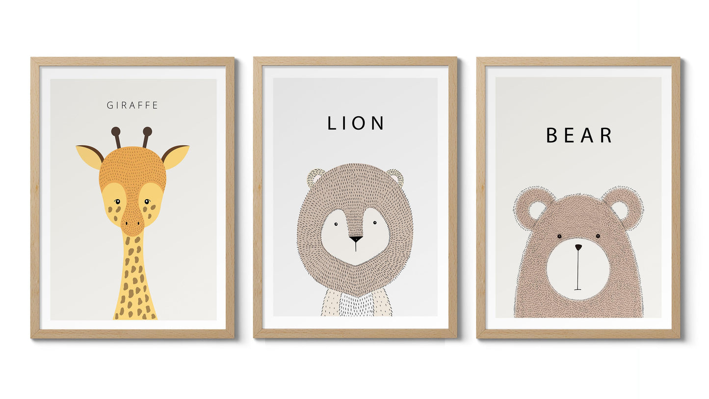 Enhance your nursery with this charming poster set featuring a giraffe, lion, and bear. Illustrated in a cute style, the animals stand out against soft beige and grey tones with yellow accents, delivering warmth and playfulness. Ideal for a safari or animal-themed decor, these posters subtly introduce African wildlife into your child's space. Perfectly suited for any children's room.