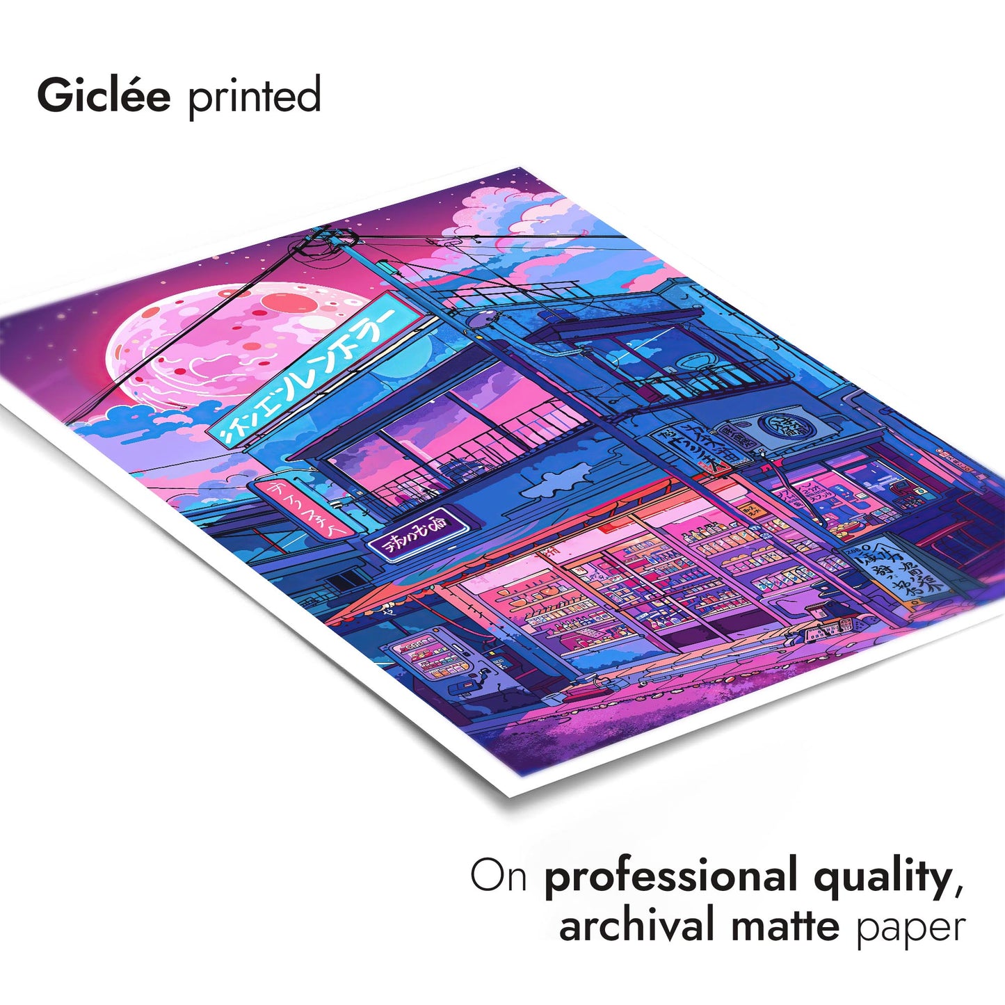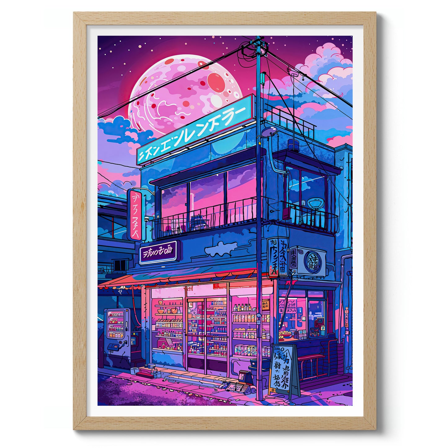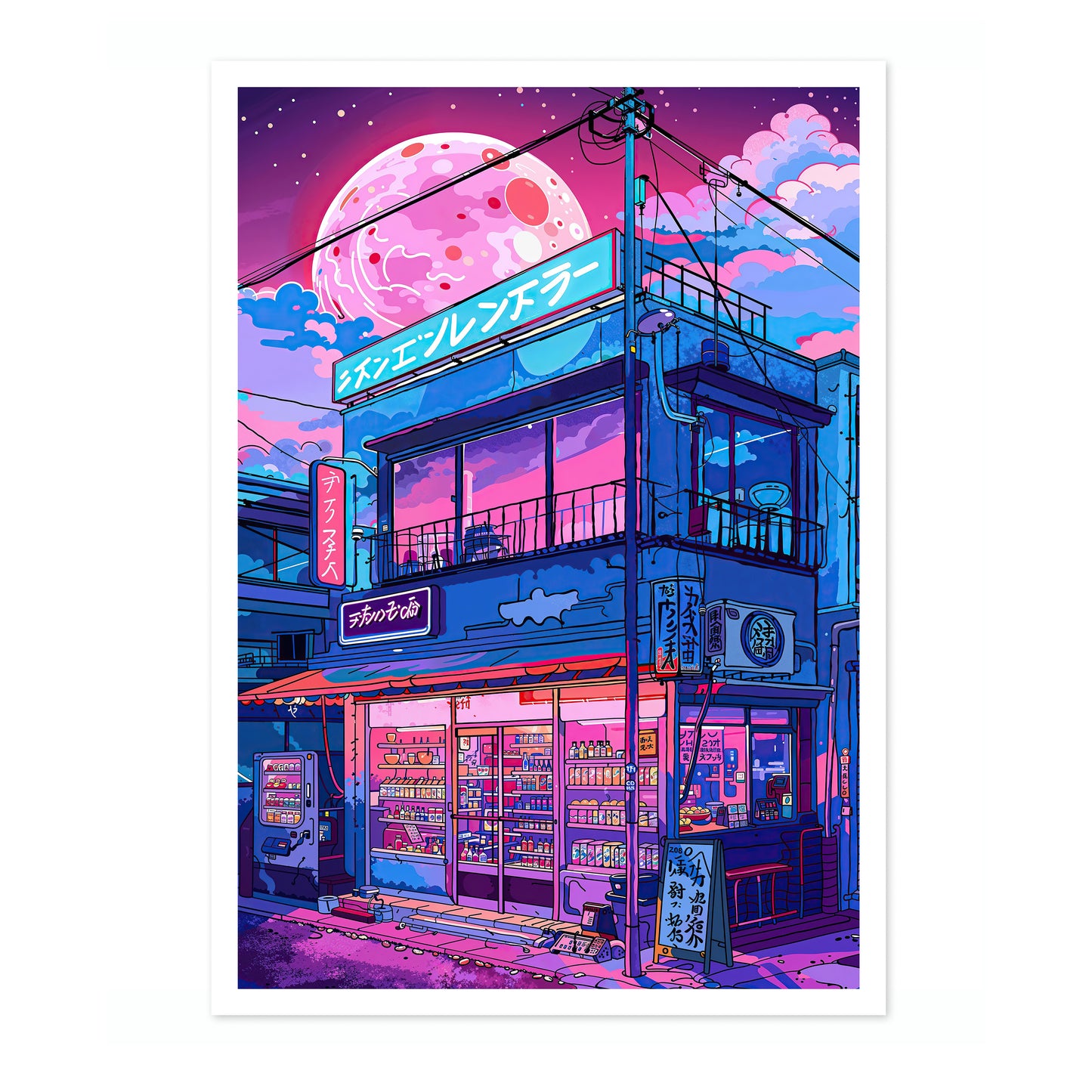Capture the allure of Japanese nightlife with the “Lo-fi Ramen Shop” poster. This anime-style illustration depicts a vibrant ramen shop under a large, glowing moon. Neon lights and intricate details bring this modern, lo-fi aesthetic scene to life, making it a perfect addition for fans of Japanese culture and night street art.