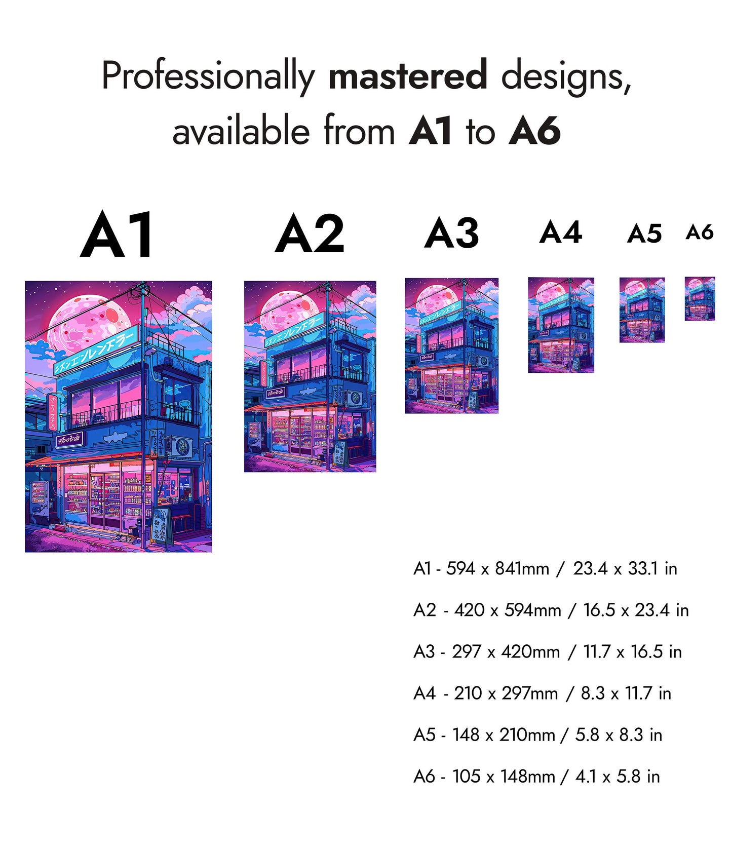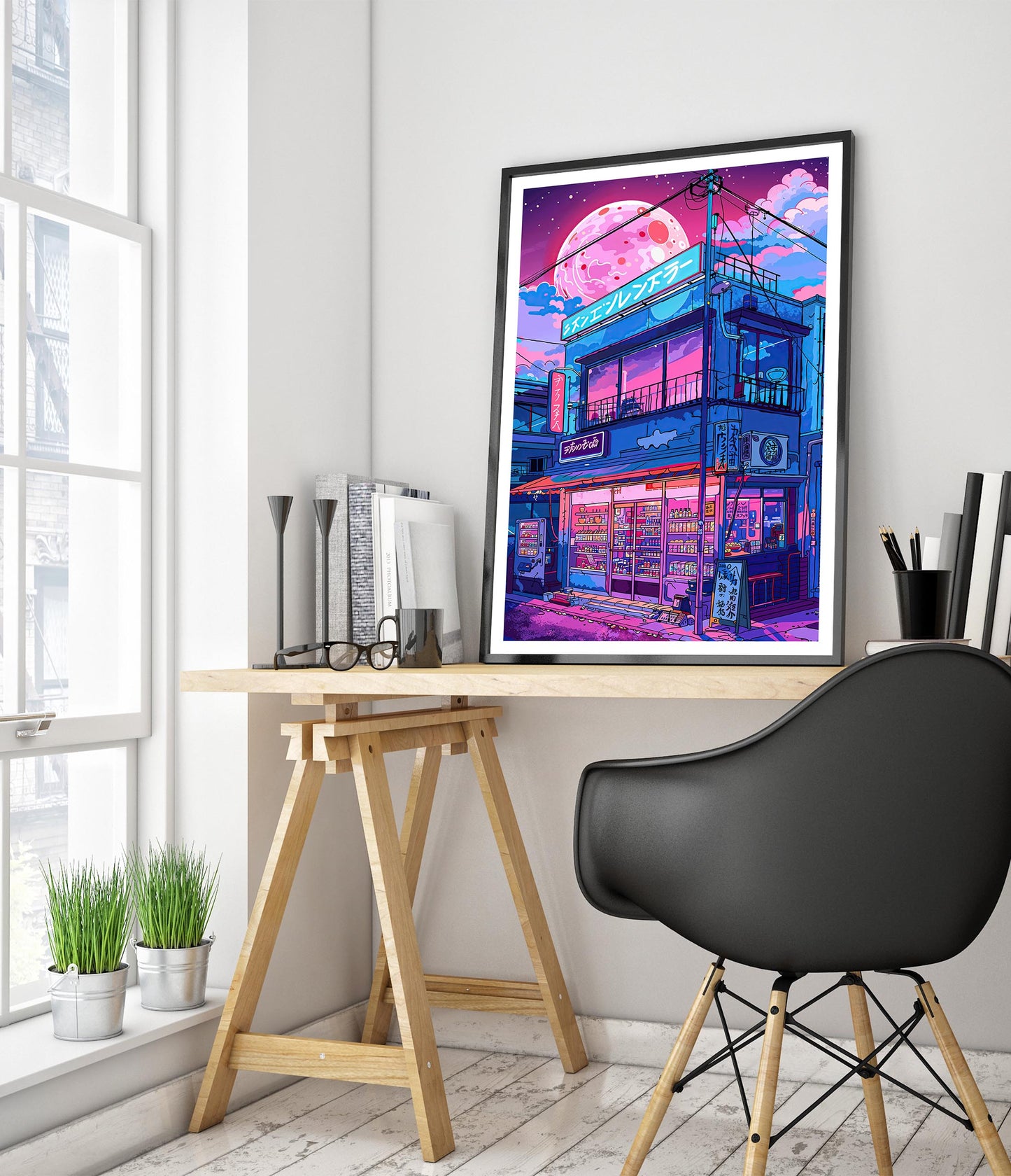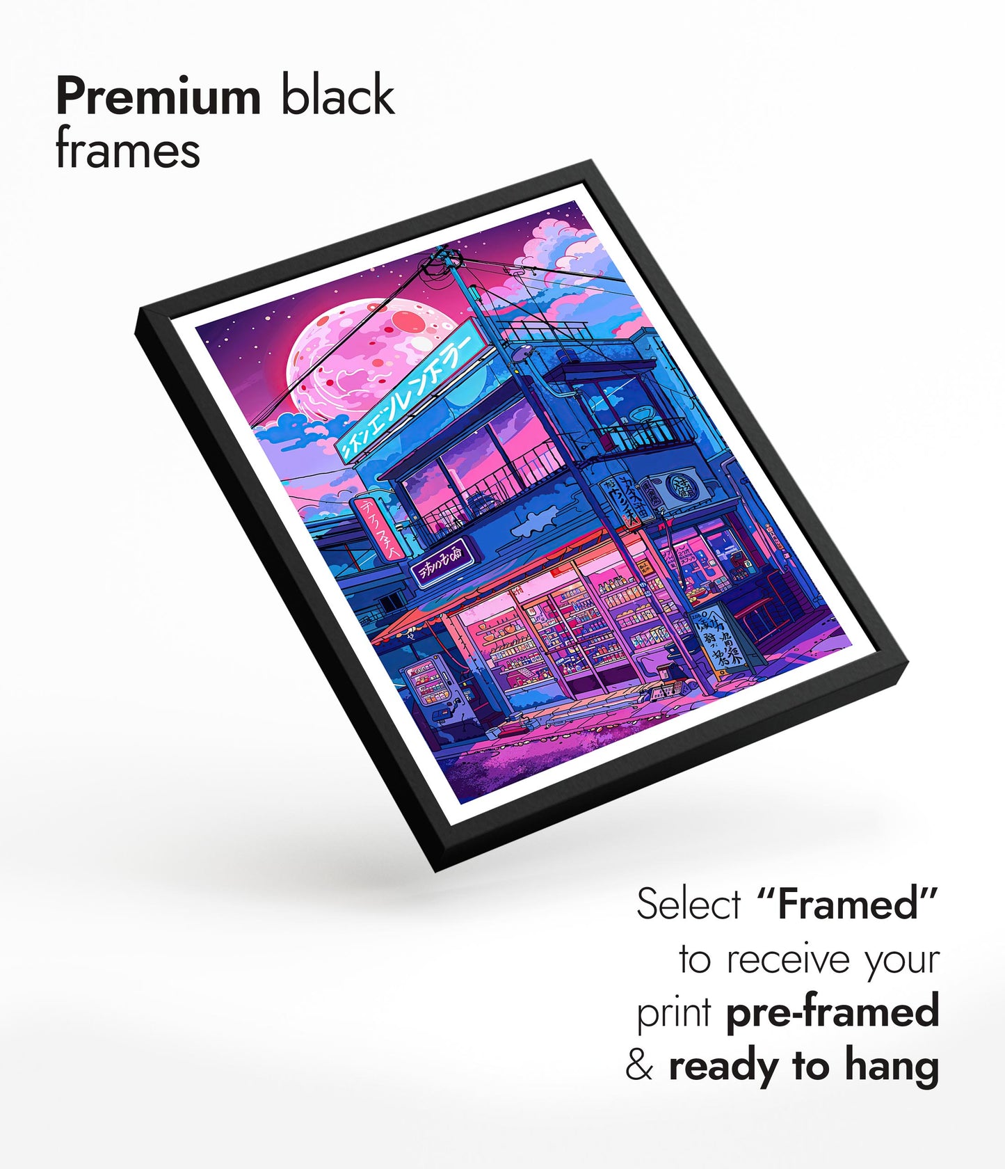 Capture the allure of Japanese nightlife with the “Lo-fi Ramen Shop” poster. This anime-style illustration depicts a vibrant ramen shop under a large, glowing moon. Neon lights and intricate details bring this modern, lo-fi aesthetic scene to life, making it a perfect addition for fans of Japanese culture and night street art.