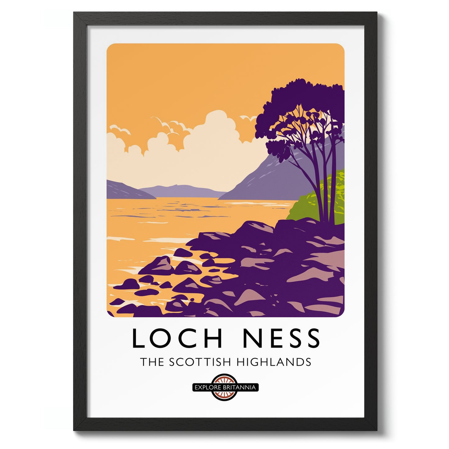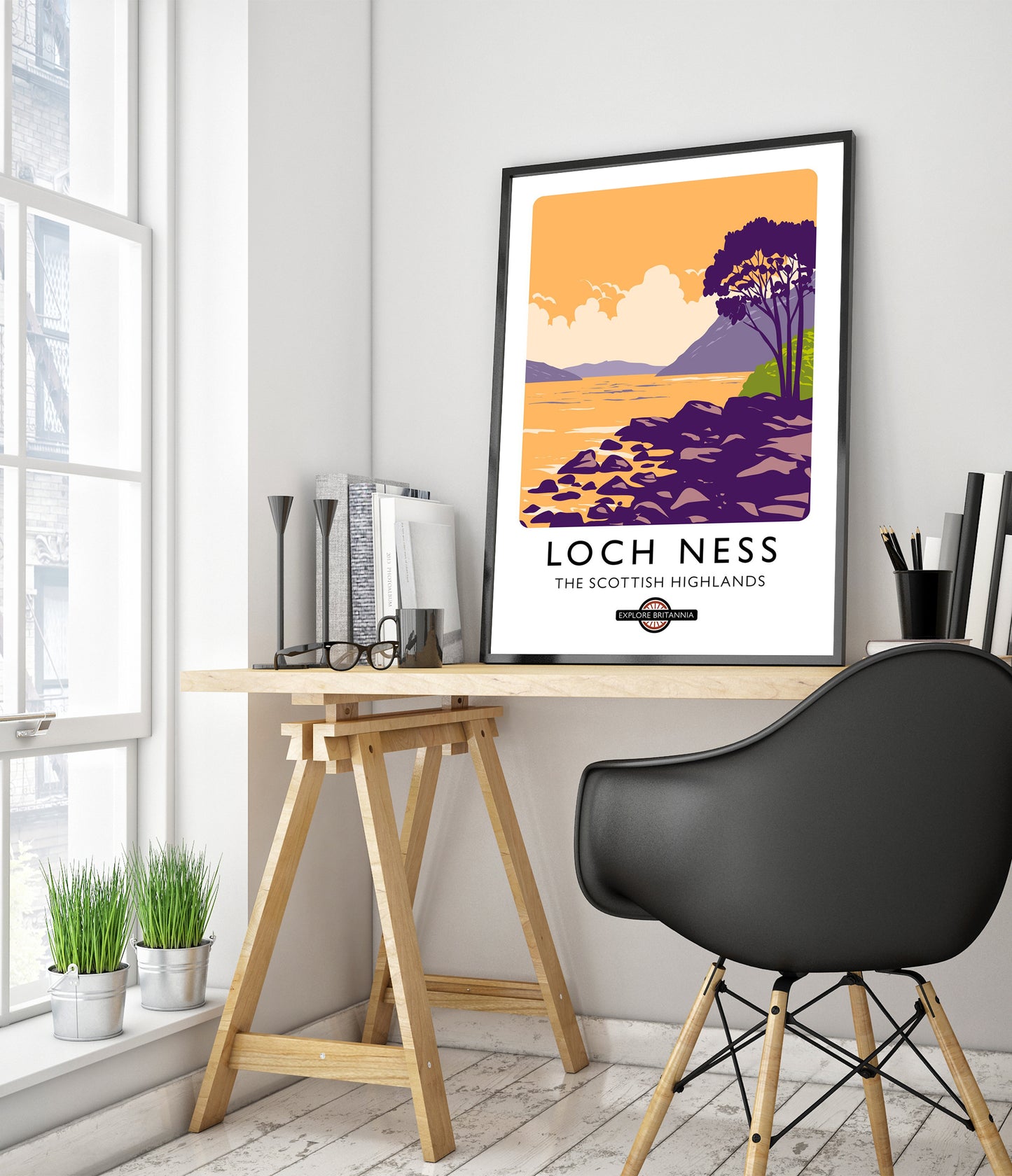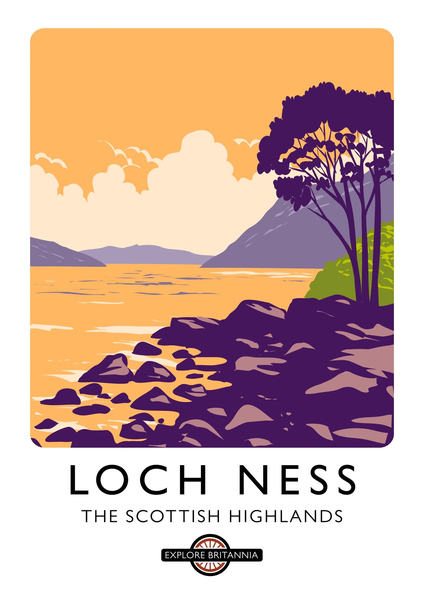 This Loch Ness poster captures the enchanting allure of the Scottish Highlands, with its distinctive graphic illustration style. The artwork features a serene lake, framed by rugged hills and silhouetted trees against an orange-hued sky. Perfect for travel enthusiasts, it invites viewers to explore Britain's scenic beauty. Ideal for adding a touch of wanderlust to any space.