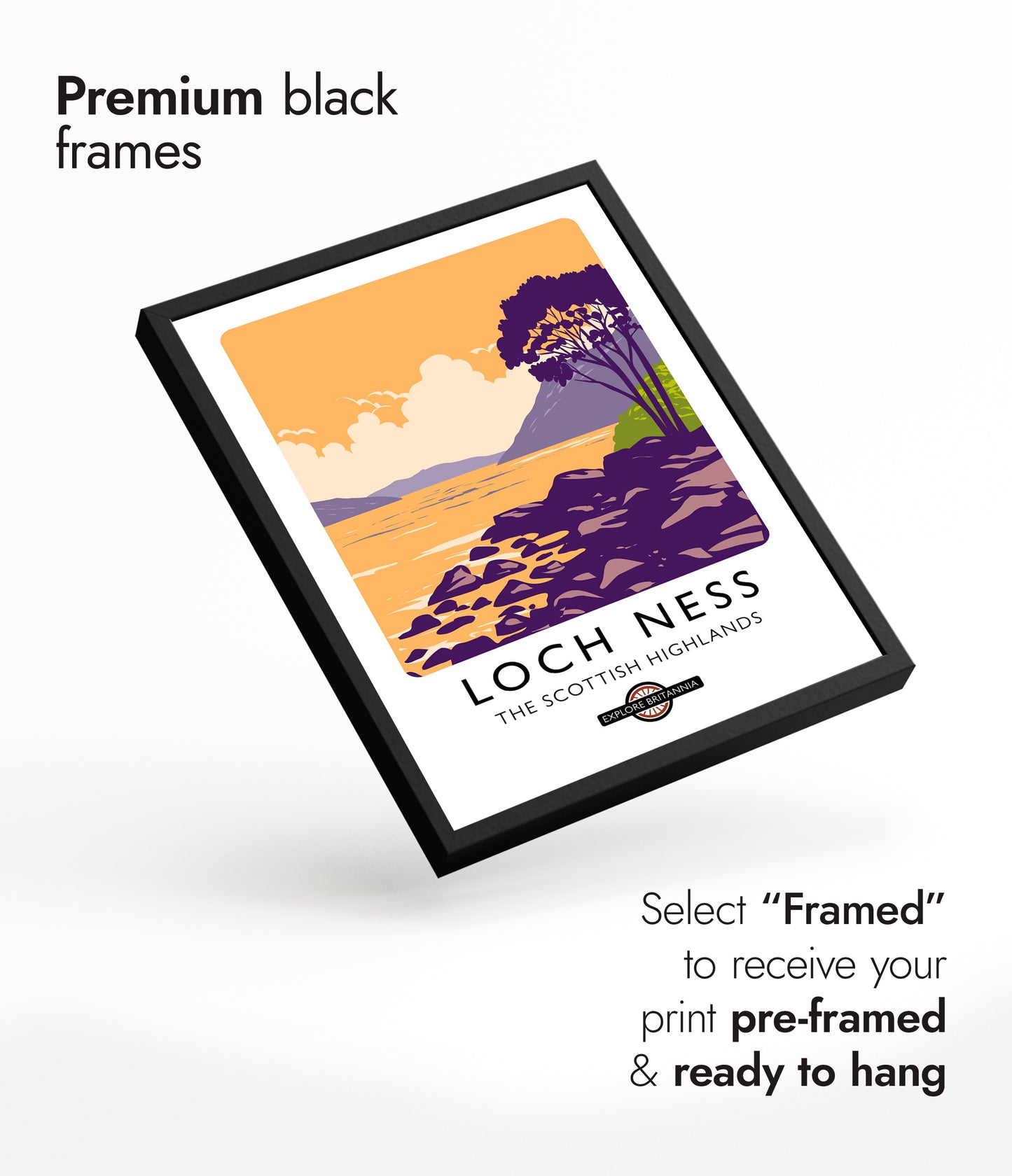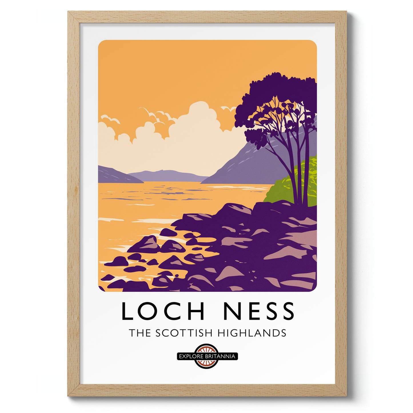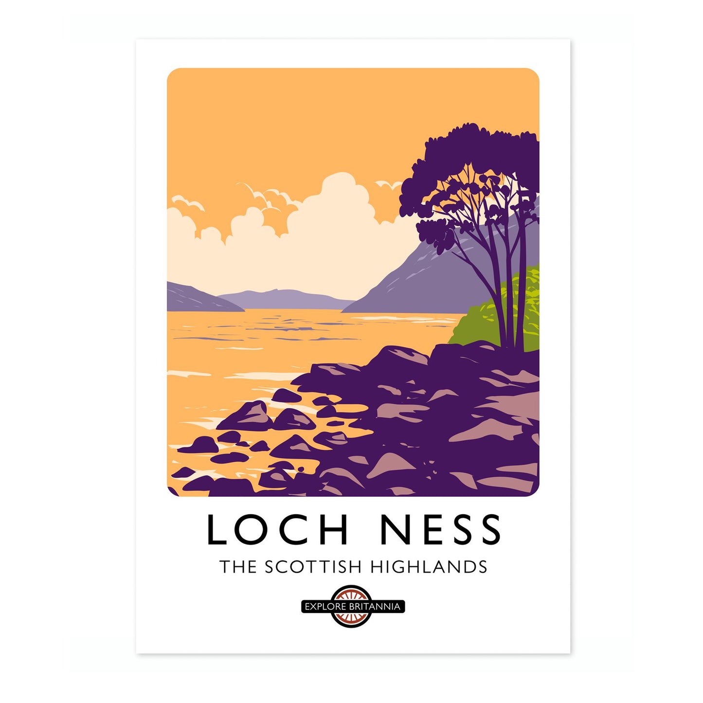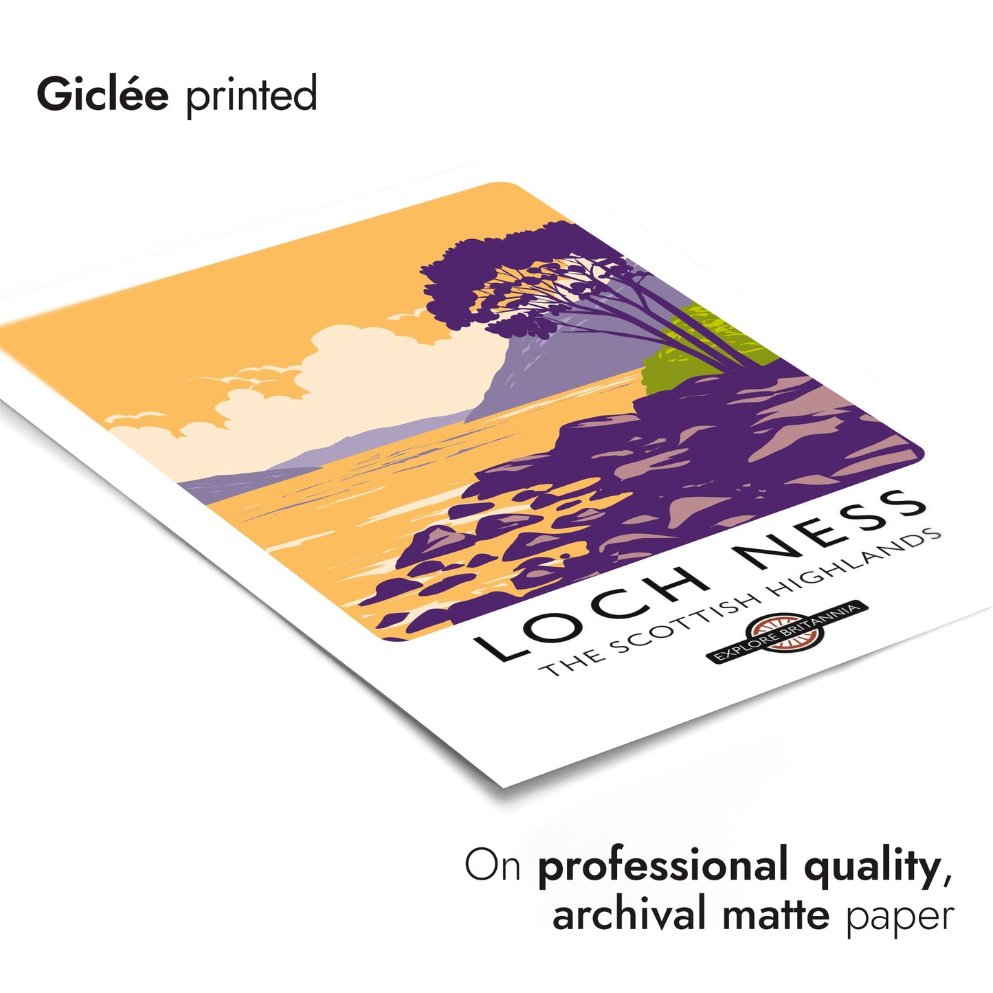 This Loch Ness poster captures the enchanting allure of the Scottish Highlands, with its distinctive graphic illustration style. The artwork features a serene lake, framed by rugged hills and silhouetted trees against an orange-hued sky. Perfect for travel enthusiasts, it invites viewers to explore Britain's scenic beauty. Ideal for adding a touch of wanderlust to any space.