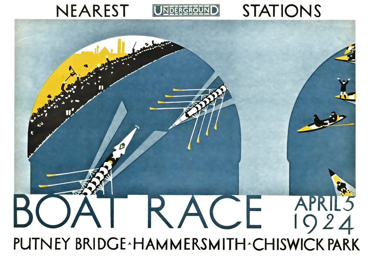 This vintage-inspired poster, "London Boat Race - 1924," illustrates a lively rowing event on the River Thames. Featuring Putney Bridge, Hammersmith, and Chiswick Park, the artwork showcases rowers in action, framed by iconic London Underground design elements. Ideal for sports enthusiasts and lovers of historical London, this illustration captures the excitement and tradition of the annual boat race.