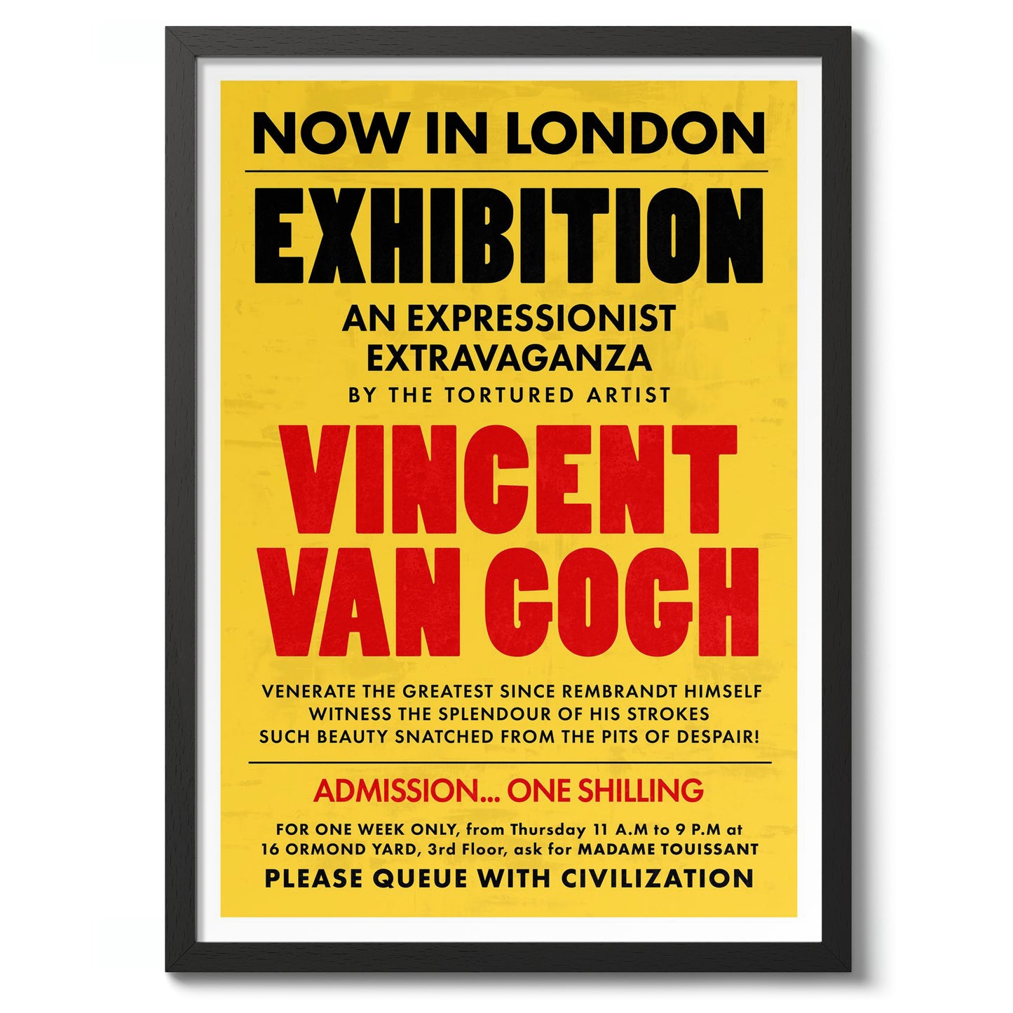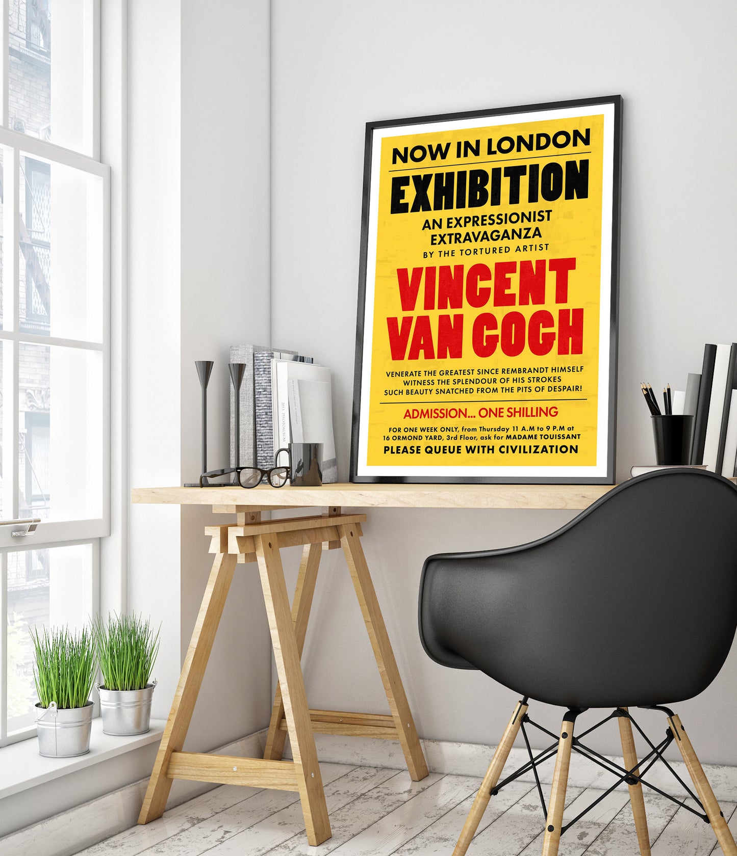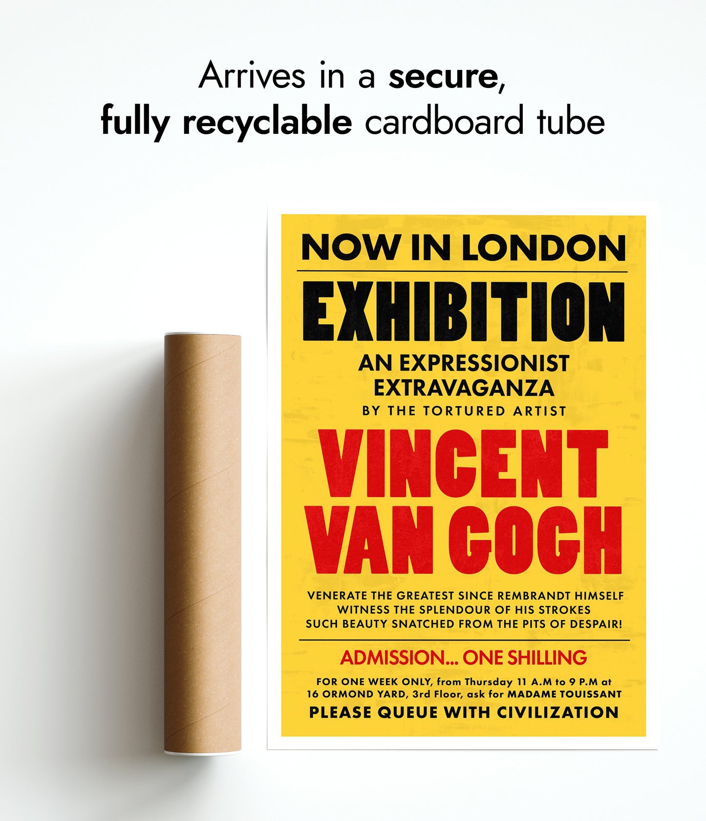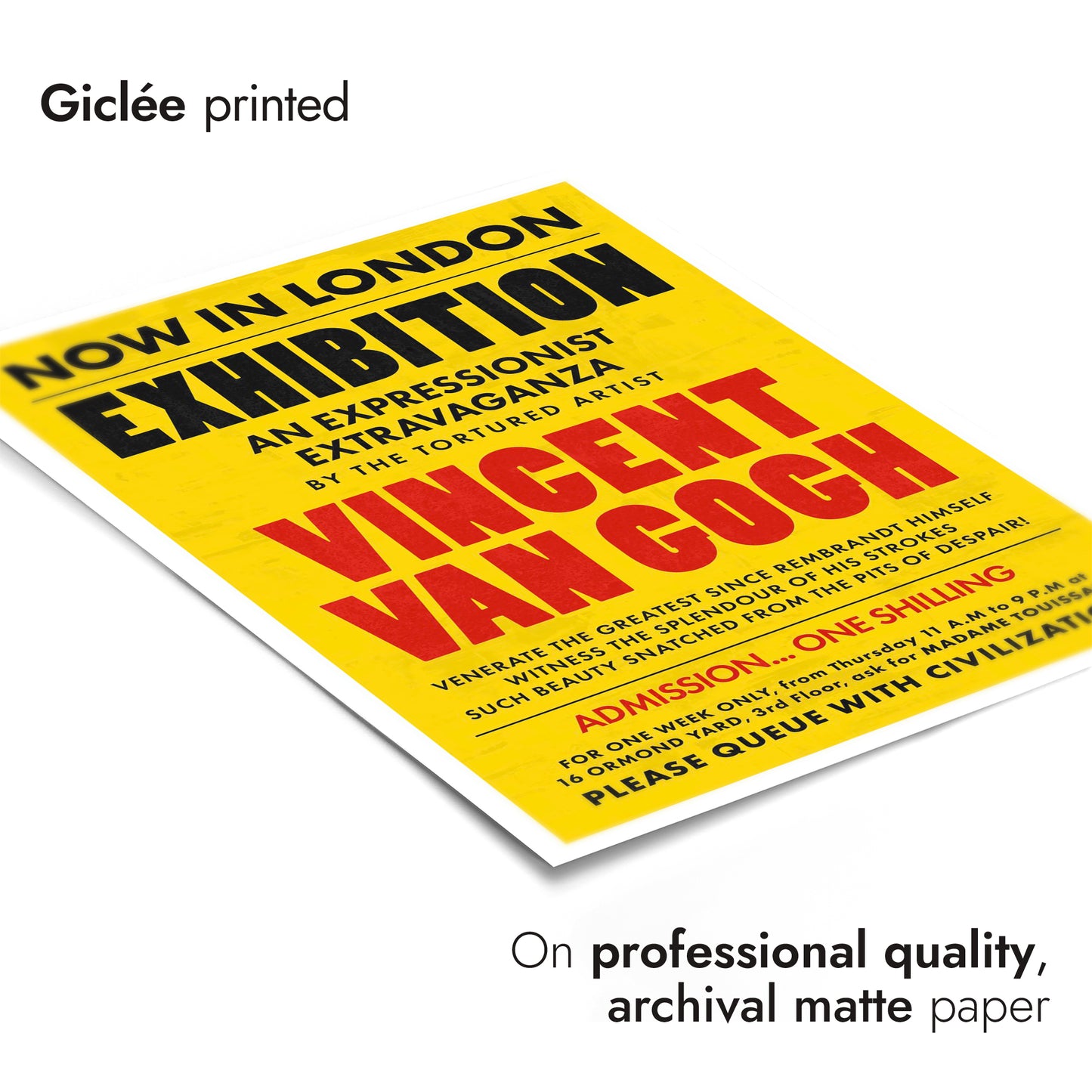 This striking poster advertises a Vincent Van Gogh exhibition in London, featuring bold typography in black and red against a vibrant yellow background. Emphasizing the artist's expressive style, this vintage advertisement conveys excitement, inviting viewers to witness Van Gogh's masterful strokes. Ideal for fans of art history and vintage posters, it captures the essence of post-impressionism and the allure of past art exhibitions.