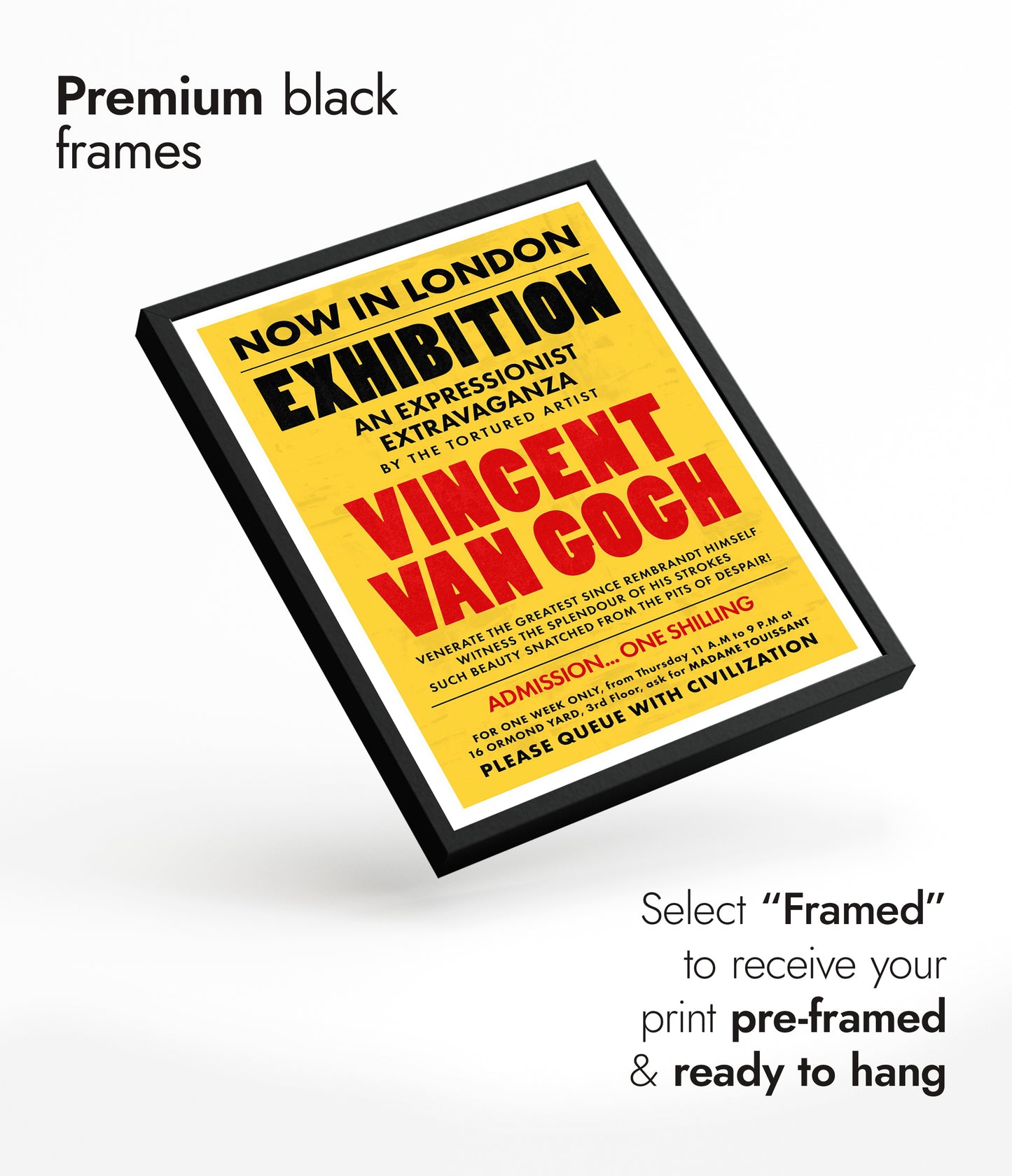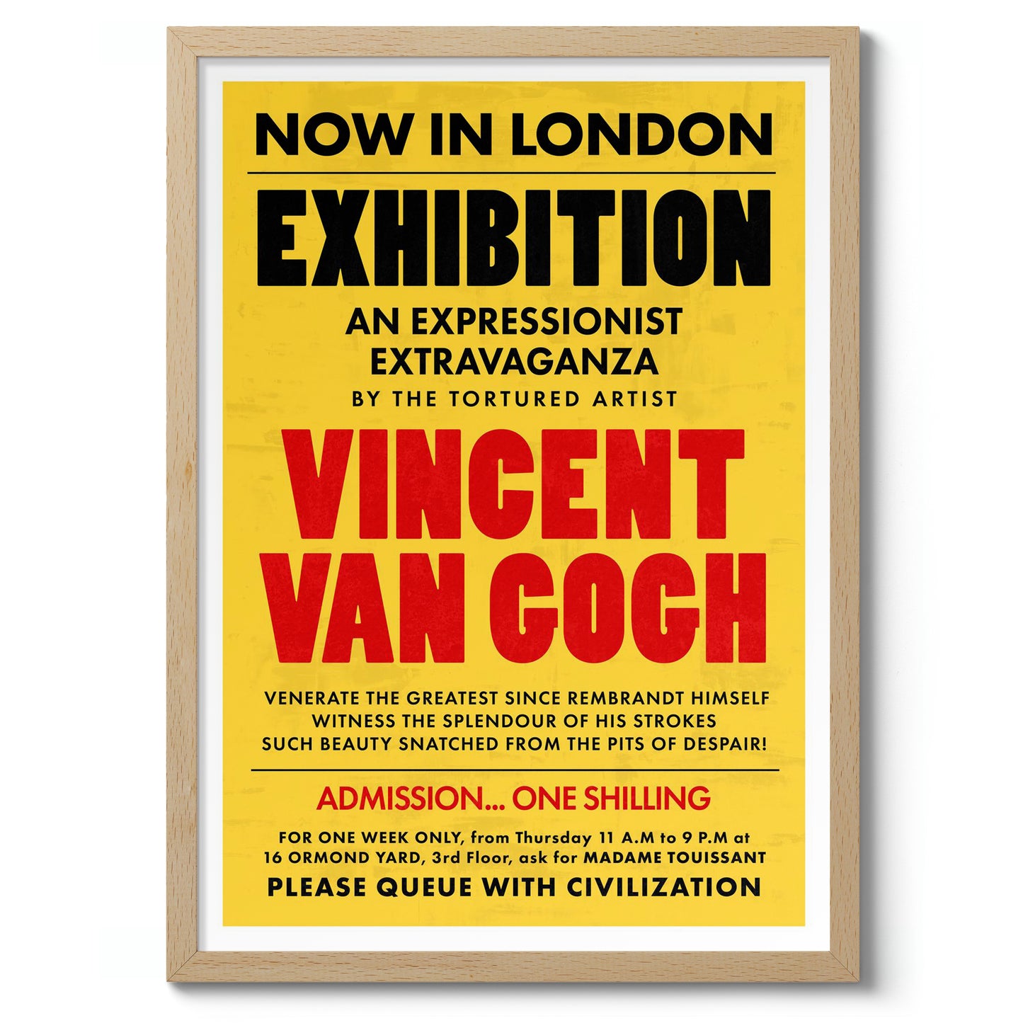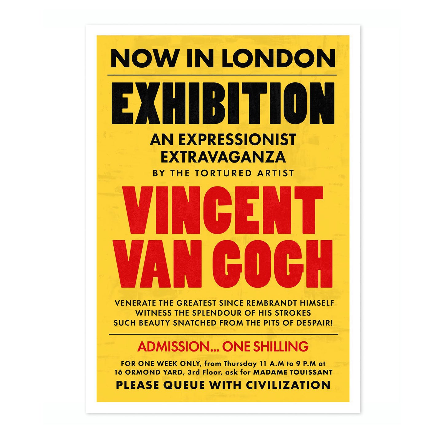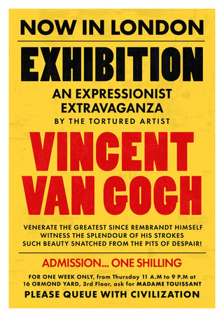 This striking poster advertises a Vincent Van Gogh exhibition in London, featuring bold typography in black and red against a vibrant yellow background. Emphasizing the artist's expressive style, this vintage advertisement conveys excitement, inviting viewers to witness Van Gogh's masterful strokes. Ideal for fans of art history and vintage posters, it captures the essence of post-impressionism and the allure of past art exhibitions.