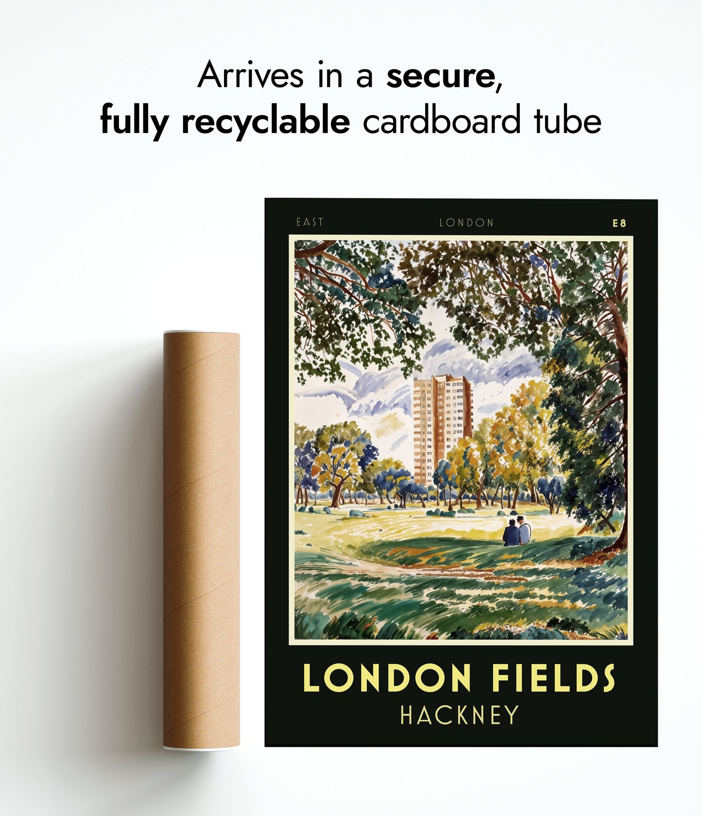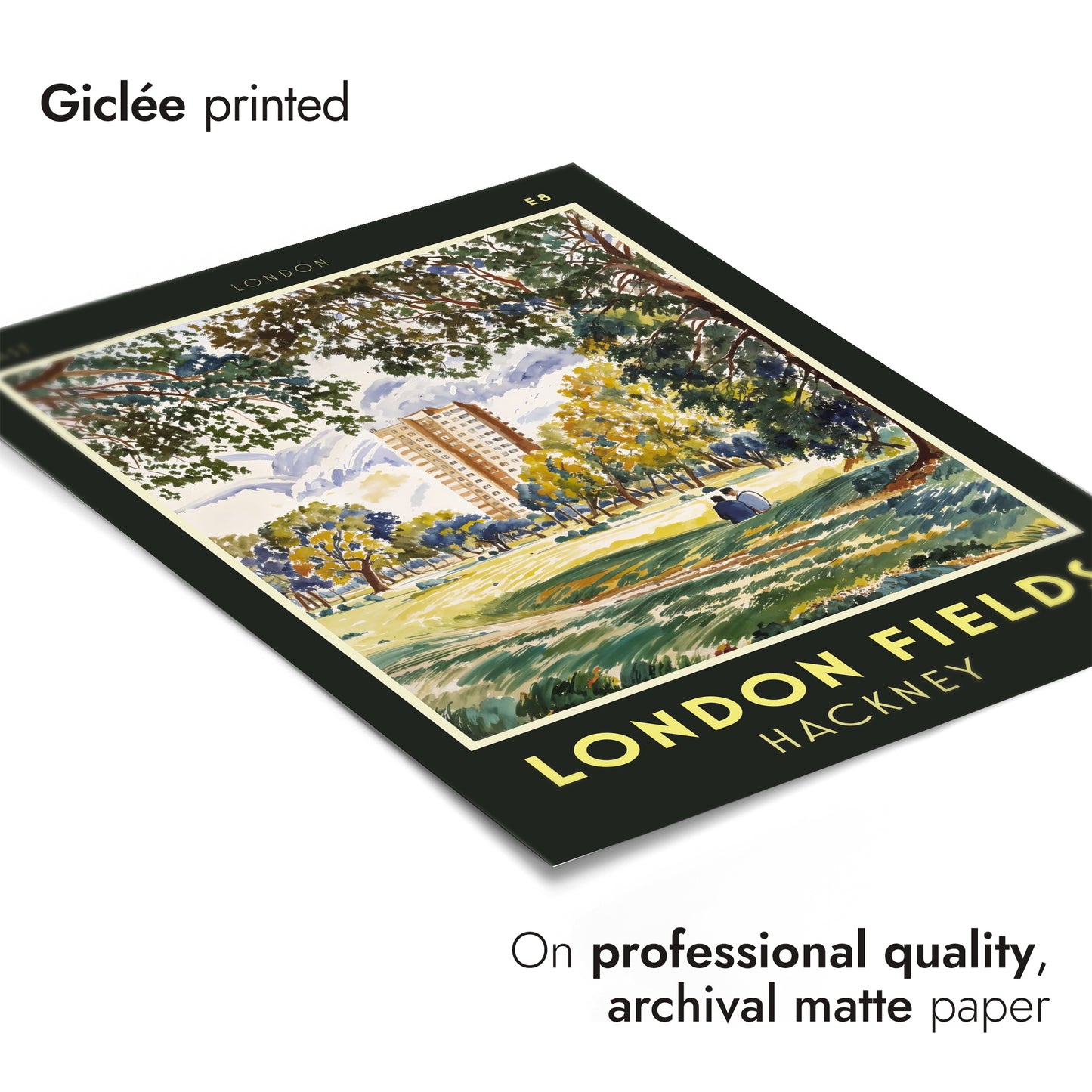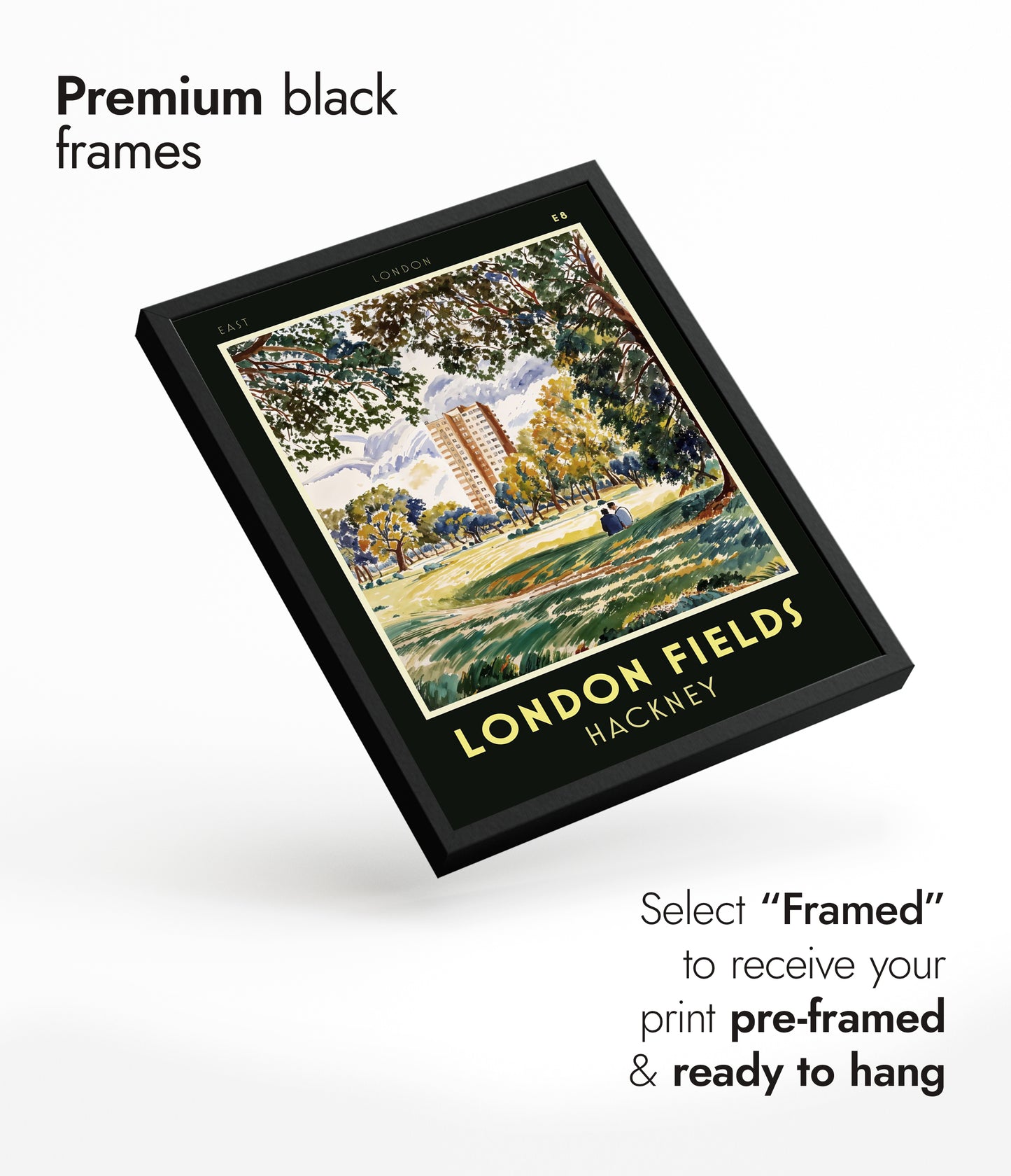 This vintage illustration poster of London Fields, Hackney captures a scenic view of East London, featuring a serene park with lush trees framing a central high-rise building. The warm tones of the foliage contrast with the black border, evoking a nostalgic charm. Ideal for those appreciating urban landscapes and traditional English park scenes. Perfect for travel and London-themed decor.