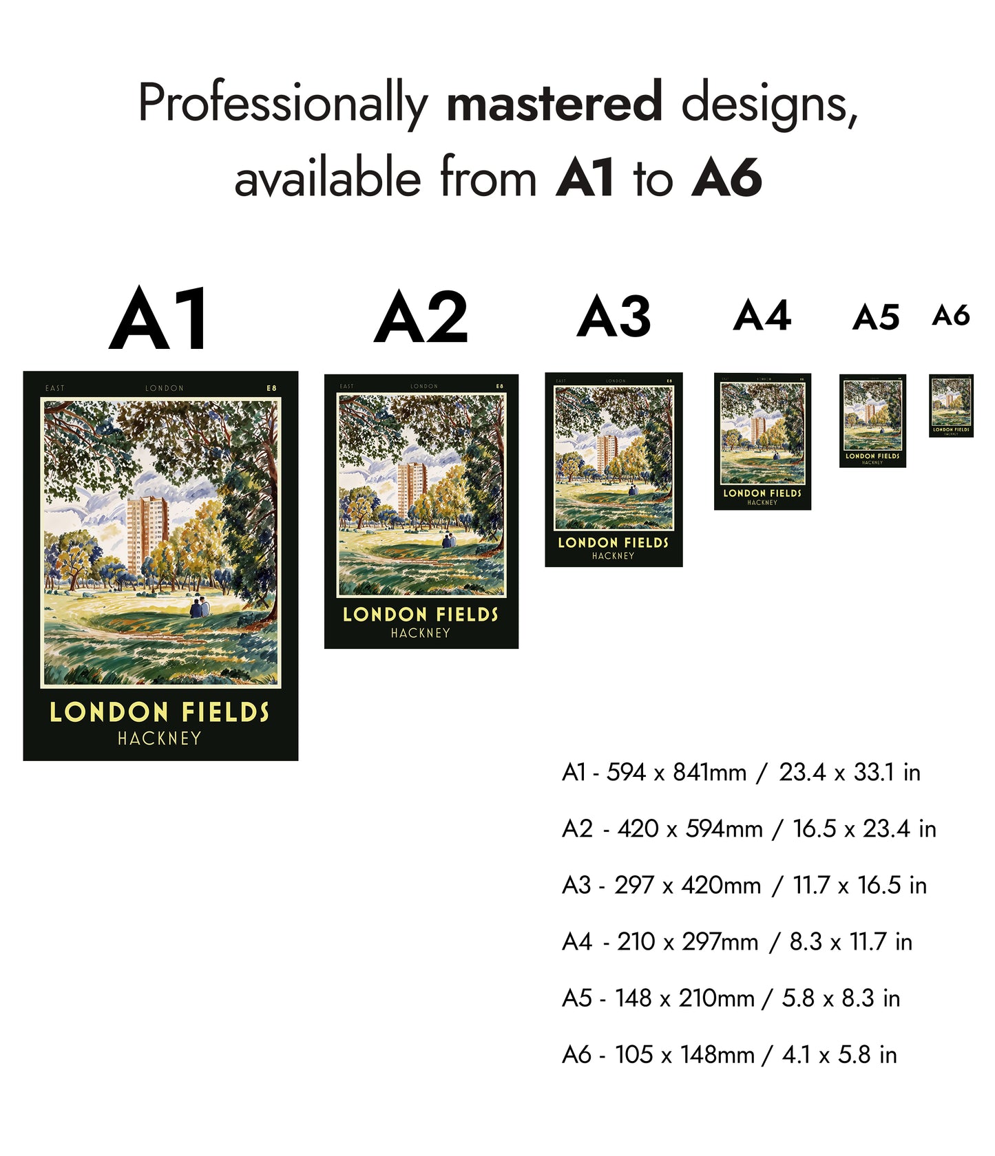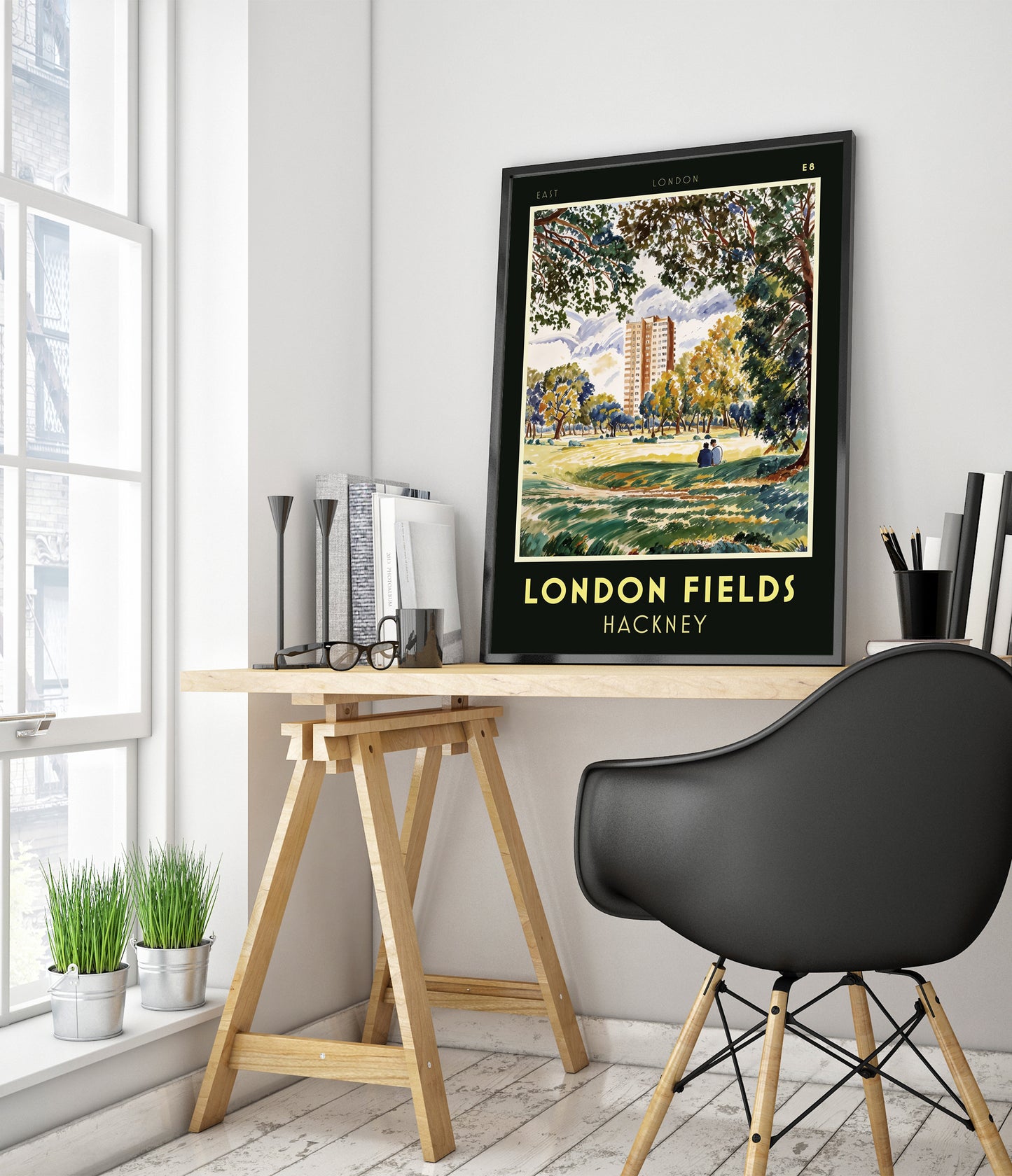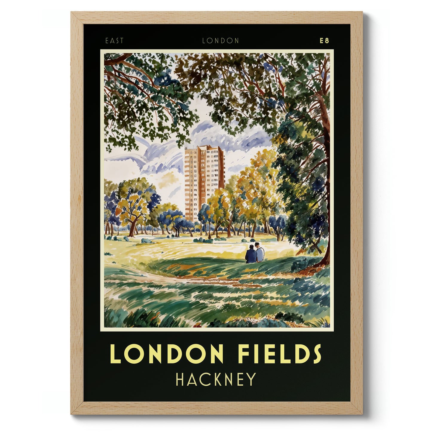This vintage illustration poster of London Fields, Hackney captures a scenic view of East London, featuring a serene park with lush trees framing a central high-rise building. The warm tones of the foliage contrast with the black border, evoking a nostalgic charm. Ideal for those appreciating urban landscapes and traditional English park scenes. Perfect for travel and London-themed decor.