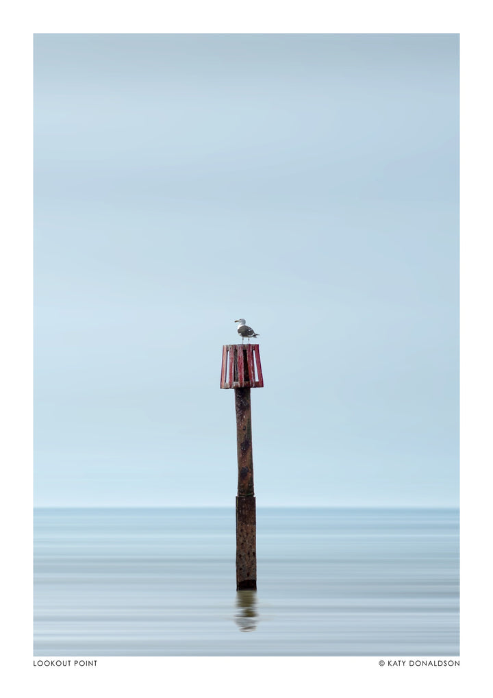 "Lookout Point" by Katy Donaldson captures a solitary seagull perched atop a weathered sea marker against a backdrop of serene, misty waters. This photographic, modern, and minimalist art print exudes tranquility, making it a perfect addition to any coastal or nature-themed decor. The subtle hues and simple composition enhance the calming effect, ideal for a contemporary space.