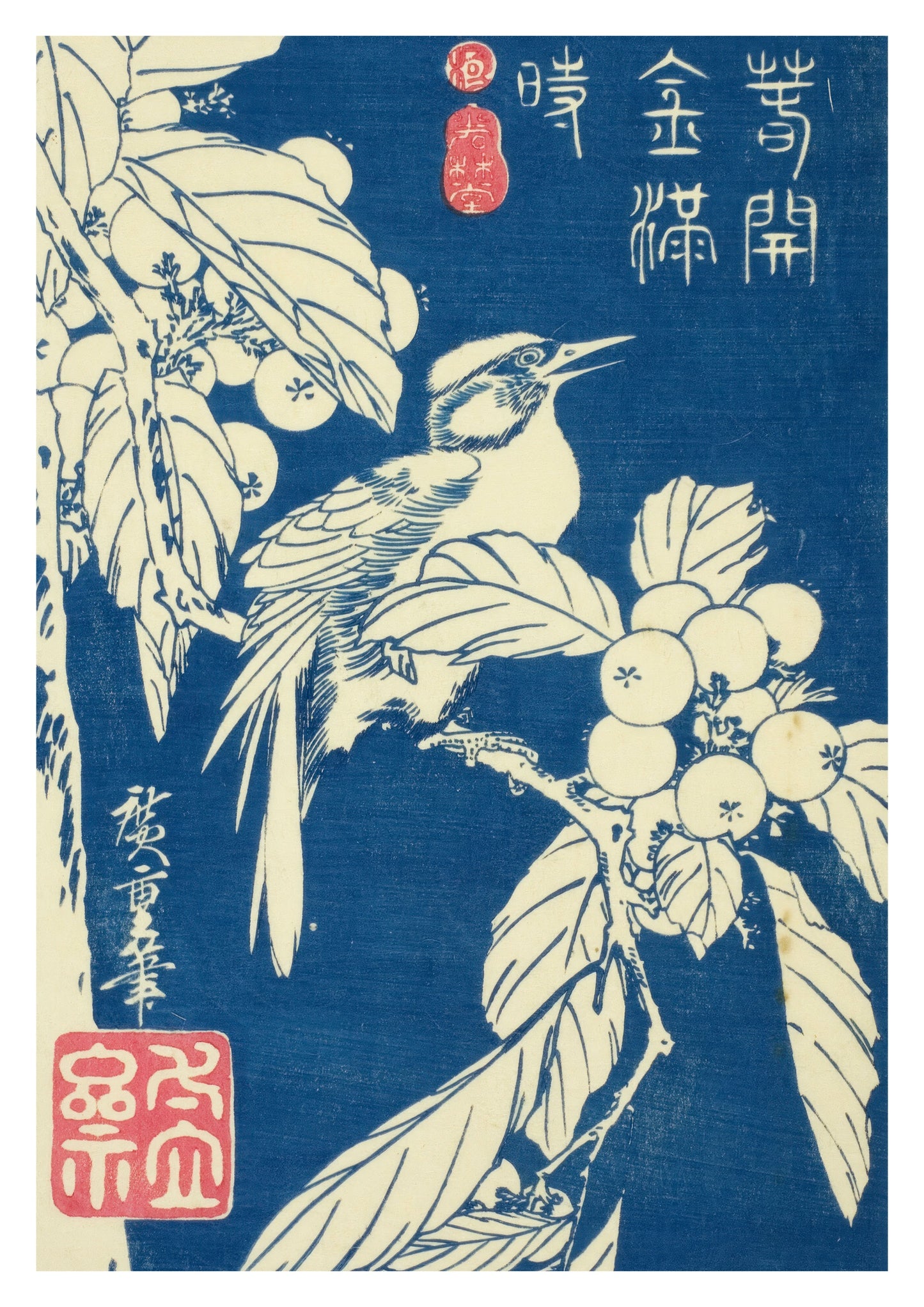 This "Loquat & Bird" poster by Utagawa Hiroshige showcases a detailed traditional Japanese woodblock illustration. Featuring a bird perched on a loquat tree, the artwork exudes tranquility with detailed foliage and fruit. The blue background and intricate linework highlight Hiroshige's mastery in ukiyo-e style. Ideal for enthusiasts of traditional Japanese art and nature-inspired themes.
