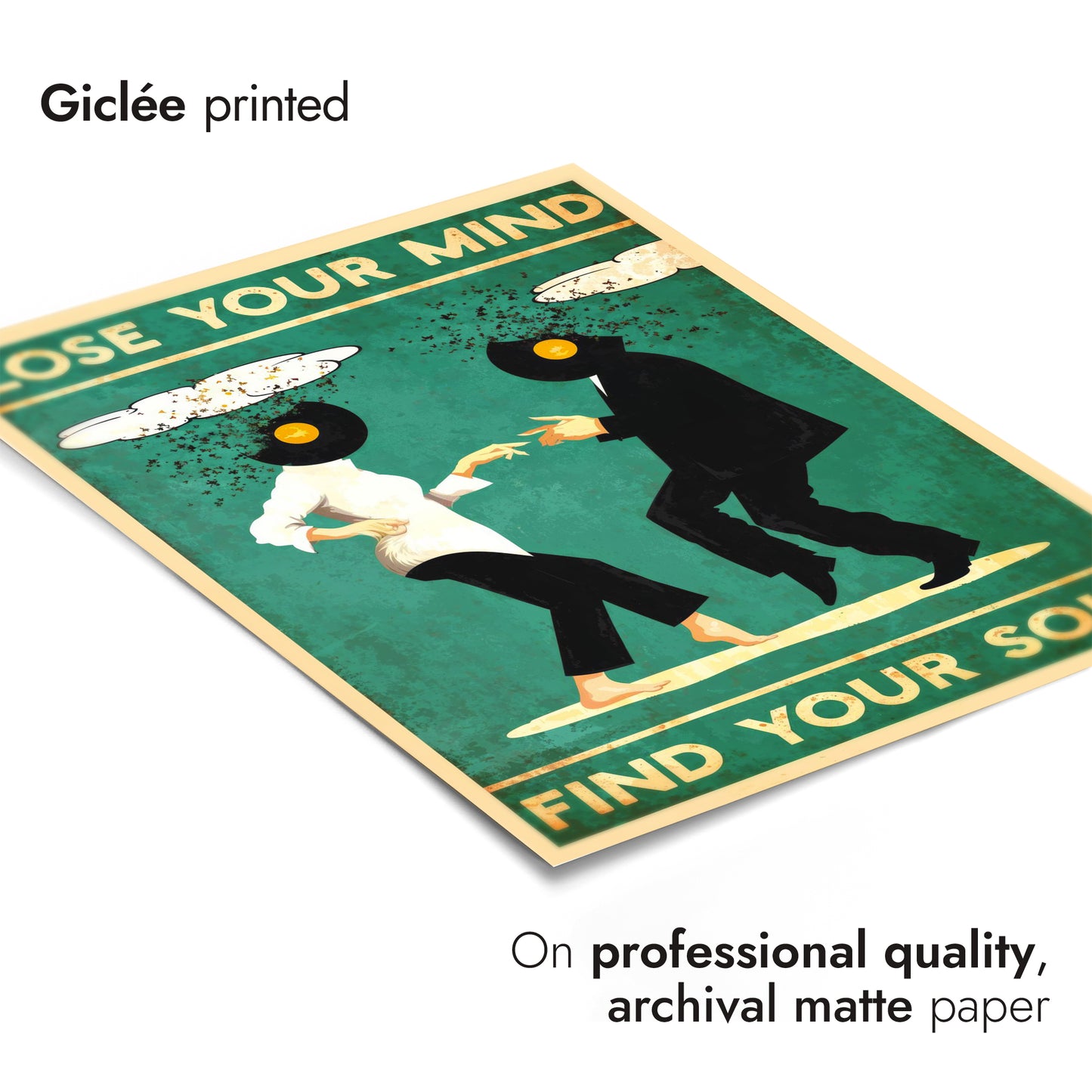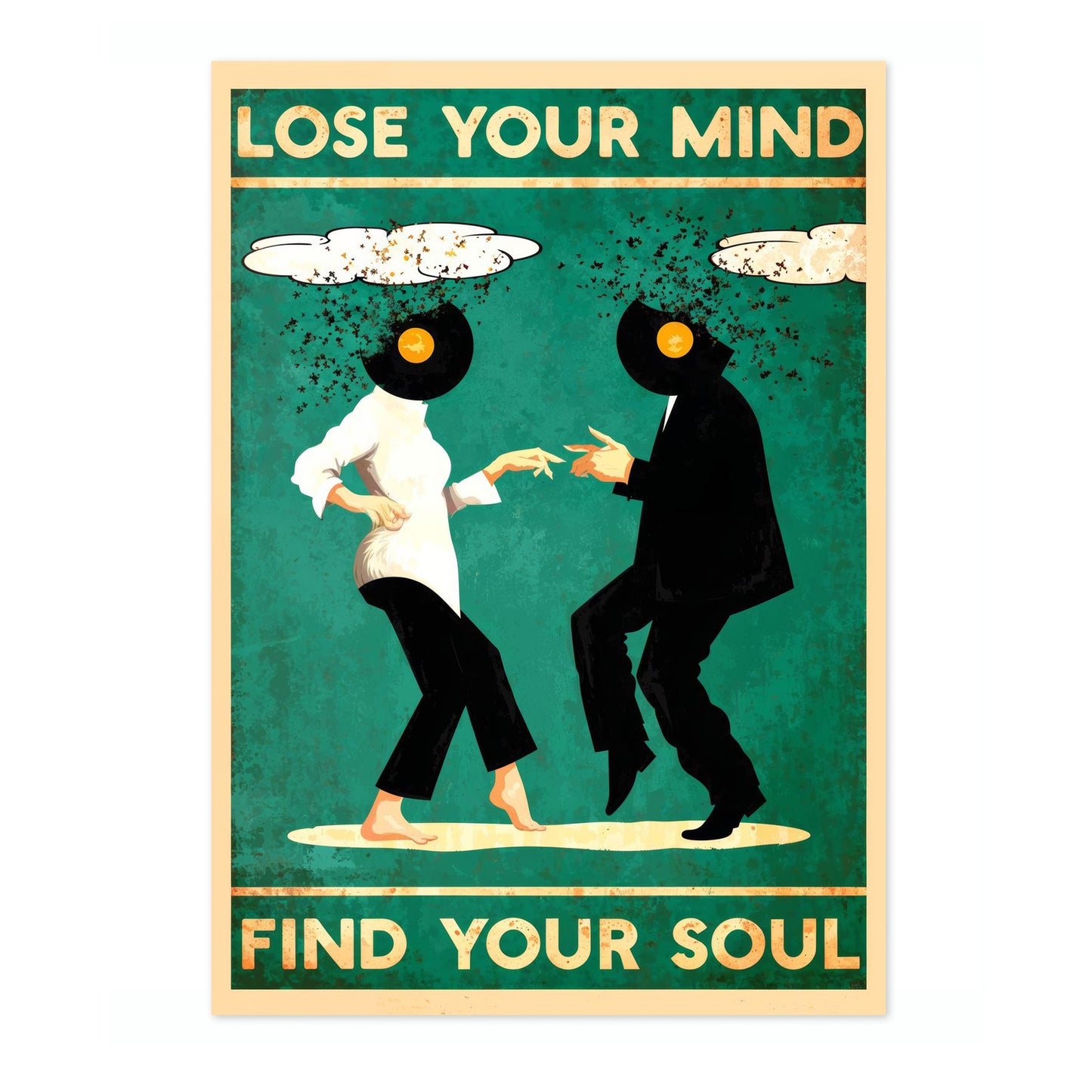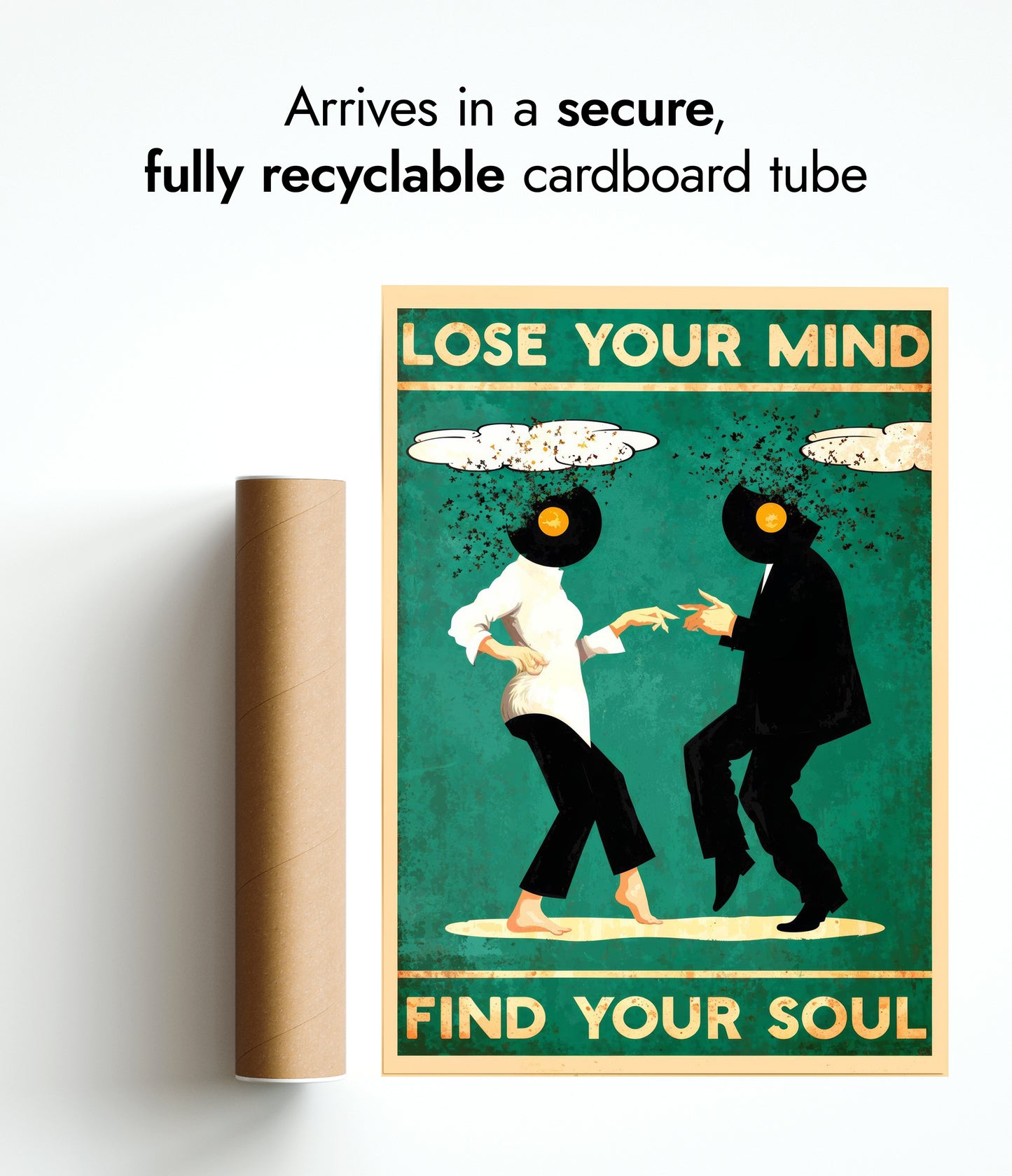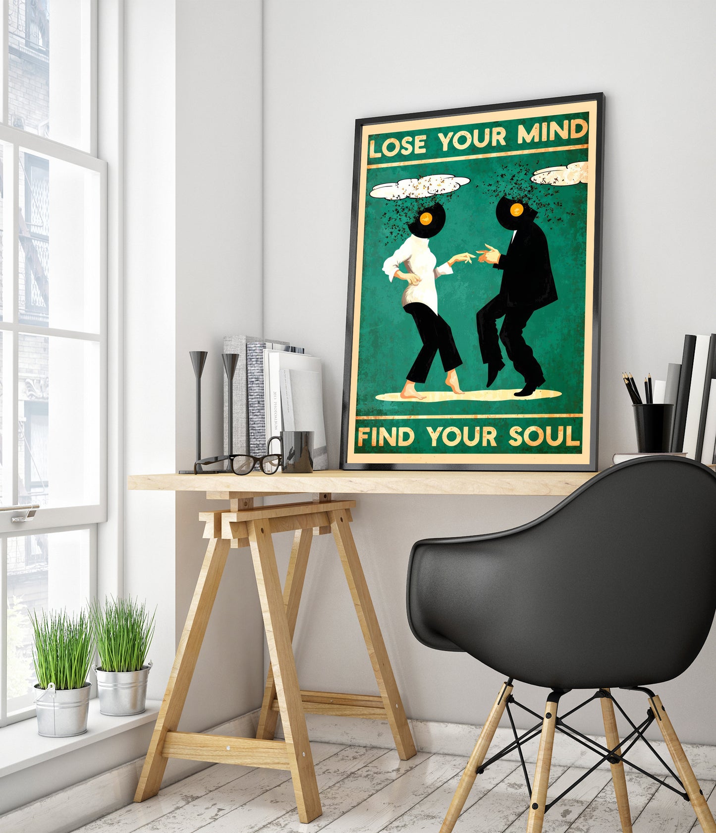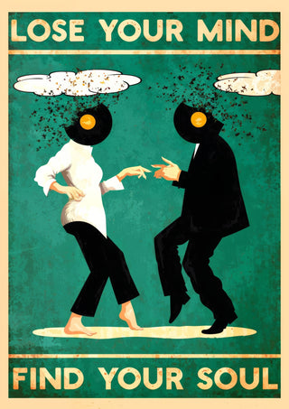 This vibrant illustration poster titled "Lose Your Mind, Find Your Soul II" features two dancing figures with vinyl records for heads, set against a bold green backdrop. Their dynamic pose captures the spirit of movement and music, while whimsical cloud elements frame the scene. The text exudes a playful yet introspective message, making it a striking piece for music and dance enthusiasts.