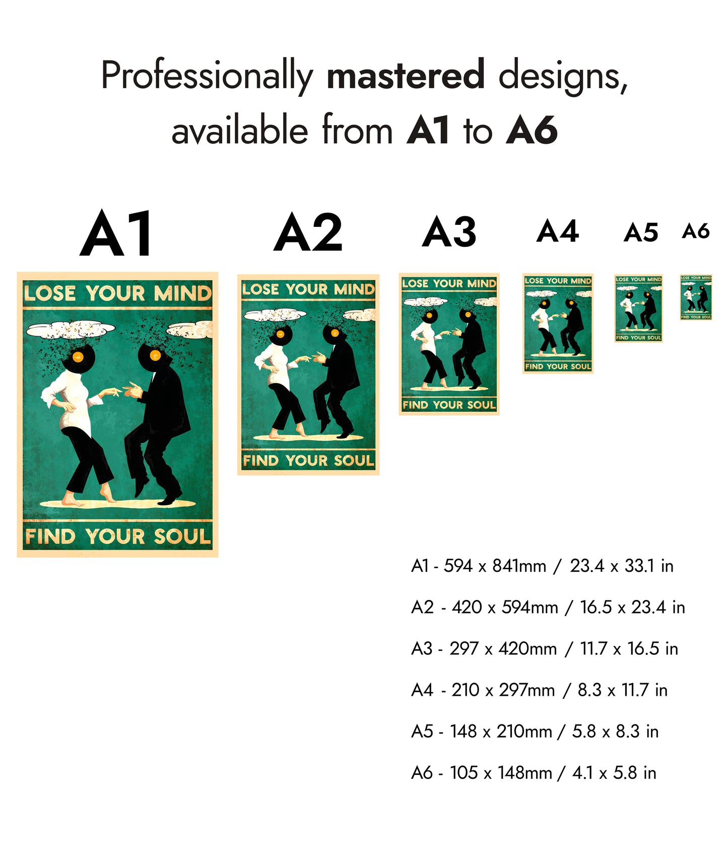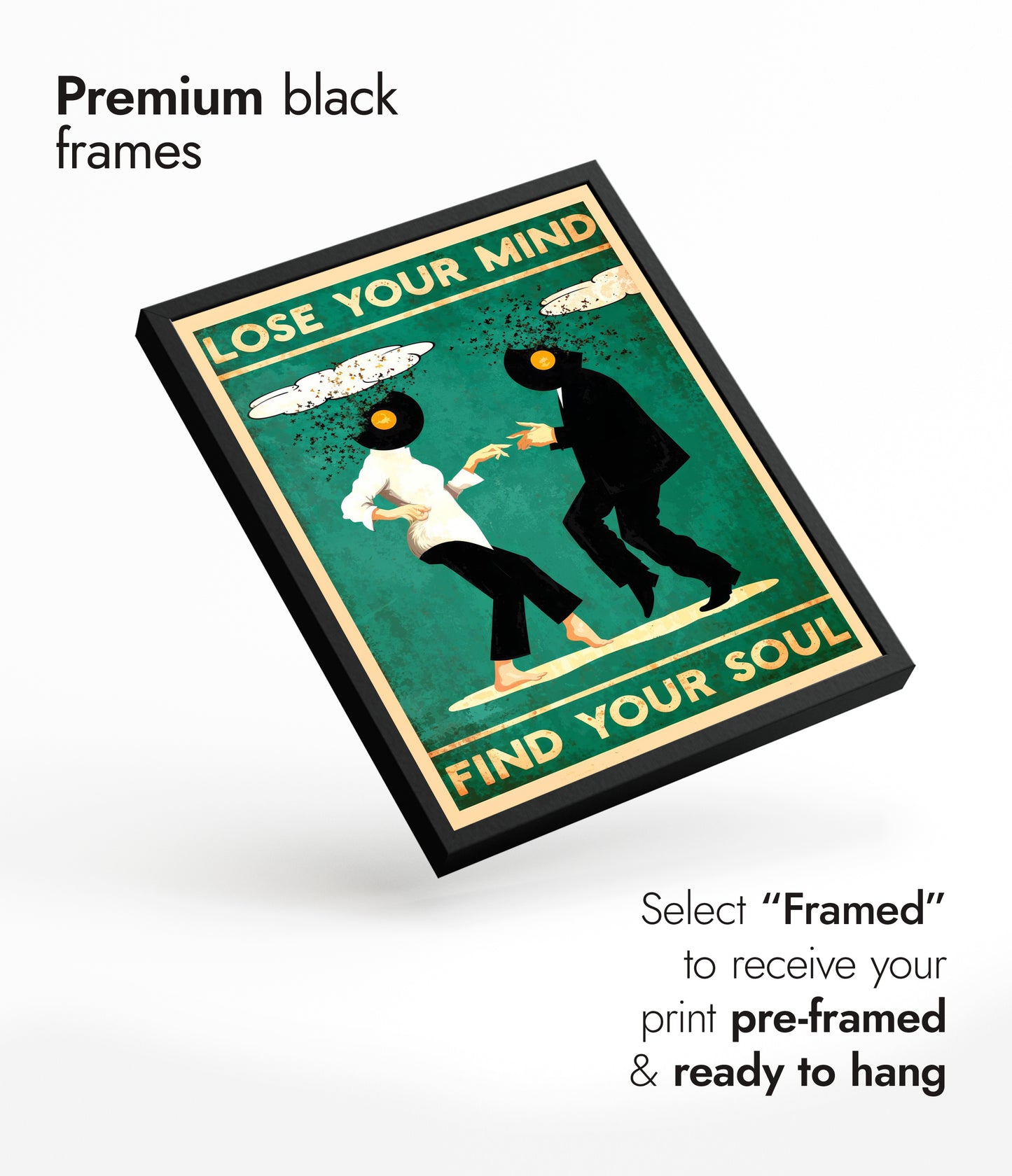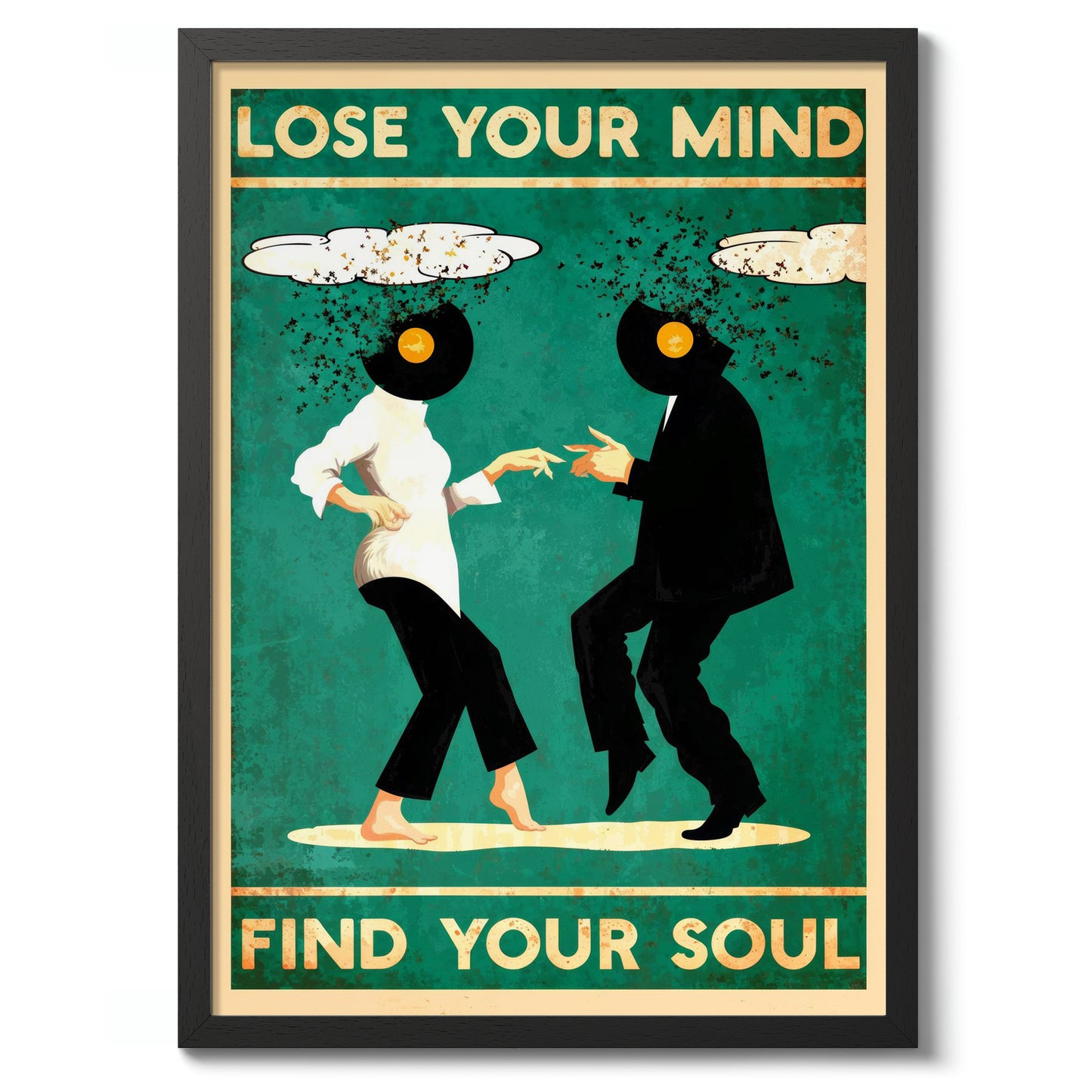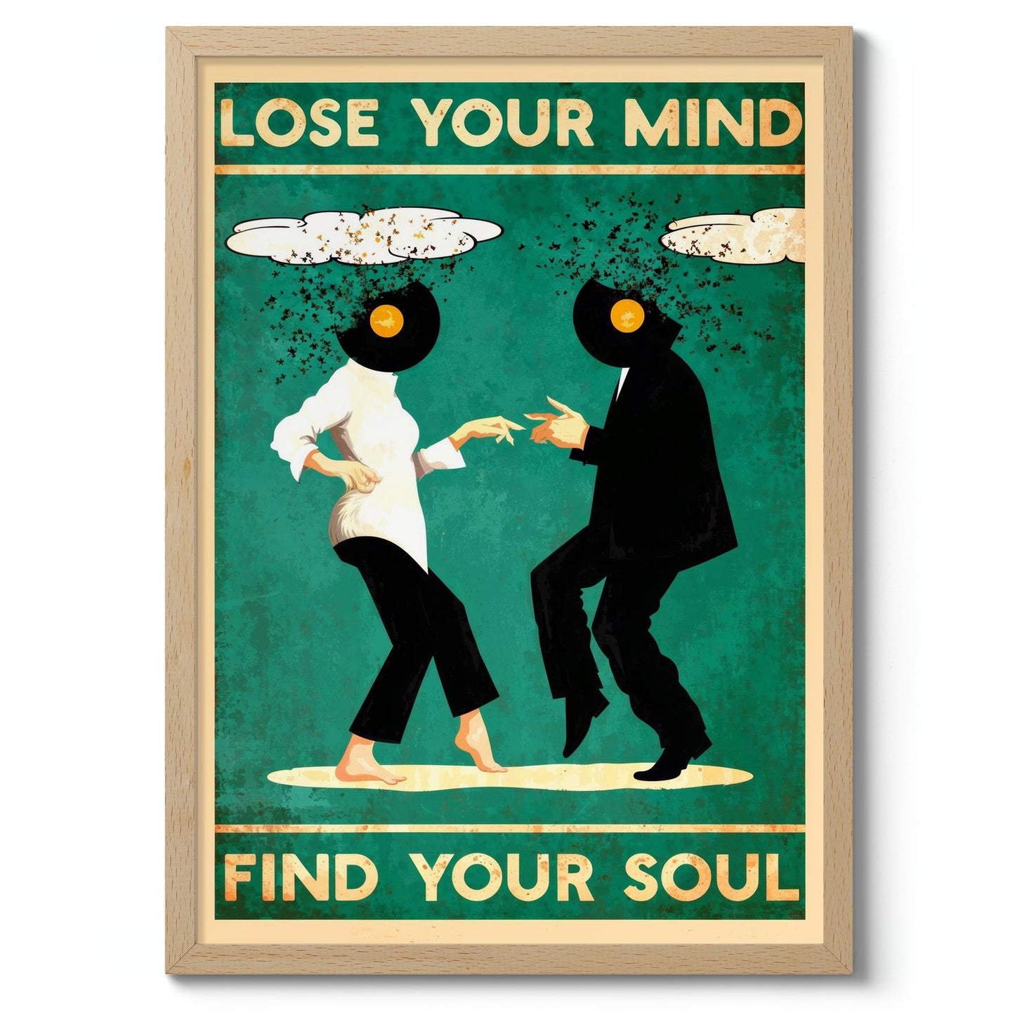 This vibrant illustration poster titled "Lose Your Mind, Find Your Soul II" features two dancing figures with vinyl records for heads, set against a bold green backdrop. Their dynamic pose captures the spirit of movement and music, while whimsical cloud elements frame the scene. The text exudes a playful yet introspective message, making it a striking piece for music and dance enthusiasts.
