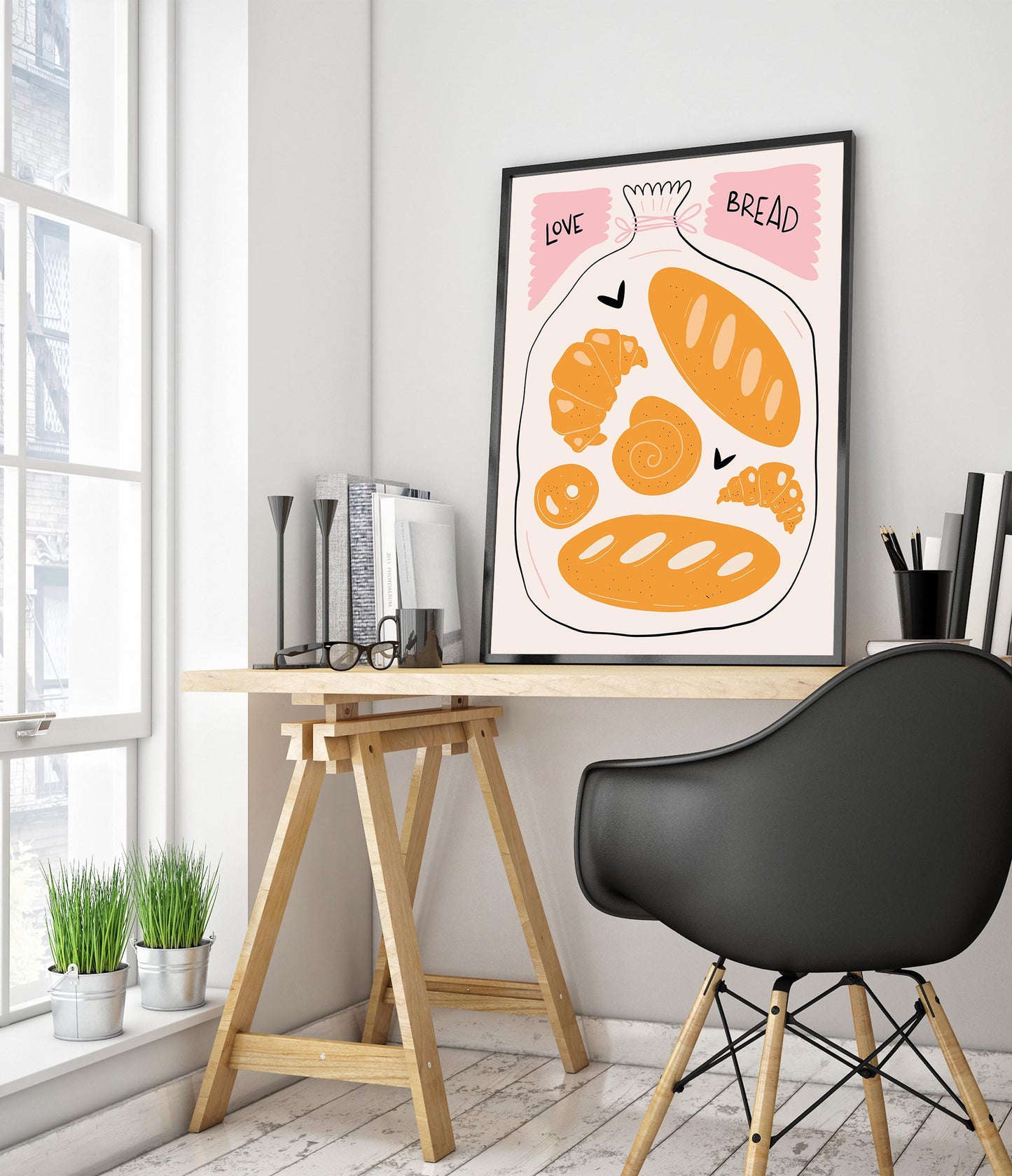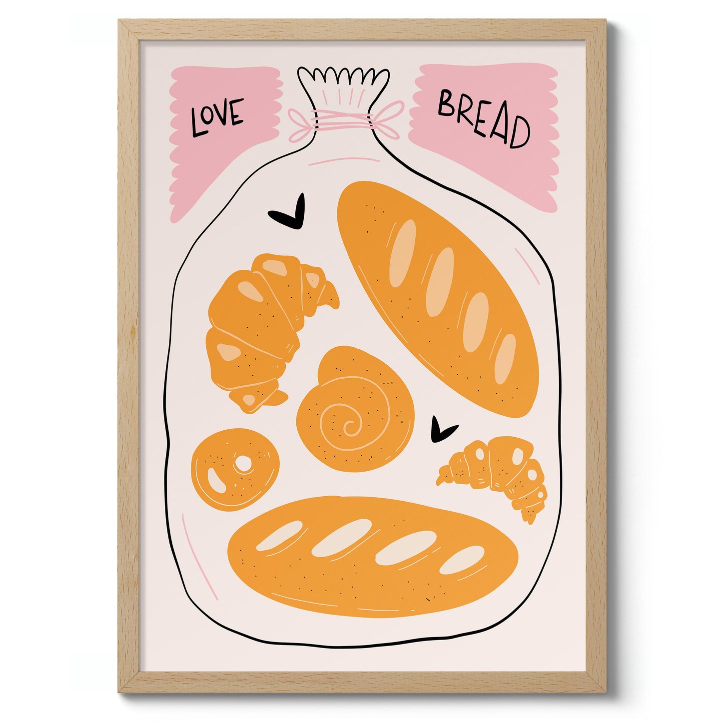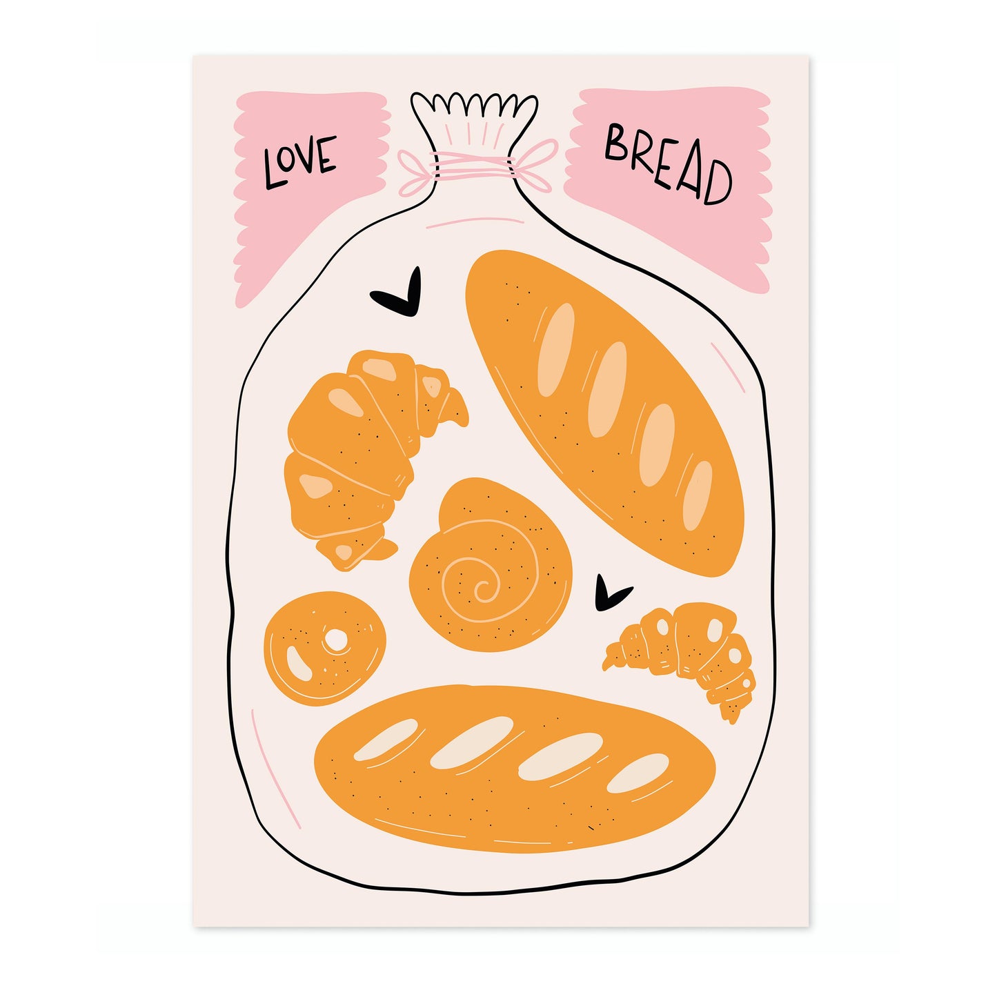 "Love Bread" poster captures a delightful modern illustration of assorted breads, enclosed in a whimsical bread bag. Featuring croissants, baguettes, and rolls in warm tones, this graphic-style poster combines culinary charm with playful artistry. Ideal for kitchens and food enthusiasts, it promotes a love for baked goods with a stylish, contemporary touch.