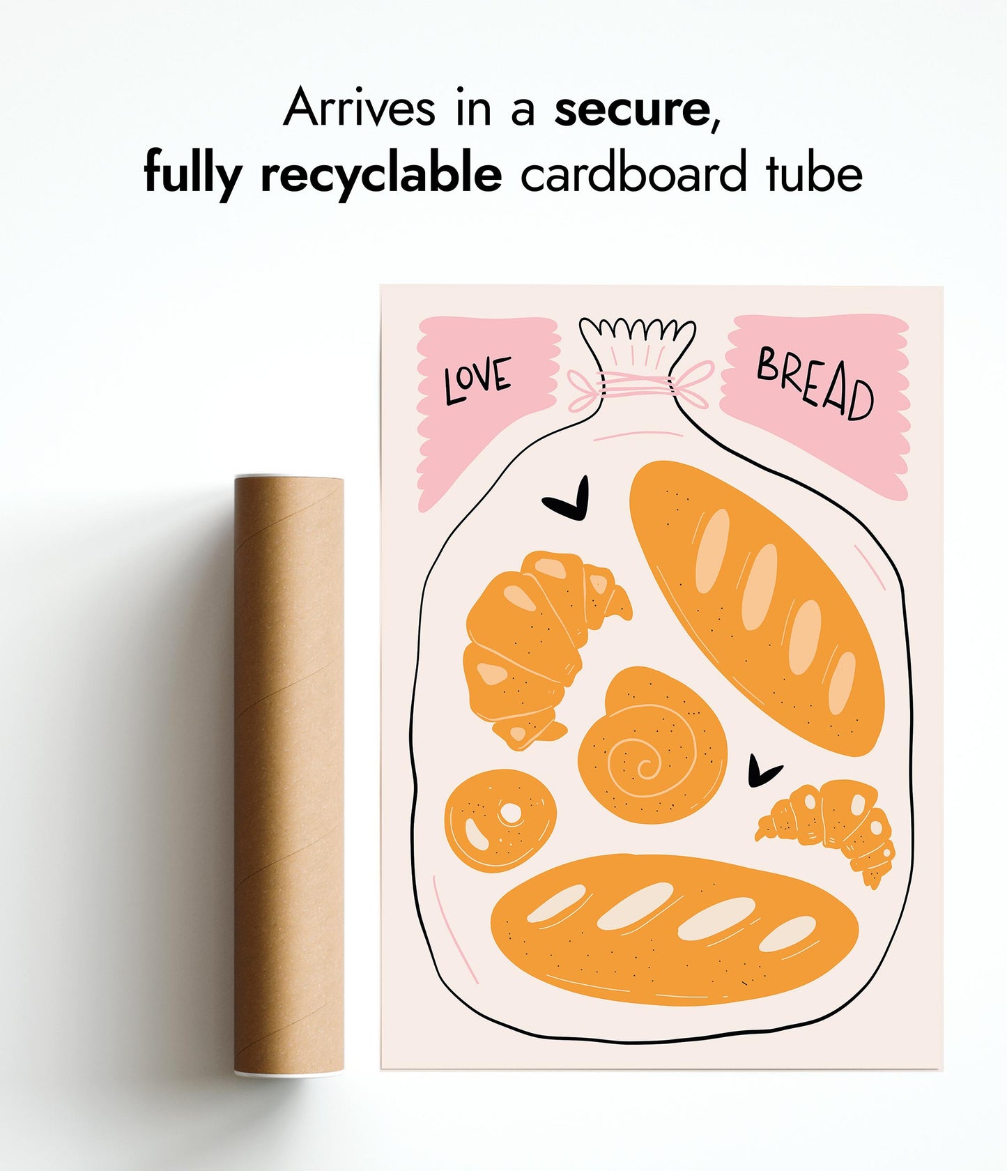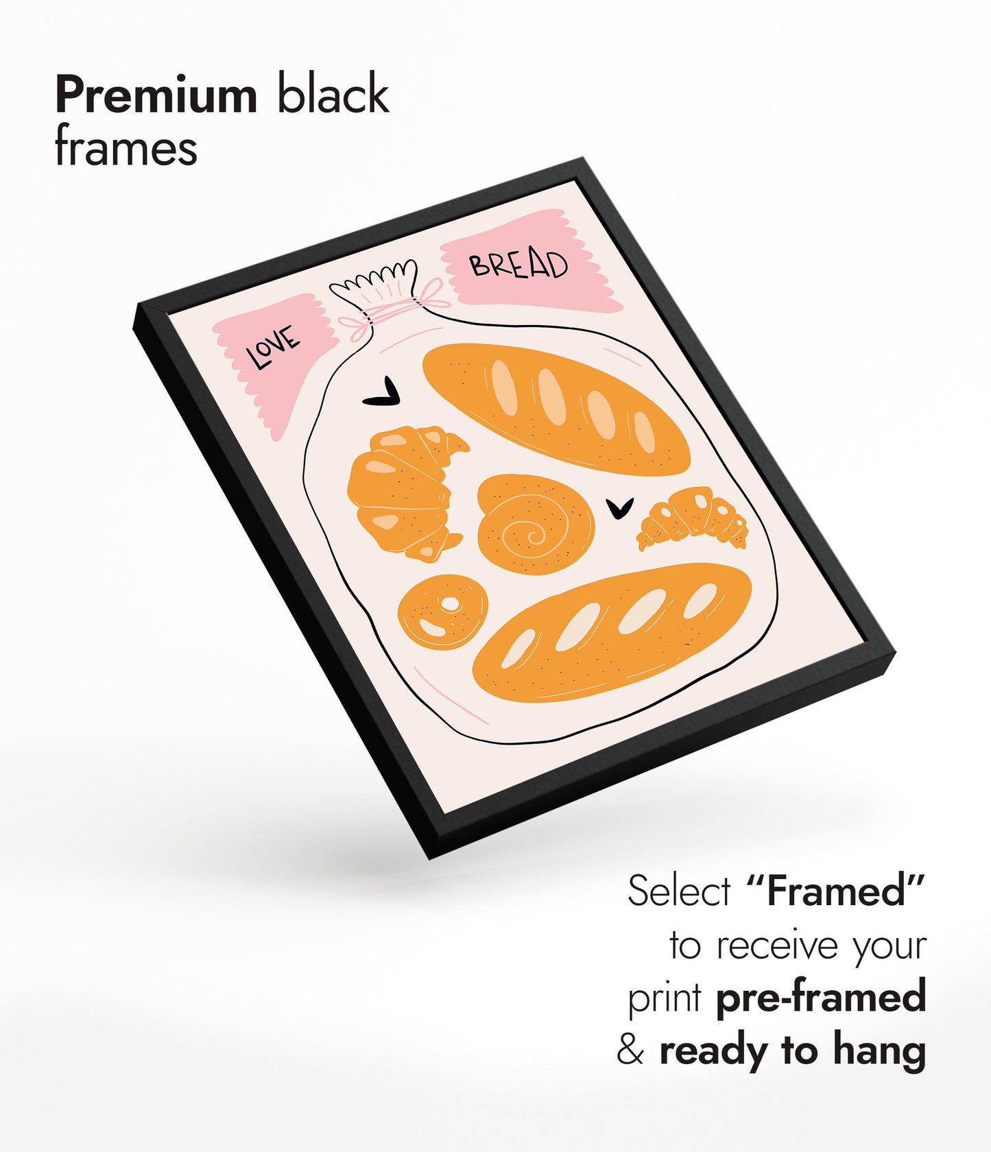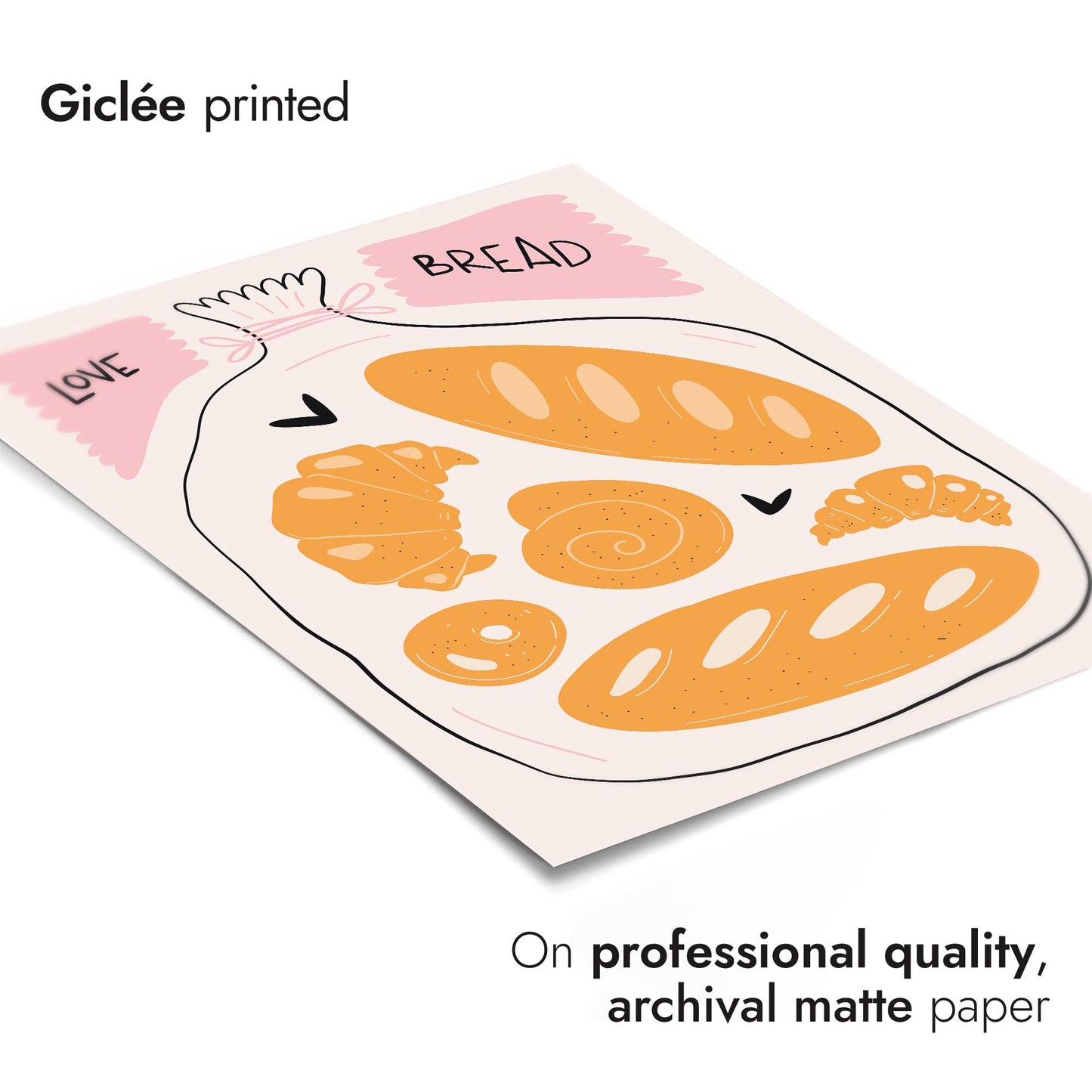 "Love Bread" poster captures a delightful modern illustration of assorted breads, enclosed in a whimsical bread bag. Featuring croissants, baguettes, and rolls in warm tones, this graphic-style poster combines culinary charm with playful artistry. Ideal for kitchens and food enthusiasts, it promotes a love for baked goods with a stylish, contemporary touch.