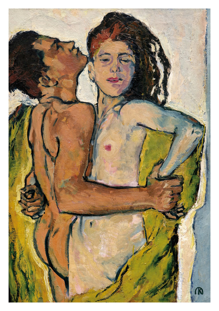 This striking art print poster, "Lovers" by Kolomon Moser, features an intimate embrace between a nude couple. Rendered in a Symbolist and Expressionist style, the painting captures deep emotion and sensuality with bold brushstrokes and vivid colours. The raw, evocative depiction of the human form makes this poster a captivating addition to any space.