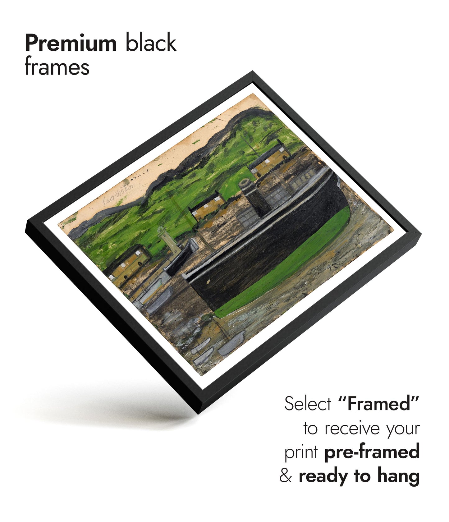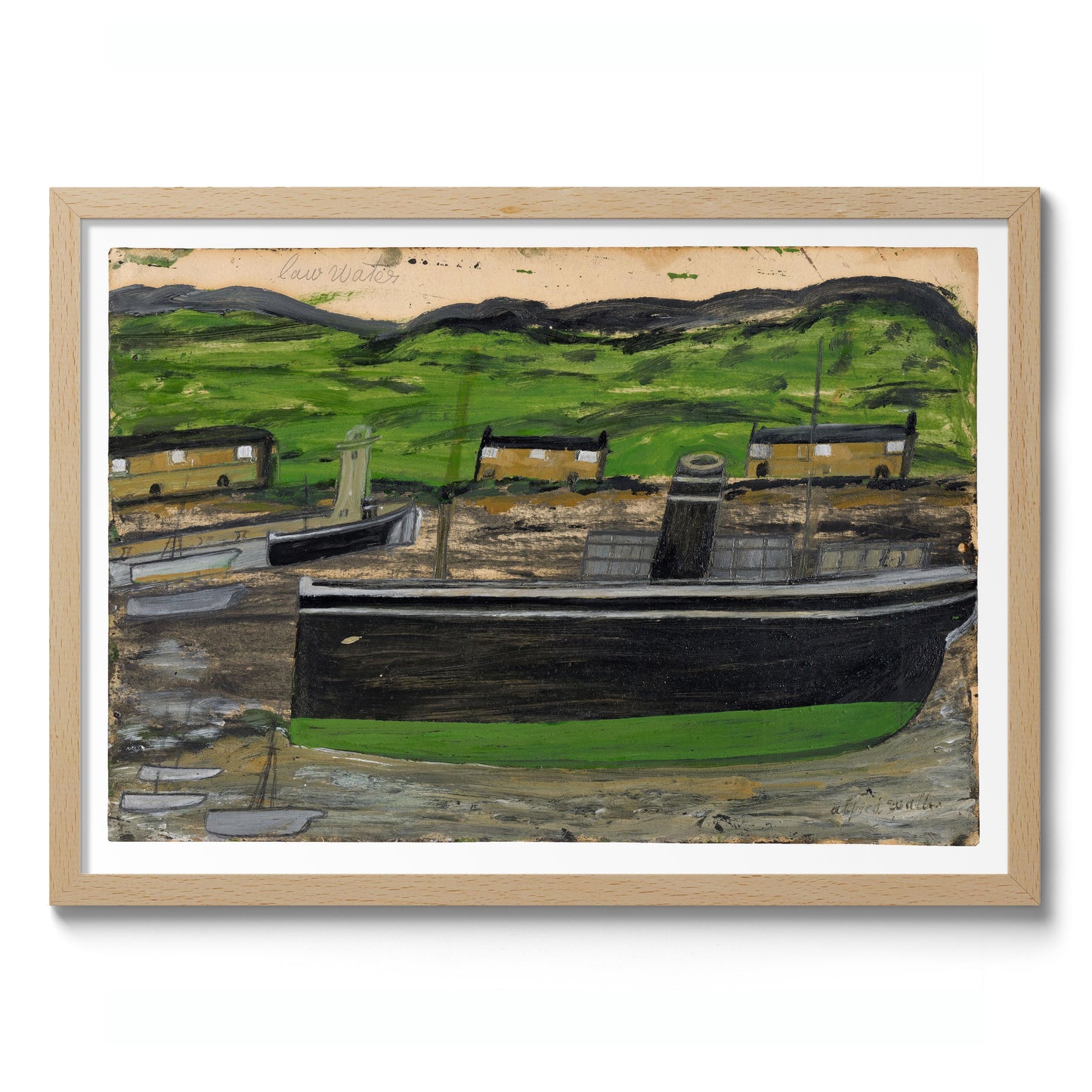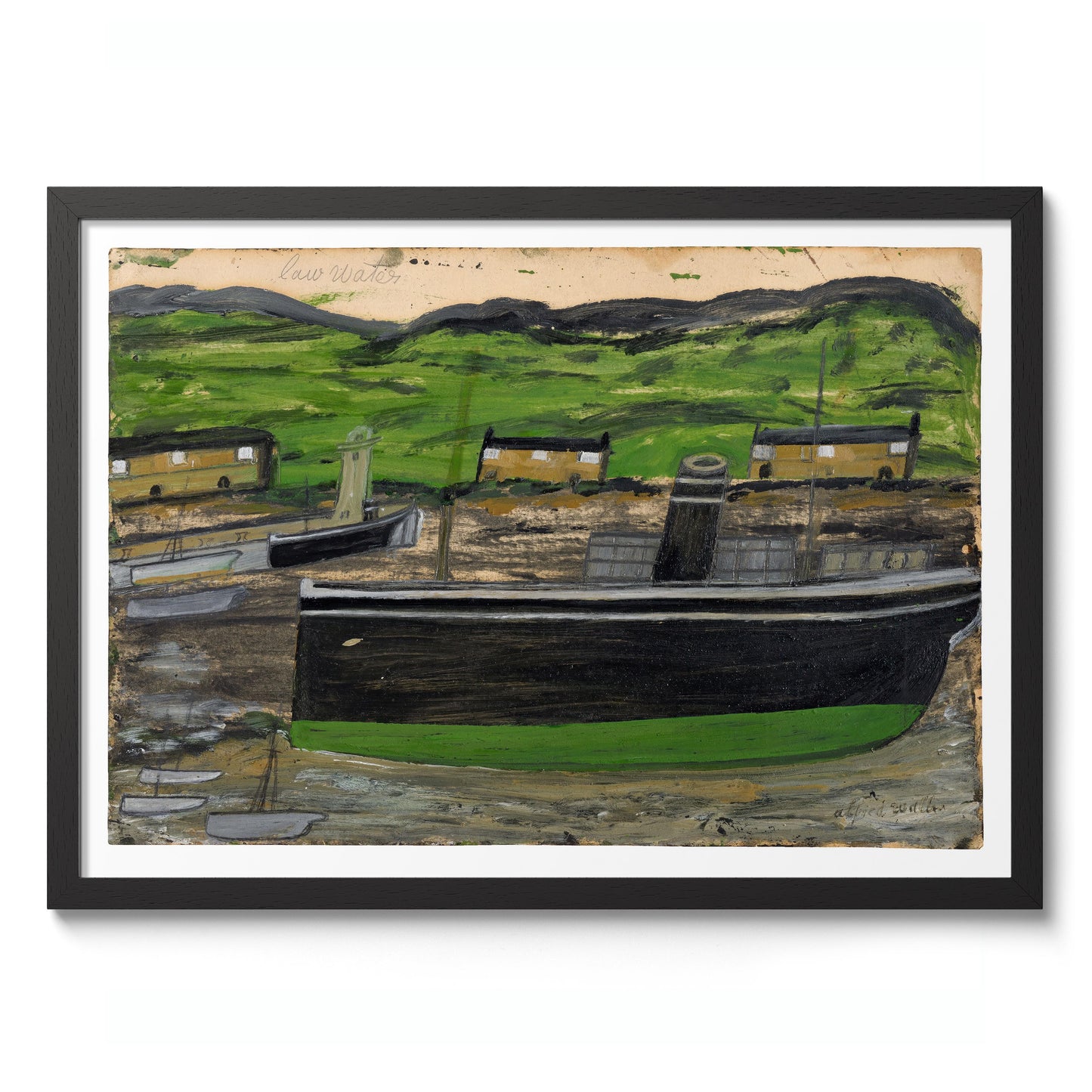 This "Low Waters" poster by Alfred Wallis showcases a charming maritime scene. Depicting a rustic black boat grounded at low tide, the artwork features a serene harbor village, lush green cliffs, and quaint houses. Ideal for fans of Primitivism and Naive styles, this landscape painting poster captures a nostalgic coastal atmosphere with meticulous detail. Perfect addition to any maritime art collection.