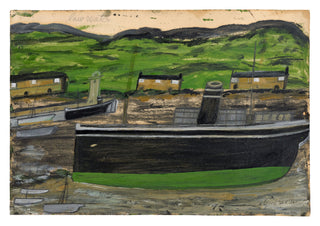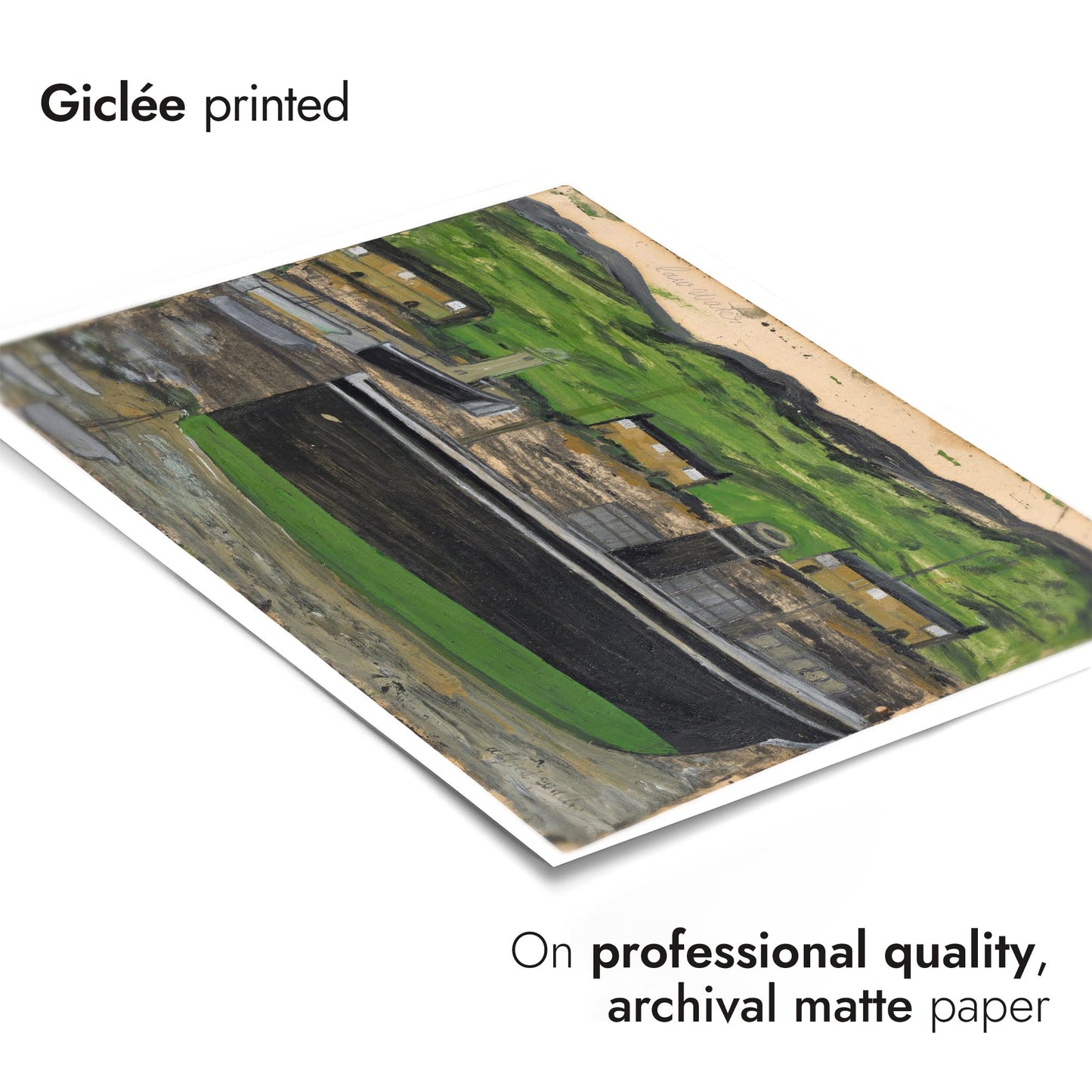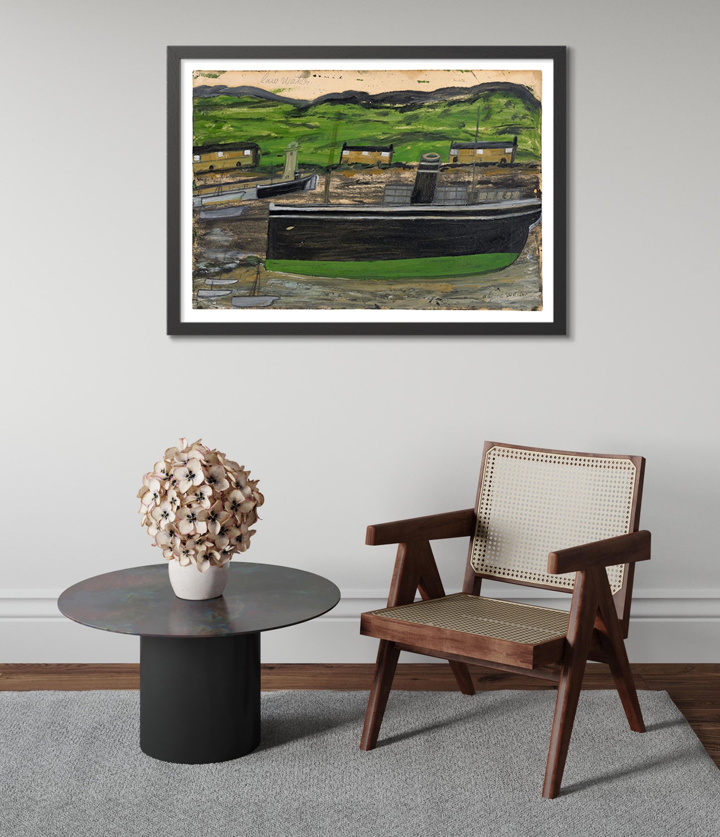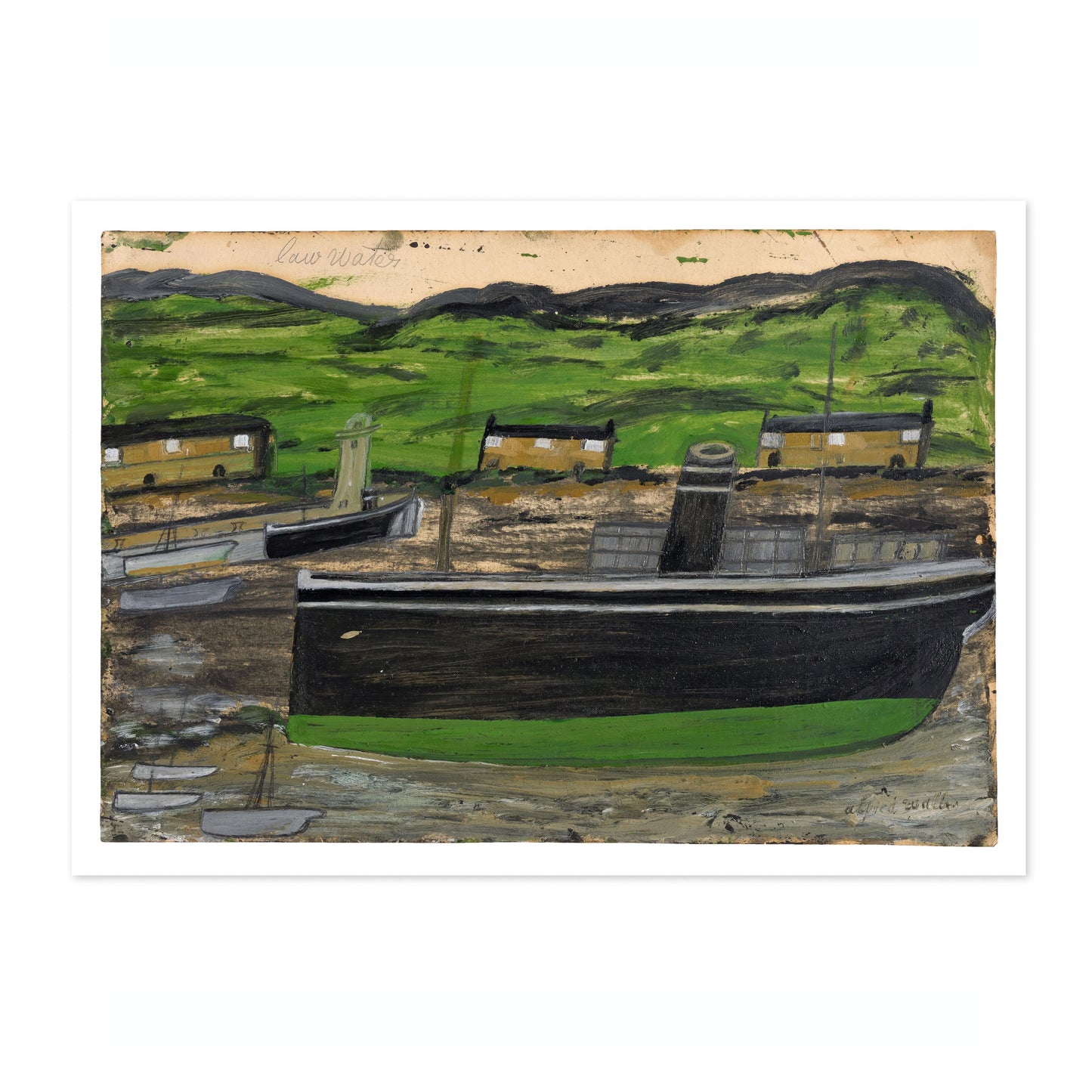 This "Low Waters" poster by Alfred Wallis showcases a charming maritime scene. Depicting a rustic black boat grounded at low tide, the artwork features a serene harbor village, lush green cliffs, and quaint houses. Ideal for fans of Primitivism and Naive styles, this landscape painting poster captures a nostalgic coastal atmosphere with meticulous detail. Perfect addition to any maritime art collection.