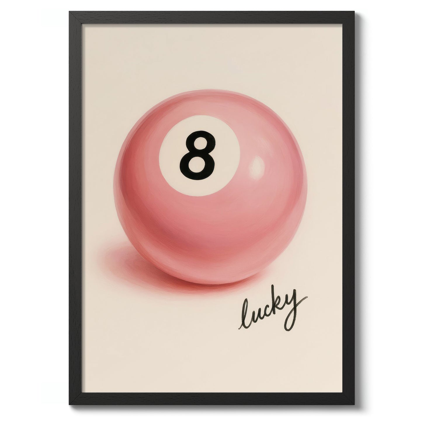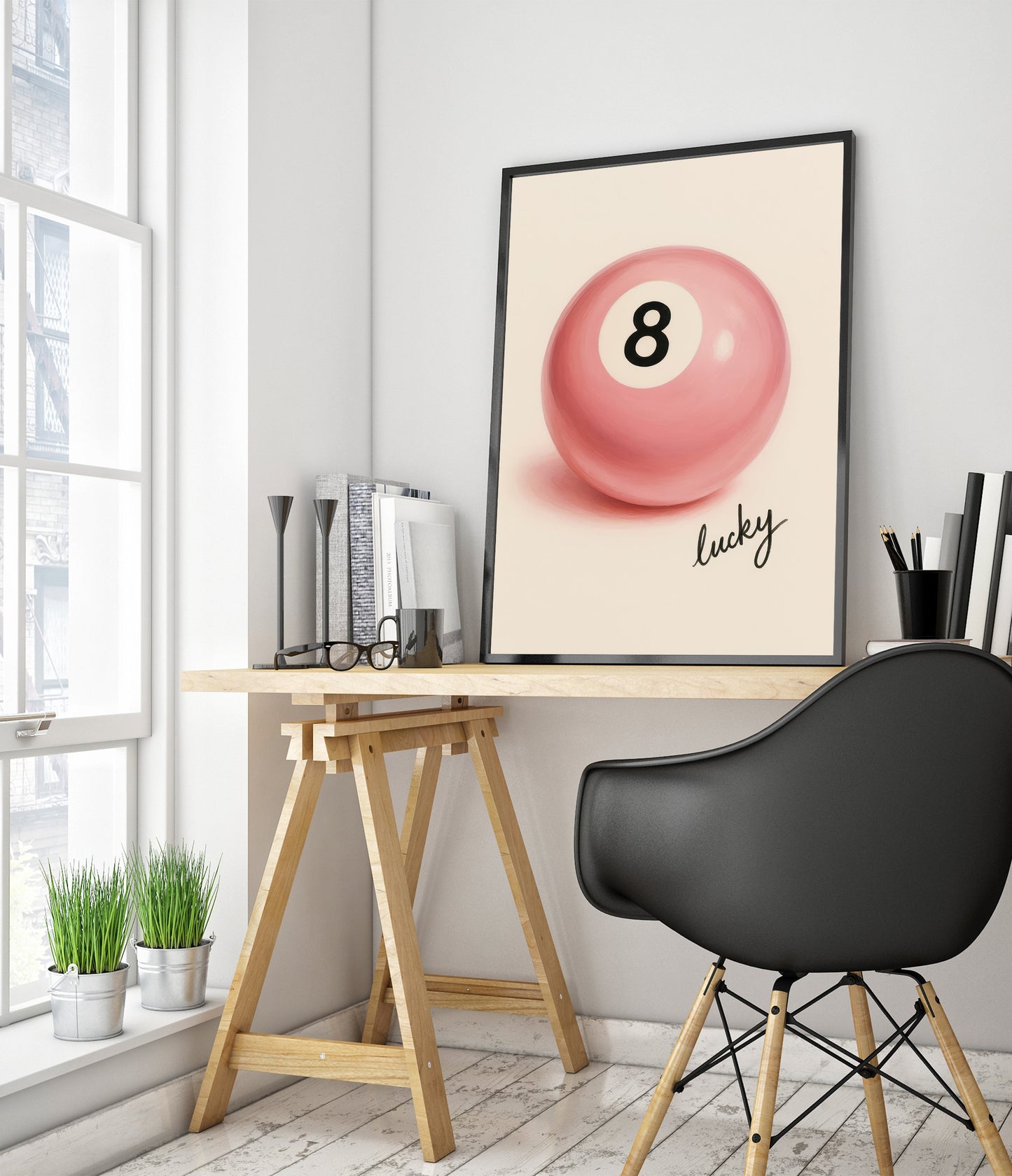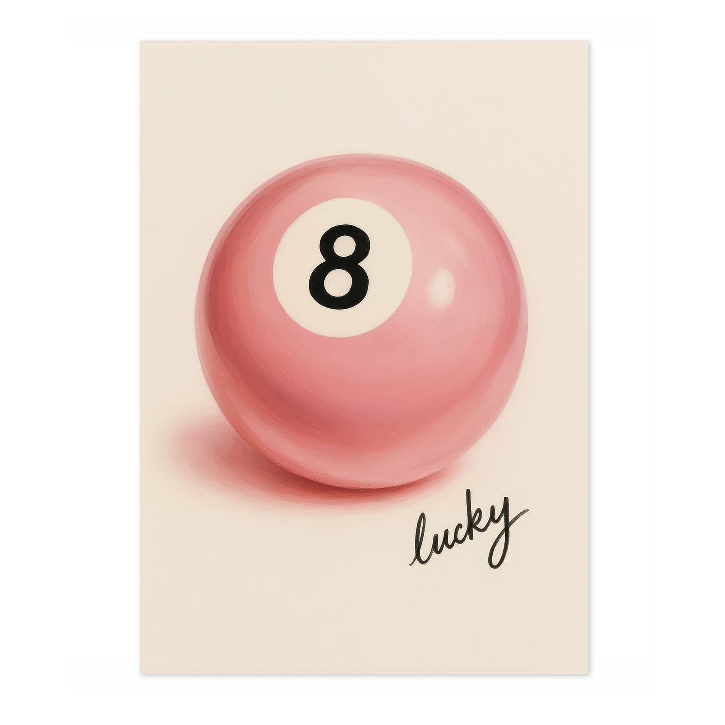 The "Lucky 8" poster features a vibrant pink 8-ball set against a neutral backdrop, with the word "lucky" elegantly scripted beneath. This graphic, typographic art piece creatively combines themes of luck and billiards, showcasing its playful, inspiring message. Ideal for adding a touch of whimsical charm to interiors, this art print seamlessly complements modern and eclectic décor styles.