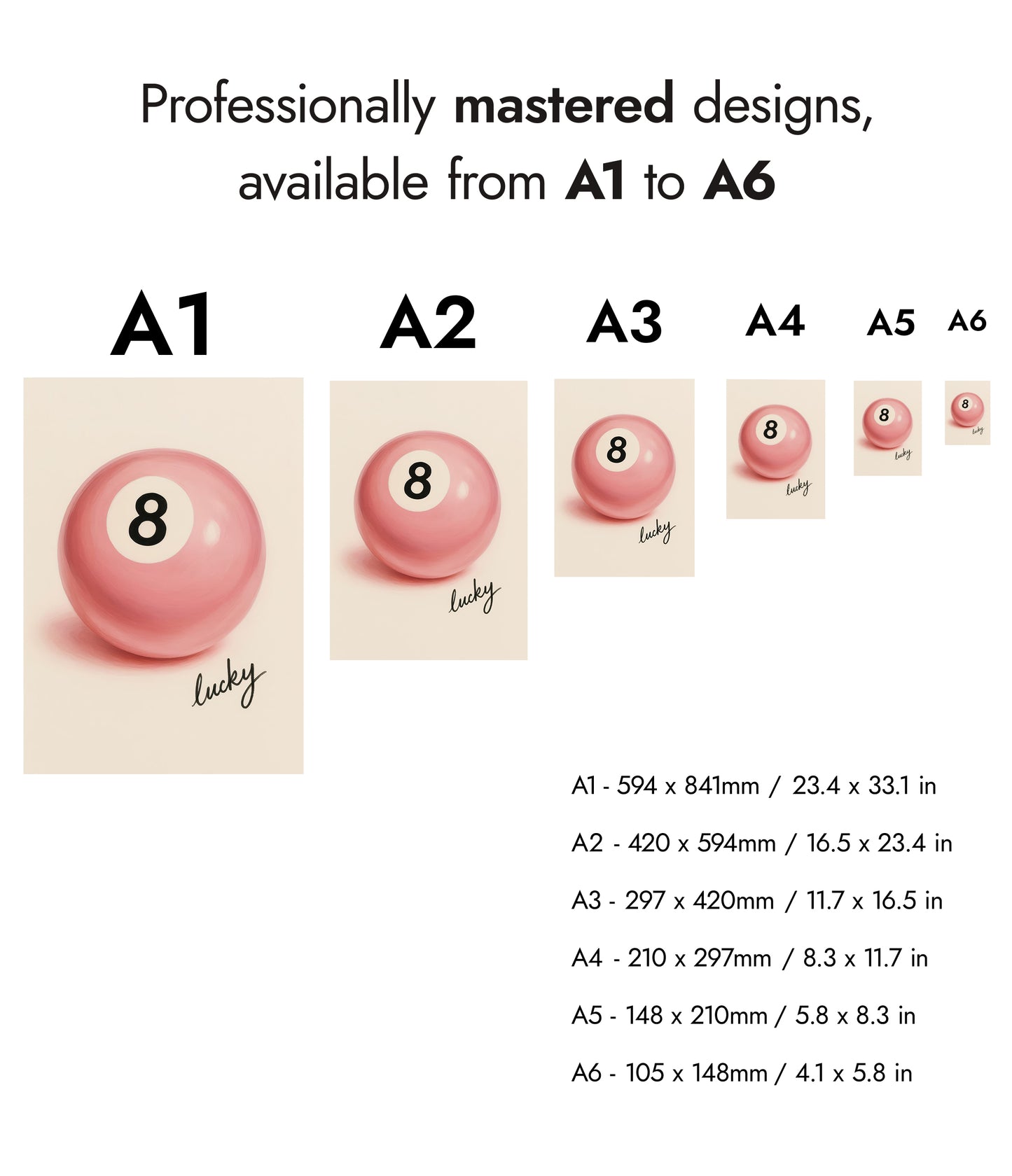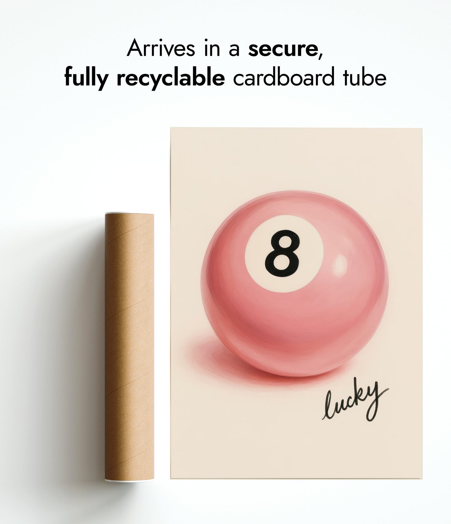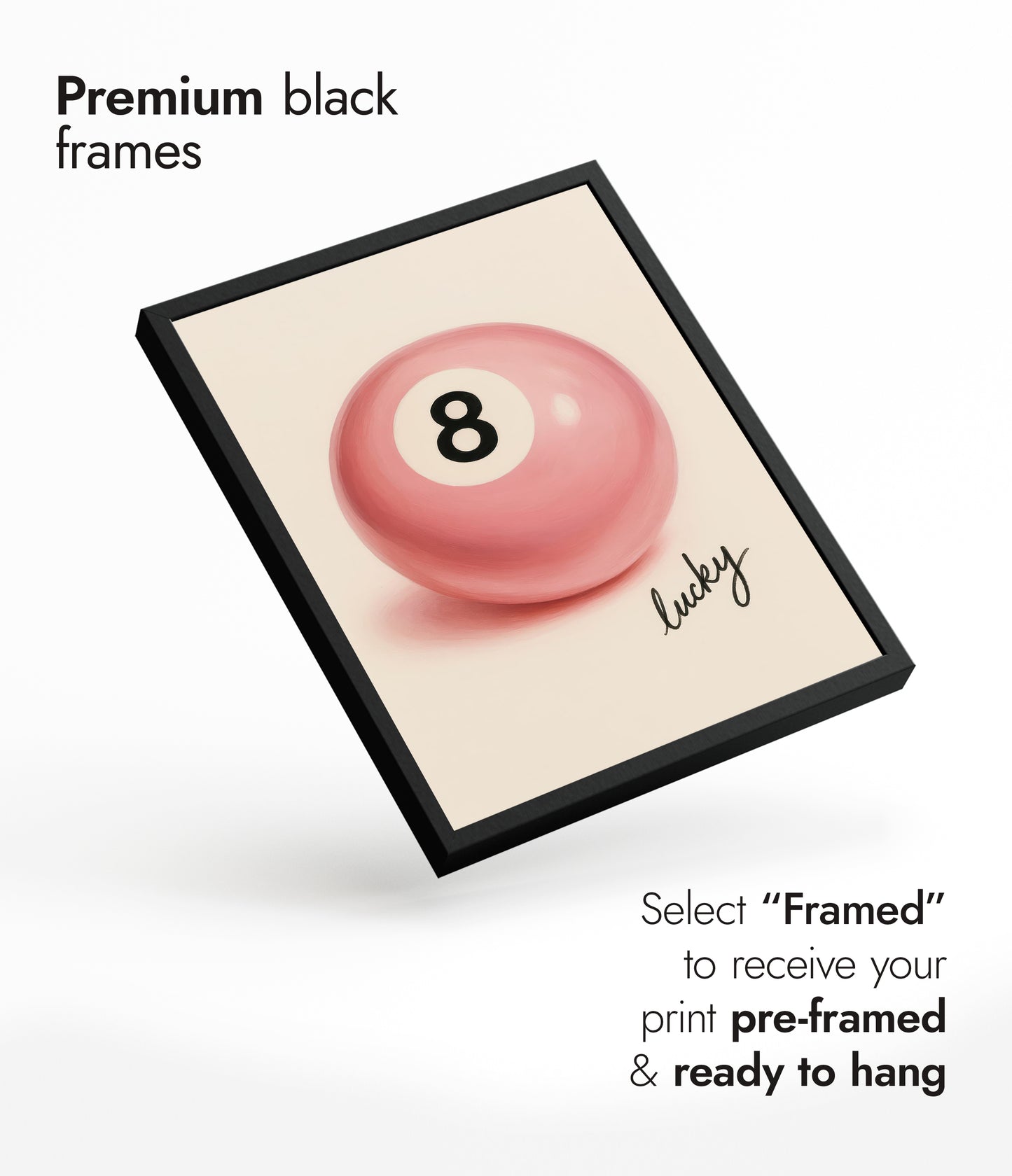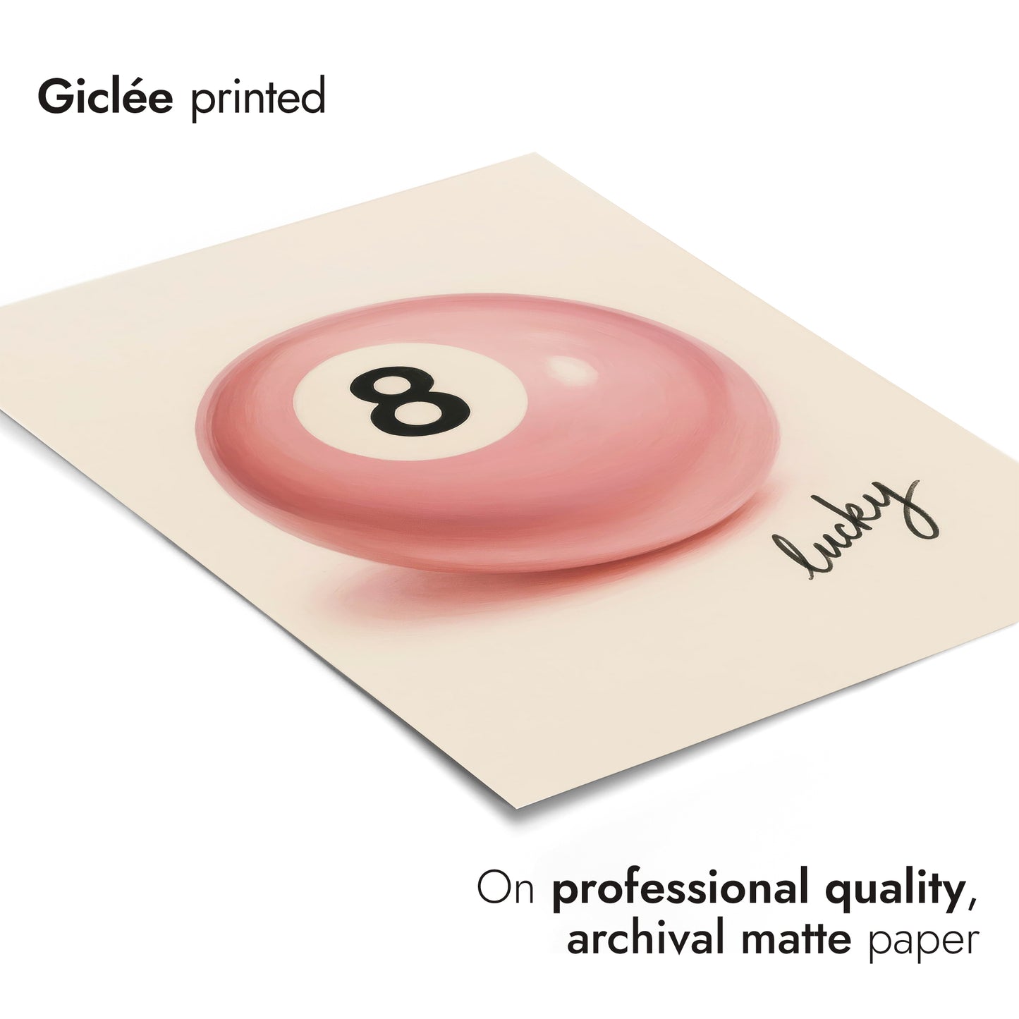 The "Lucky 8" poster features a vibrant pink 8-ball set against a neutral backdrop, with the word "lucky" elegantly scripted beneath. This graphic, typographic art piece creatively combines themes of luck and billiards, showcasing its playful, inspiring message. Ideal for adding a touch of whimsical charm to interiors, this art print seamlessly complements modern and eclectic décor styles.