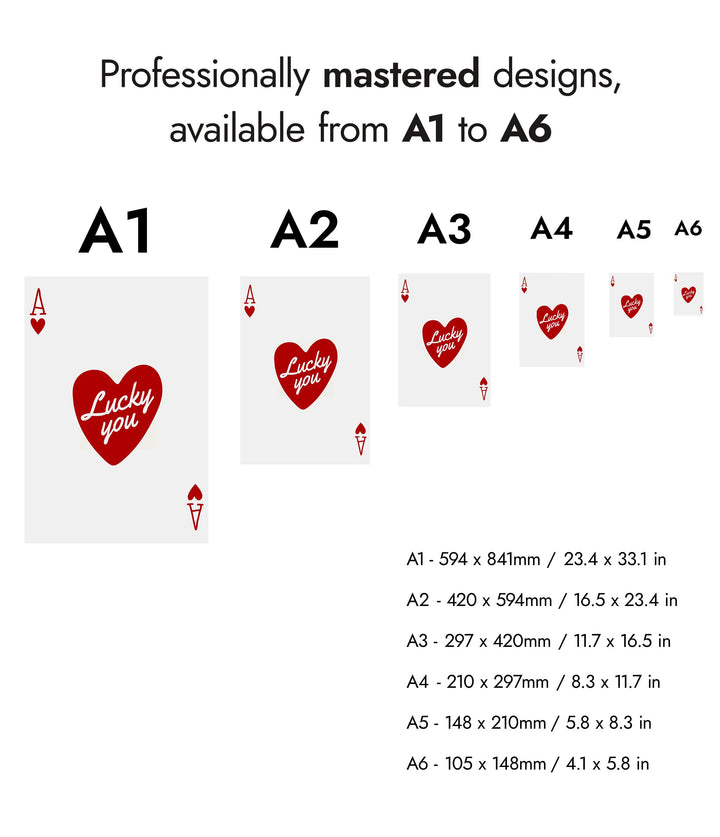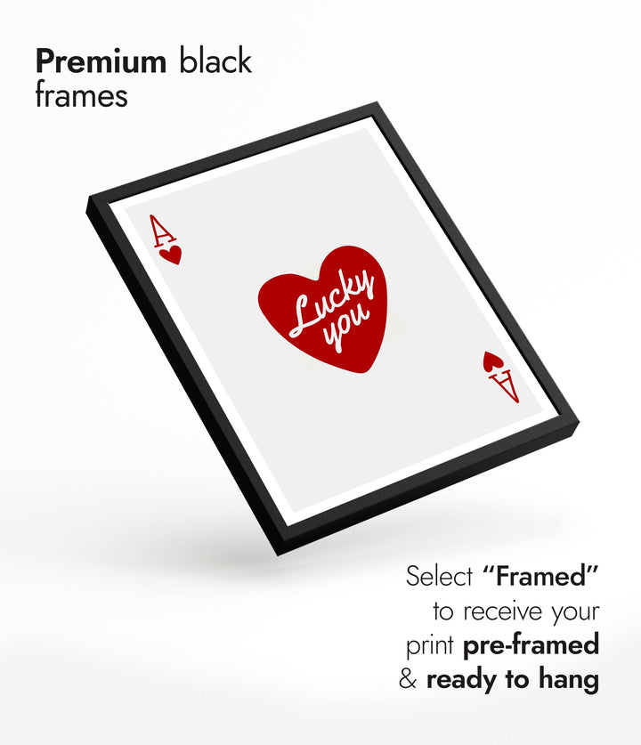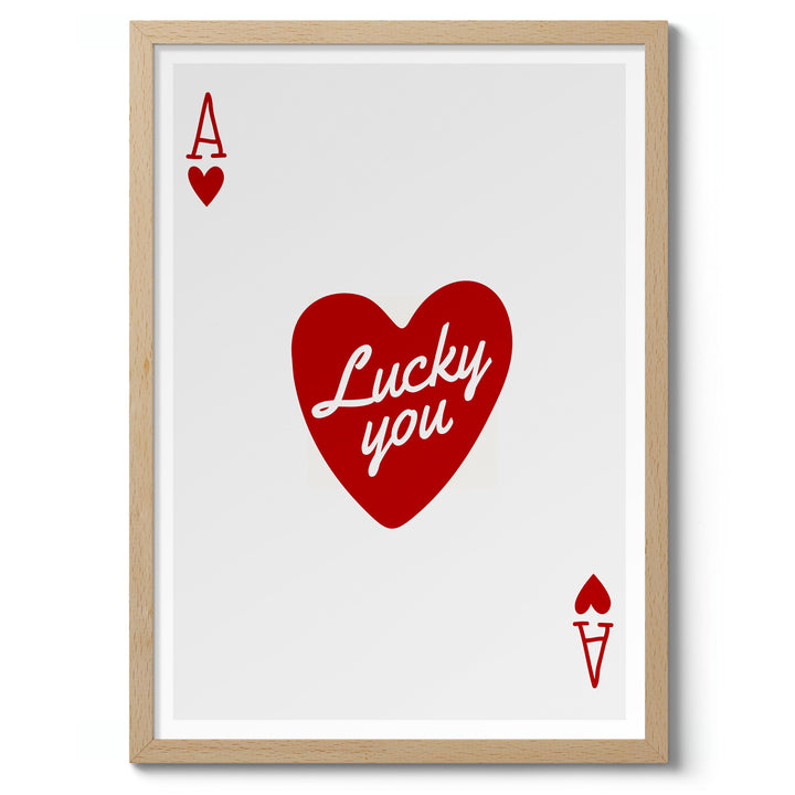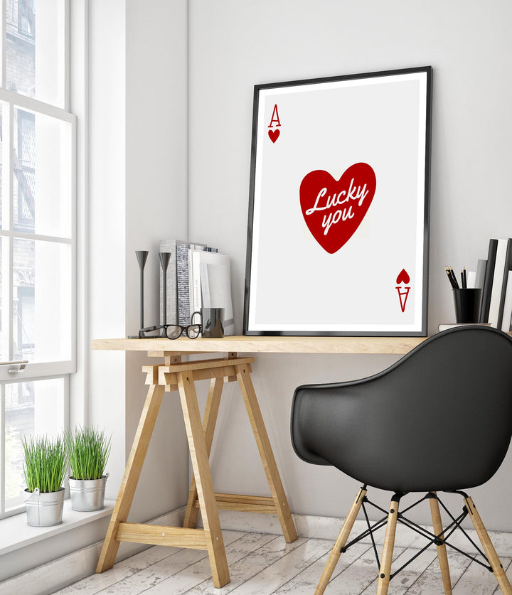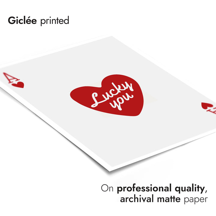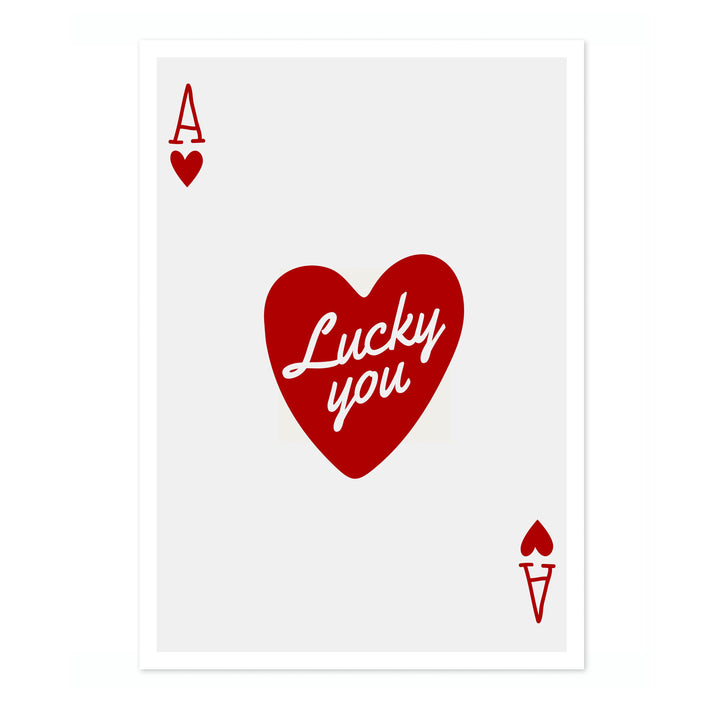 This "Lucky You" poster features a minimalist design with a red heart and the phrase "Lucky you" centered on an Ace of Hearts playing card. The clean white background and bold typography create a modern look, making it an eye-catching wall decor. Ideal for lovers of graphic art, card games, and casino themes. Perfect as a stylish portrait piece.