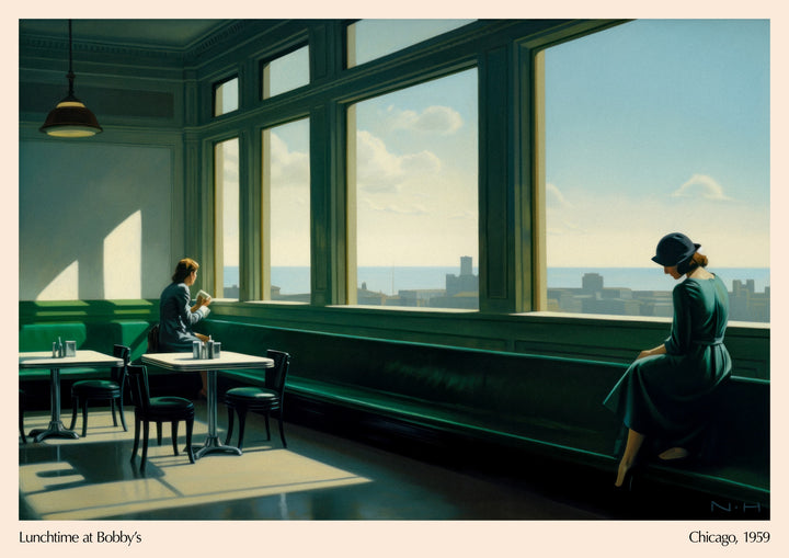 "Lunchtime at Bobby's" by Ned Hare captures a serene Chicago restaurant in 1959. This realism poster portrays a sunlit interior with two patrons, bathed in soft light, sitting by large windows that offer a calm view of the sky and sea. Ideal for fans of cityscapes and mid-century settings, this piece beautifully captures a quiet moment in urban life.